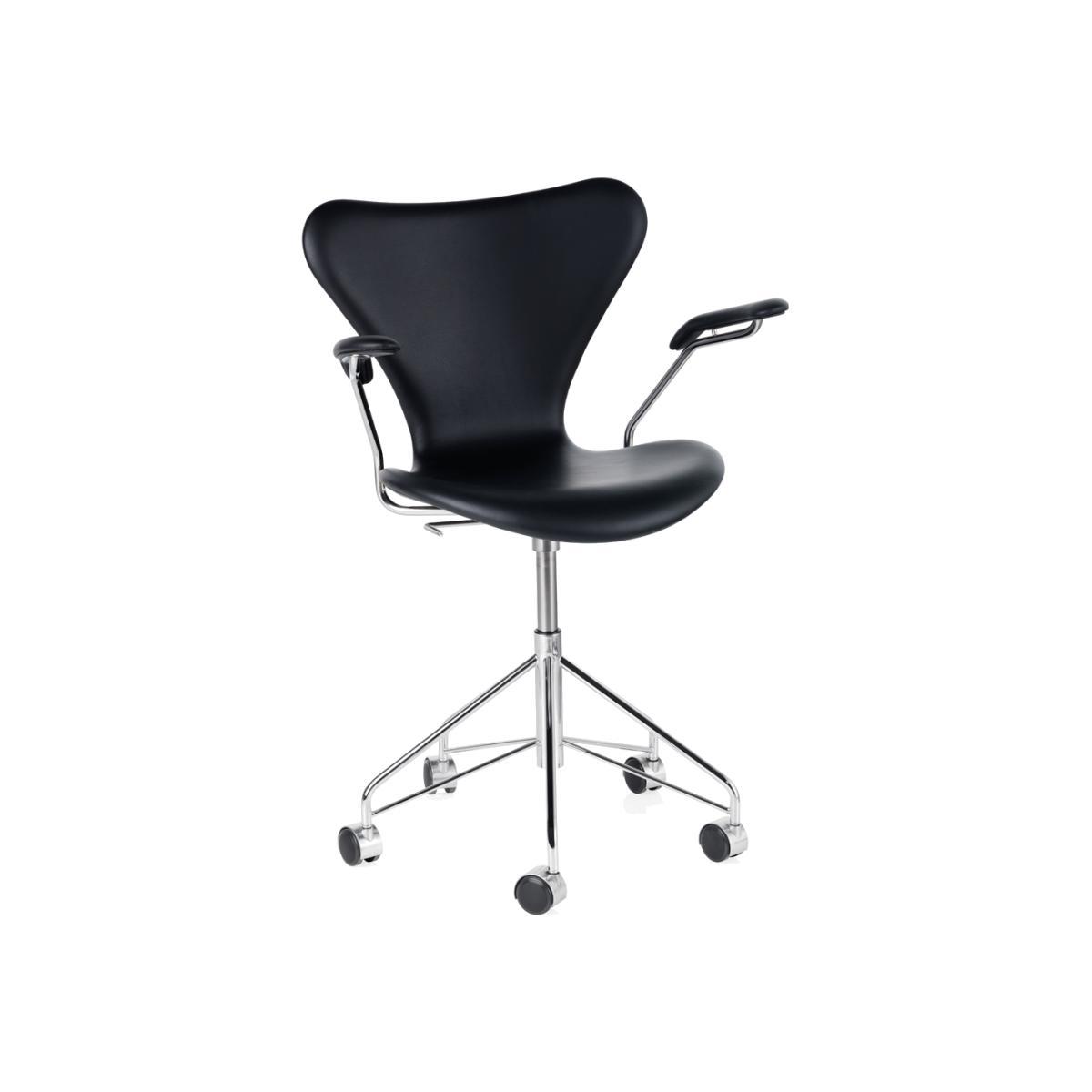 Enhance your interior with the striking silhouette of the swivel-based Series 7 3217 Swivel Chair upholstered in supple black Essential leather, designed in 1955 by Arne Jacobsen, and produced by prestigious manufacturers Fritz Hansen. The Series 7 Chair showcases one of the most iconic silhouettes in furniture history, with its signature curved backrest an instantly recognisable feature of Modernist mid-century furniture design, renewed with supple black Essential leather upholstery for a timeless finish. Fritz Hansen's bestselling chair, the composition of the Series 7 represents the culmination of the then revolutionary lamination technique, with its pressure moulded plywood frame crafted to showcase the many possibilities of lamination. Elevated on a height-adjustable swivel base with castors, and available in a variety of finishes, the Series 7 Swivel Chair with black Essential leather upholstery remains a timeless example of Modernist furniture design. View our entire range of furniture and lighting from Arne Jacobsen