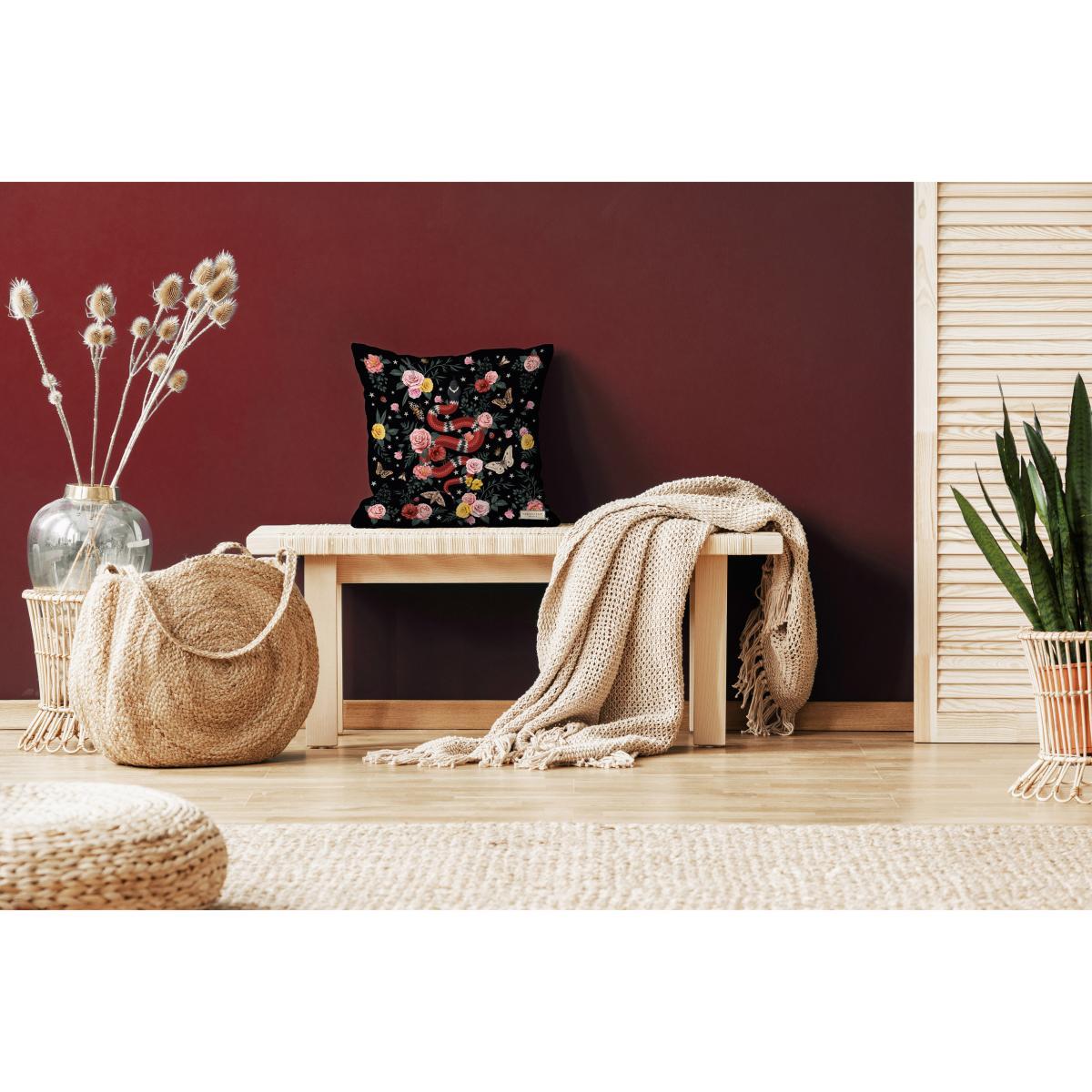 This snake-themed cushion adds a bold, eclectic touch to any space, making it ideal for interiors that embrace colour and personality. I love its rich velvet texture, which offers both visual softness and a sense of luxury, perfect for sofas or armchairs in living rooms that aim for an eclectic or bohemian vibe. To style it effectively, pair it with more muted or solid cushions to let the design stand out, or use it as a statement piece against neutral tones to really make it pop. Its playful yet sophisticated design works well in contemporary, maximalist, or even vintage-inspired interiors, adding a quirky and fashionable edge. Practical styling tips include placing it to anchor larger cushions or use multiple patterned pieces in the same colour palette for a cohesive look.