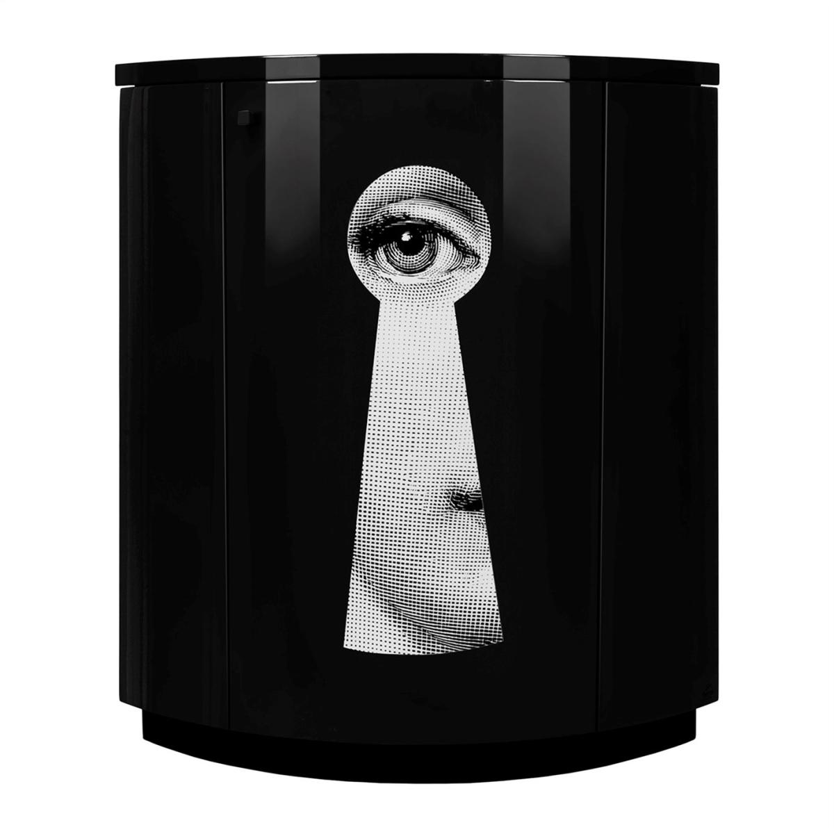 Add some drama to your home design with this Serratura corner cabinet from Fornasetti. Expertly handcrafted in Italy, this cabinet is fabulous for compact spaces thanks to its corner slotting shape. Available in lacquered red or black, it's decorated with a striking keyhole design with Fornasetti icon Lena Cavalieri's face peering through.