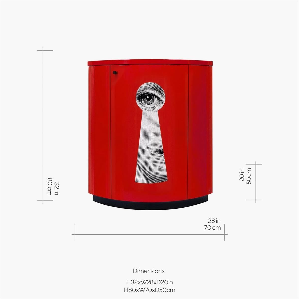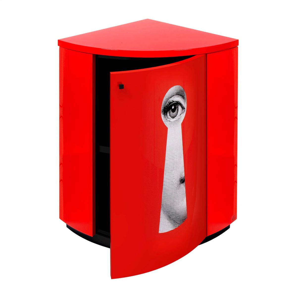 Add some drama to your home design with this Serratura corner cabinet from Fornasetti. Expertly handcrafted in Italy, this cabinet is fabulous for compact spaces thanks to its corner slotting shape. Available in lacquered red or black, it's decorated with a striking keyhole design with Fornasetti icon Lena Cavalieri's face peering through.