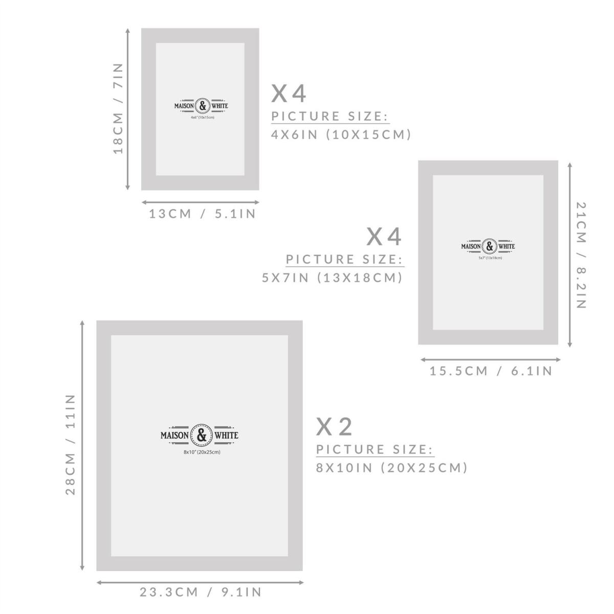 Displaying our favourite photos and memories around our home or office is the perfect way to remember the best moments so we want those times to be shown perfectly. This Set of 10 Assorted Photo Frames from Maison & White is the ideal way of adding a customized gallery wall to your home. The set includes 3 different sized frames. You will receive 4 smaller frames, 4 medium frames and 2 larger frames, giving you a variety of different displaying options for your photographs. The different sizes provide you with many possibilities for customising the walls, tables and windowsills around your home. Please note the transparent photo cover is made from Perspex. Peel off the protective film from both sides before displaying.
