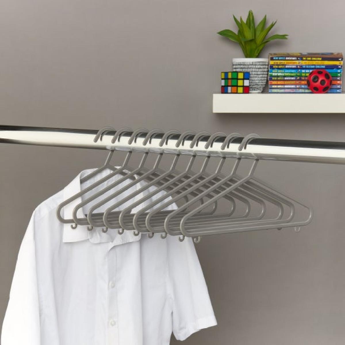 * With skirt and garment hooks * Slim space saving design * Available in other colours Keep kids’ clothes neat and tidy with this set of 10 plastic hangers. Designed with a slim, space saving shape and handy skirt and garment hooks, they’re perfect for everyday use. Available in a range of colours to suit any style, these durable hangers make organising little wardrobes simple and cheerful.