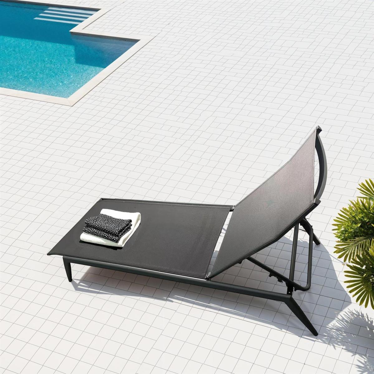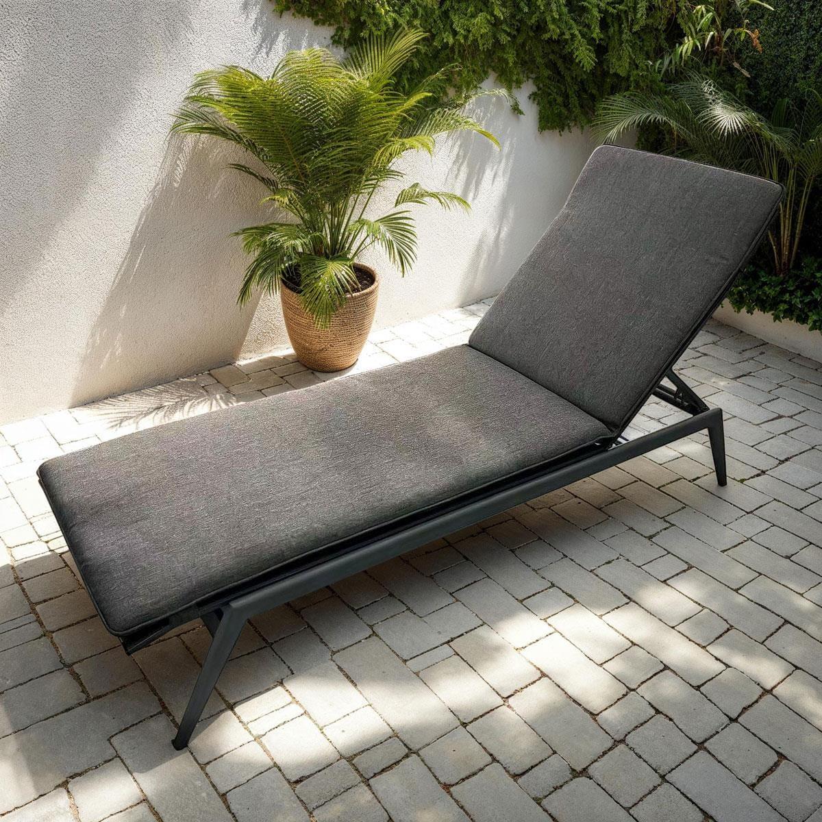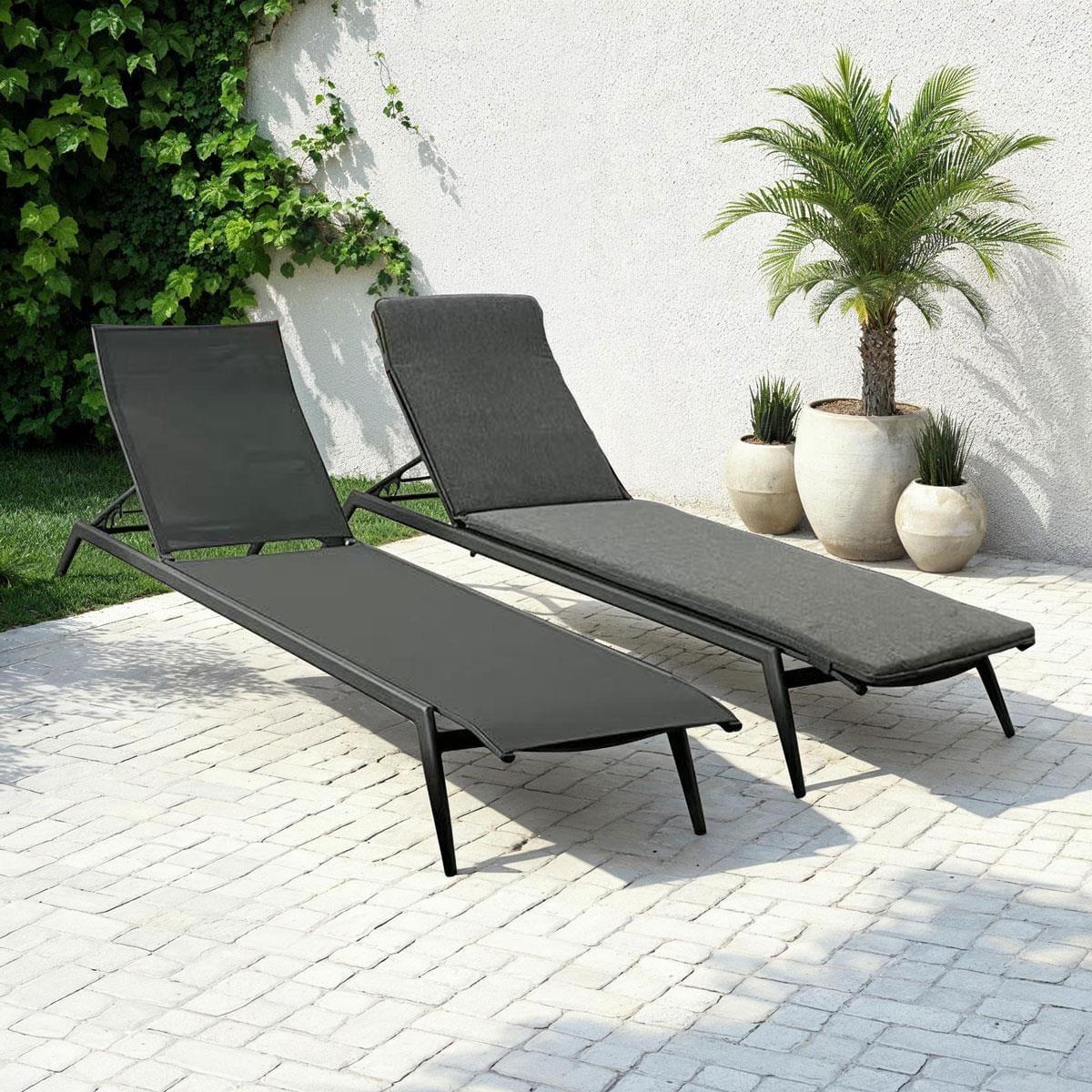 Upgrade your outdoor space with these 2 sleek aluminium metal sun loungers. Featuring a charcoal grey frame with a premium powder-coated finish. The garden loungers have a textilene base and a padded cushion for added comfort. These modern all-weather cushioned sun loungers are perfect for any garden or patio. Constructed with a sturdy aluminium metal frame, these outdoor sun loungers are rust-resistant and designed to withstand the elements. The textilene base offers breathability and durability, ensuring long-lasting performance. The solid structure provides excellent stability, making them ideal for year-round outdoor relaxation. The recliner back lets you adjust for optimal comfort, whether sunbathing or reading. The sleek, modern design adds a touch of elegance to any outdoor setting. The compact build (190cm x 65cm x 30cm, plus 4cm with cushion) makes them an ideal size and the cushion is easy to store while offering value-packed luxury. The grey fabric cushion is padded for superior comfort, making these cushioned sun loungers the perfect relaxation spot. While the all-weather design allows the loungers to stay outside all year, the cushions should be stored when not in use to maintain the quality. W190cm D65cm H30cm Aluminium Frame Textilene Base