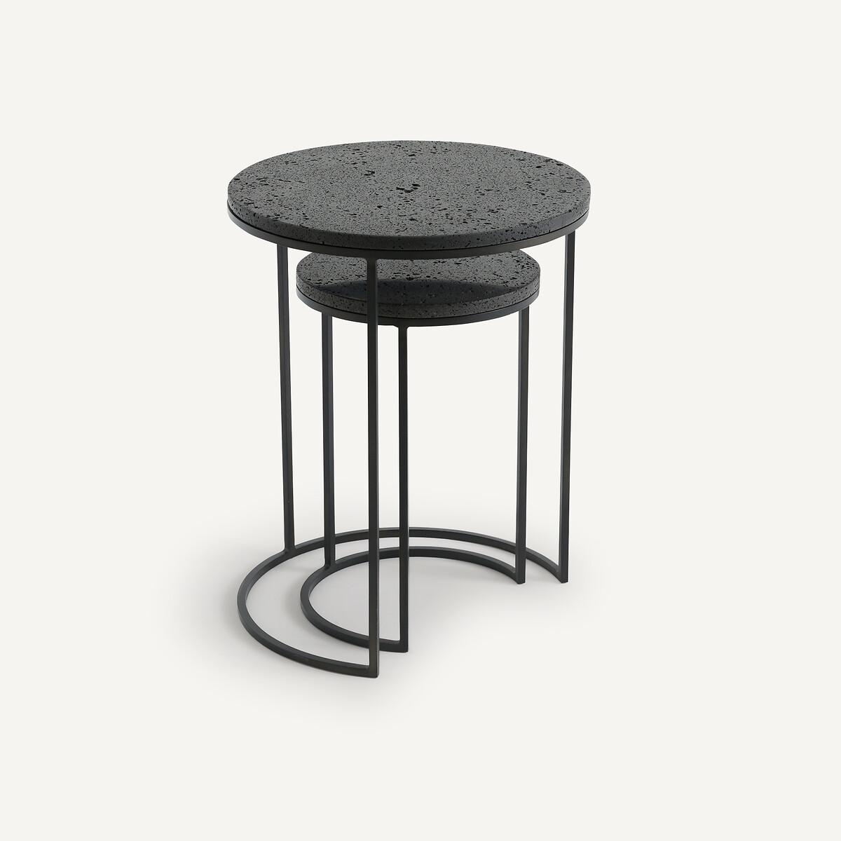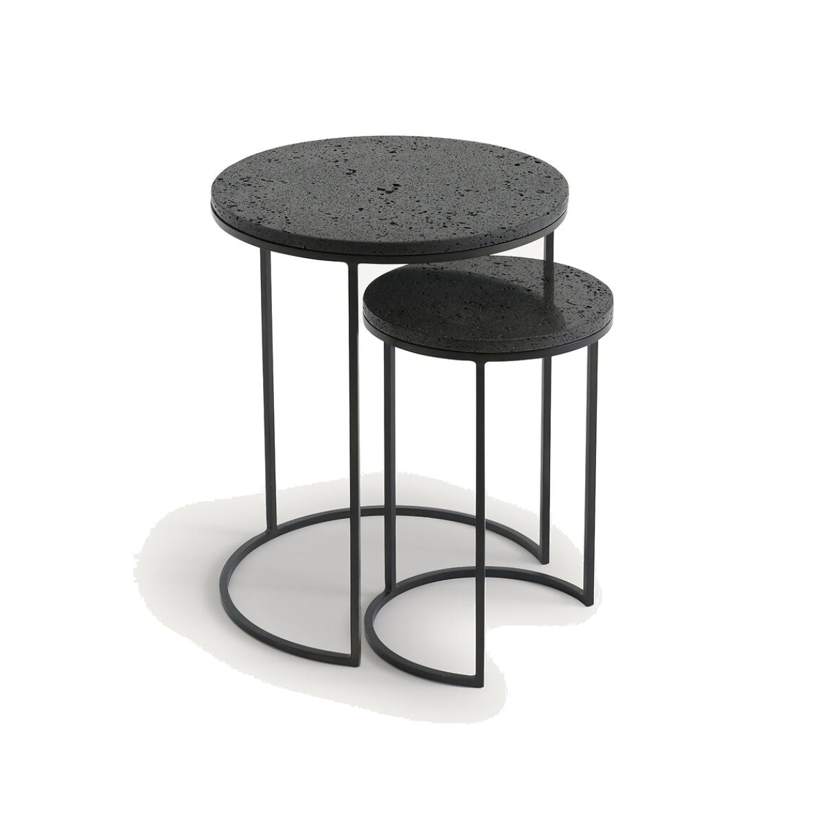 I love this pair of lava stone side tables for their sculptural yet versatile vibe. They work particularly well in modern and minimalist interiors, where their sleek black metal legs and textured stone tops add subtle visual interest without overwhelming the space. Practical styling tips include layering them with contemporary lamps or vases, or using them as a surface for everyday essentials like books or drinks in a living room or lounge. Because they're sold as a set, they’re perfect for creating a dynamic tabletop arrangement-placing one slightly apart for an asymmetrical look or grouping them close together for a cohesive feel. Their neutral tones also make them adaptable to a variety of colour schemes, from monochrome schemes to more colourful settings.