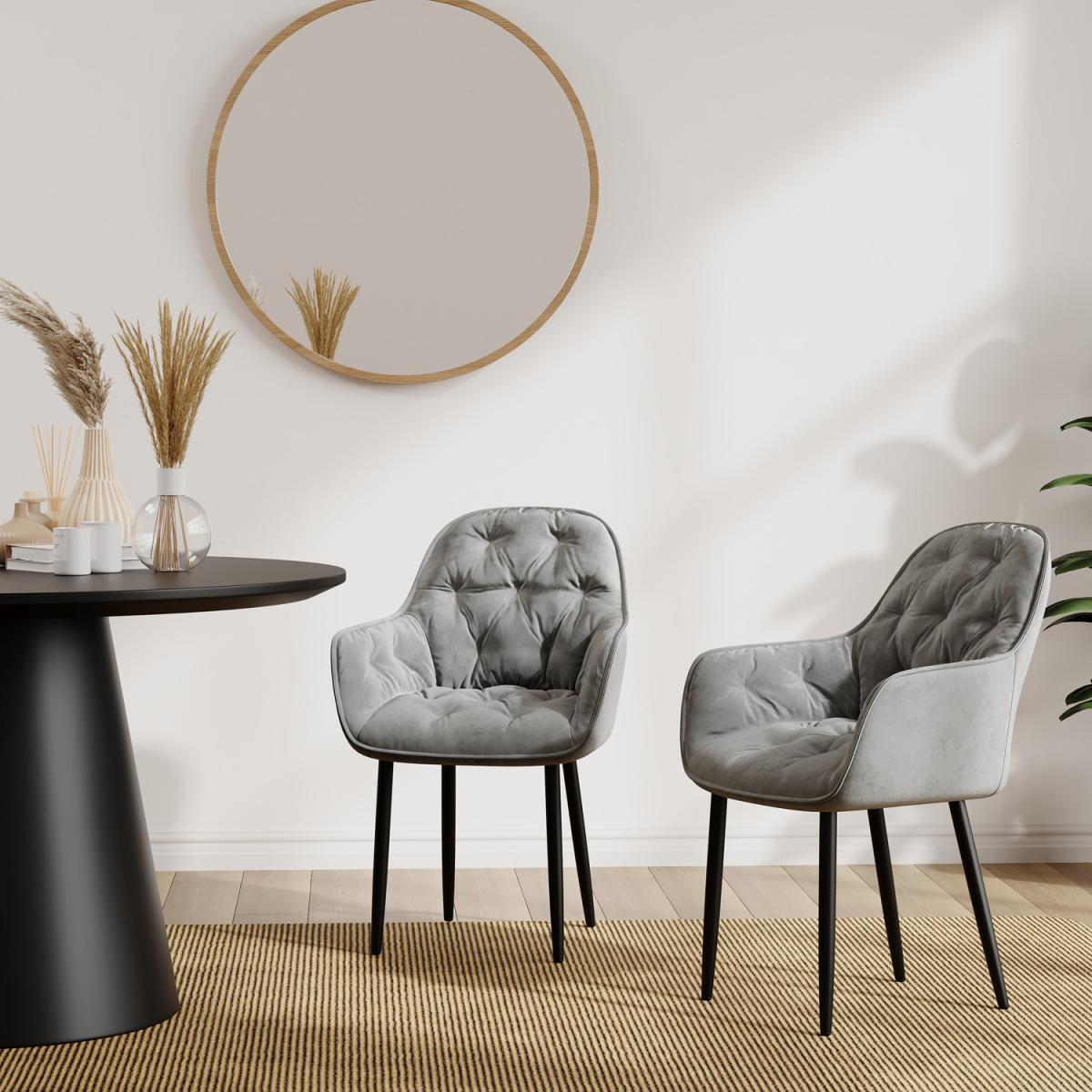 I’m a fan of these grey velvet dining chairs for their cosy, curved back and subtle button-tufting, which bring both comfort and a hint of glamour without feeling over the top. They suit modern, Scandi and mid-century schemes equally well, especially when you want a soft neutral that still has visual interest. Styling them is straightforward: pair with a sleek black or marble-topped table to echo the metal legs, layer a patterned wool rug underneath for warmth, and add a contrasting cushion in ochre or forest green to lift the palette. They also work beautifully as desk chairs in a home office or as extra seating in a living area when you need a flexible option.