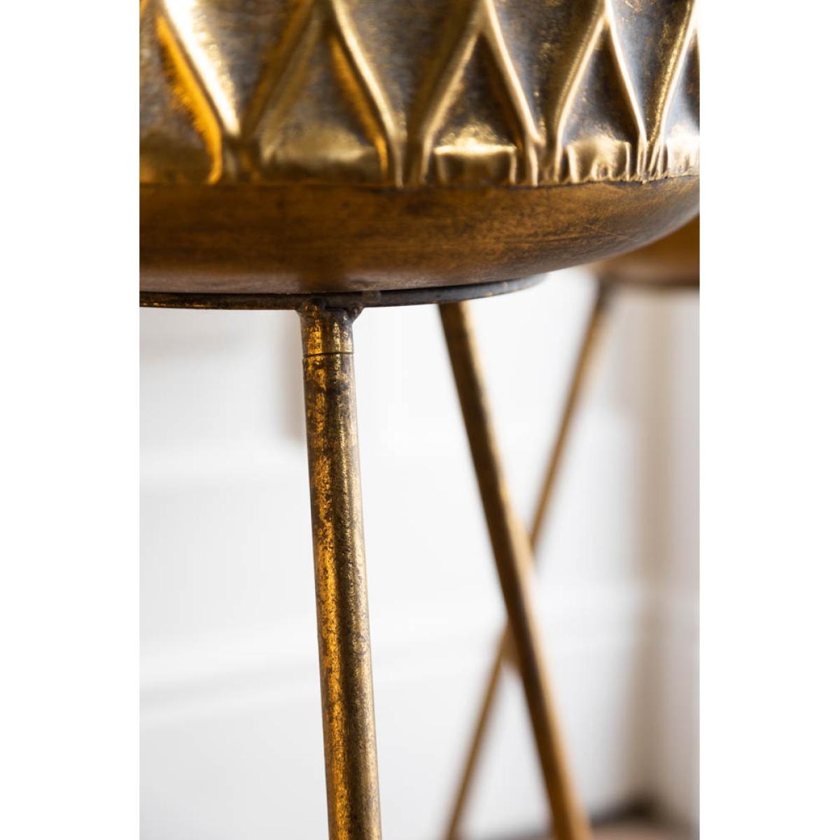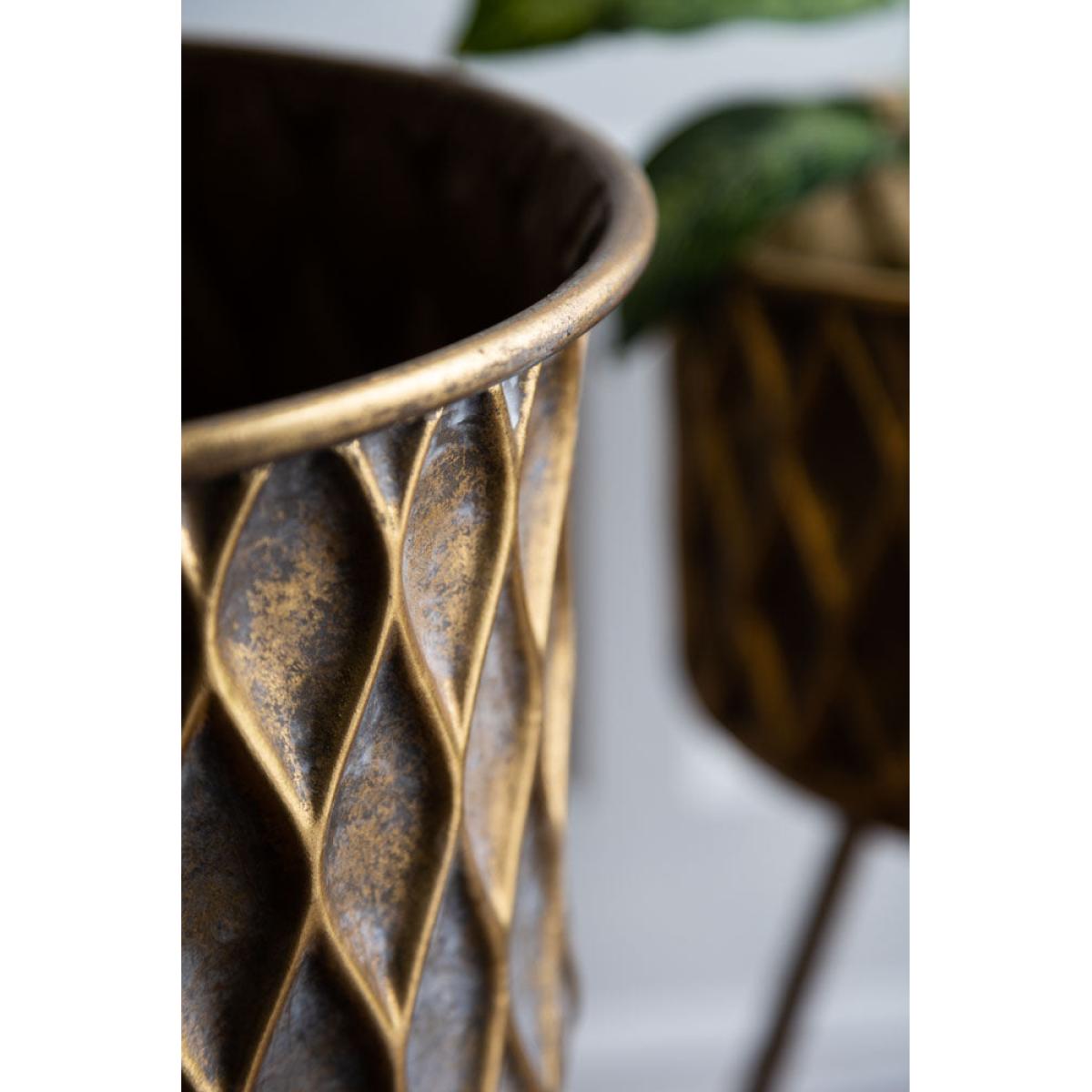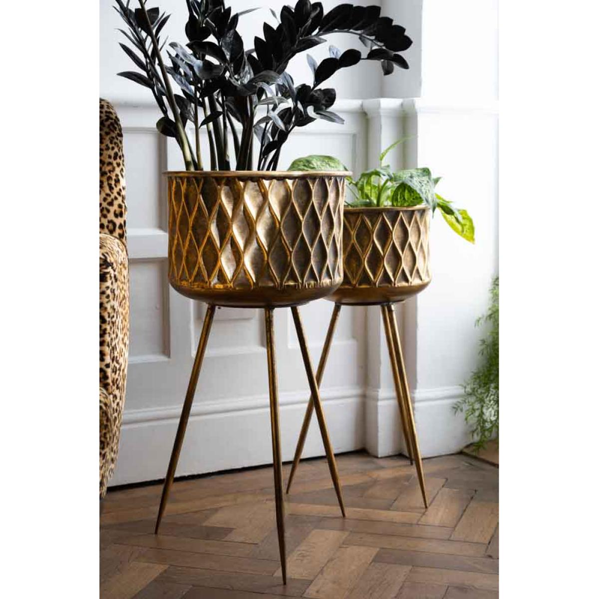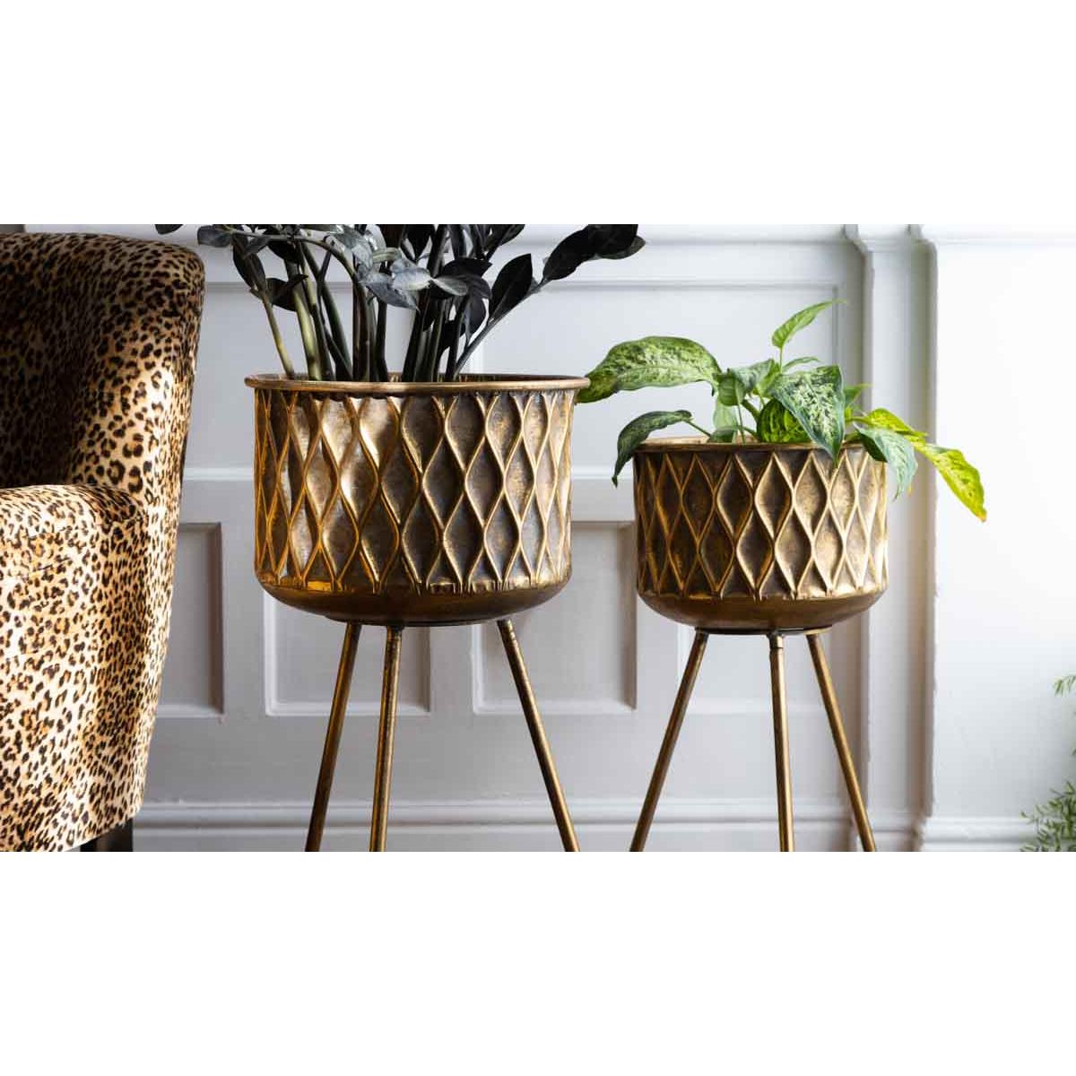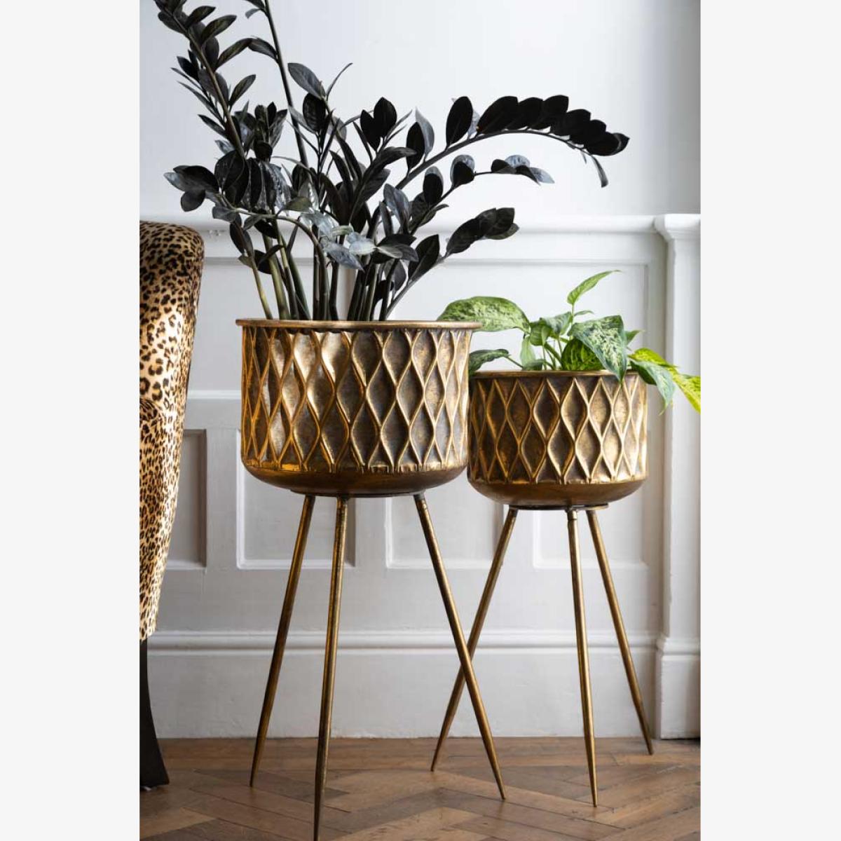 About The Set Of 2 Antique Brass Planters On Stand The Set Of 2 Antique Brass Planters On Stand are fantastic for showing off your house plants. Elevated off the floor, the raised planters allow your plants to stay at room temperature and are great for floors with underfloor heating. Designed as a set of two, both planters celebrate an antique brass effect and showcase a woven diamond design. Taking inspiration from the 1920s with an Art Deco feel, the planters will look fabulous planted with palms or peace lilies, both of which were popular at this time. They are also very easy to keep alive as the droopy leaves let you know when they need water. The large planter measures H75cm x W36cm x D36cm, while the smaller design measures H66cm x W31cm x D31cm. Why We Think You’ll Love The Set Of 2 Raised Planters On Stand The Set of Two Planters add effortless glamour to your home. In addition, raising your plants off the floor allows them to appear larger and fuller. If you go for a plant that is already tall and thriving, these beautiful planters will ensure that the plant is in your eye line so you can enjoy the full effect. Designed for house plants, please note that we do not recommend using these antique gold plant pots in the garden. How To Style The Set Of 2 Antique Gold Planters On Stand The Set of Two Antique Brass Planters look great clustered together and the different heights between the designs help to create drama when the pots are planted. Style yours on either side of a sofa in a living room or conservatory. The antique effect planters are made of metal with a gold finish and distressed detailing that could be mistaken for vintage!