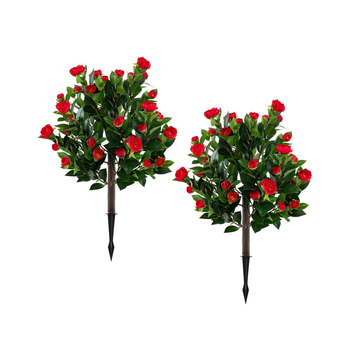 Intricately designed, a set of 2 artificial camellia trees boast red blooms, lush leaves, and realistic trunks replicating nature's splendor. Crafted from premium PE material, the faux flora is sun-protective, anti-fading, non-allergic, and smell-free. Minimal upkeep is needed, as these lifelike trees demand no watering, sunlight, fertilizing, or trimming. The package includes ground spikes for easy installation in soil or pots (not included), no tools required. Perfect for various settings, the faux silk flora topiary plants seamlessly blend into your indoor and outdoor occasions.