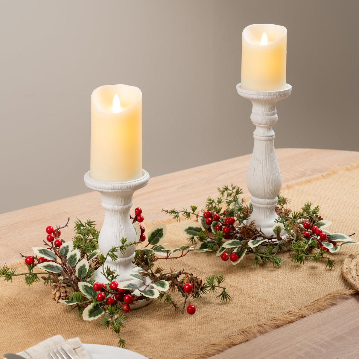 I love this set because it offers a versatile way to incorporate natural greenery and festive colour into your decor without the fuss of real foliage. These leaf and berry candle rings work well in both traditional and contemporary interiors, especially when paired with neutral colour schemes or simple candle displays. Practical styling tips include using them to adorn pillar candles as shown, or draping them over open shelving, mirror frames, or around centrepieces to add a touch of seasonal charm. They're especially effective in creating a cosy, inviting atmosphere during the winter months but can also be used year-round to introduce a fresh and lively detail to your space.