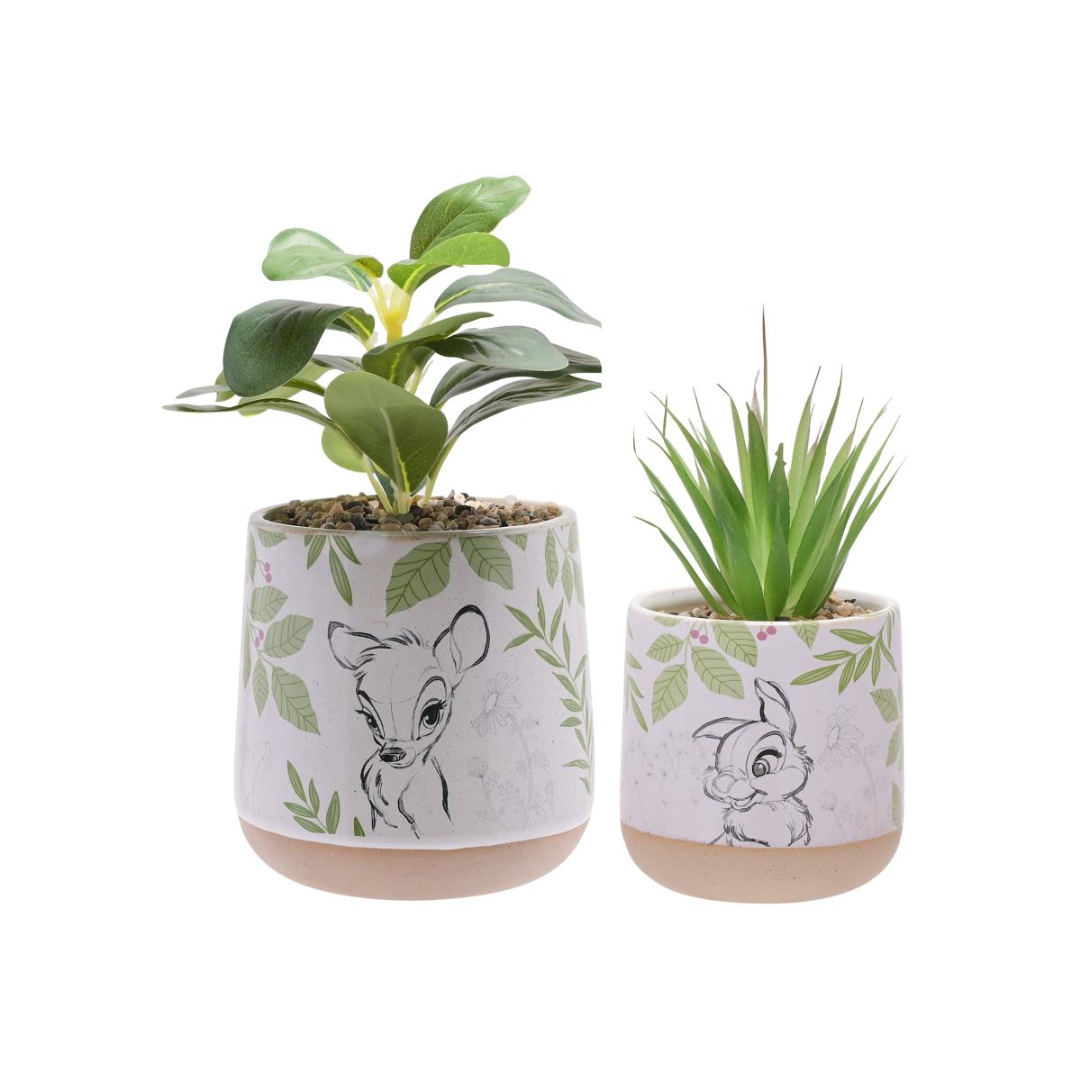 * 2 x Artificial Succulents* Bambi & Thumper Designs* Made from Ceramic Requiring no maintenance thanks to its high-quality artificial composition, these two succulents sit prettily in two Bambi inspired plant pots: one depicting the sweet Bambi, and the other the lovable Thumper.