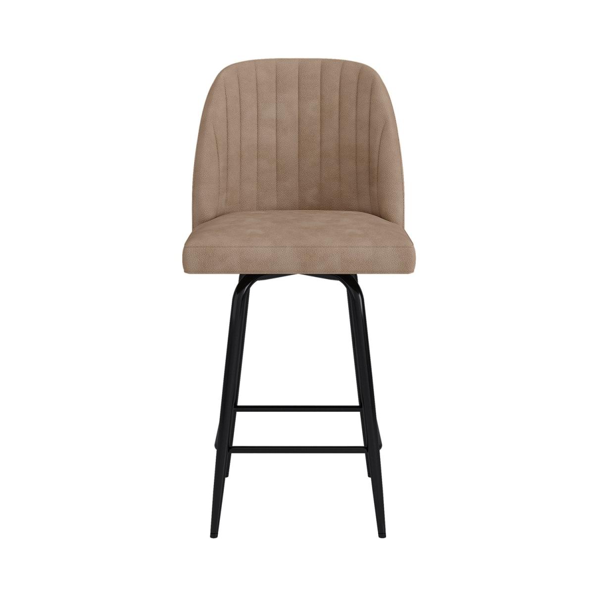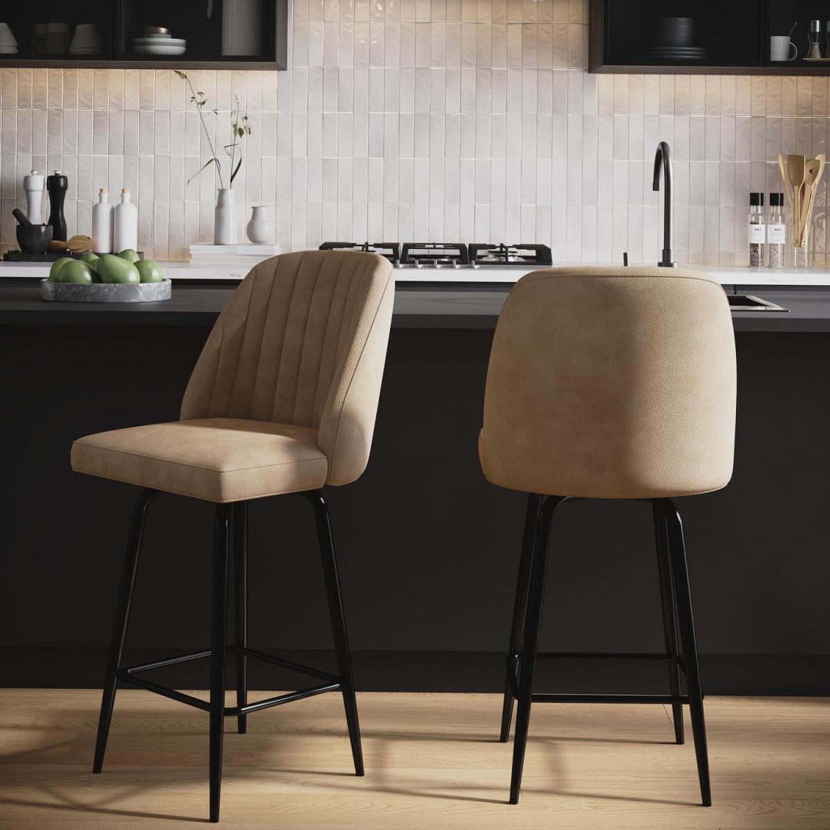 Designed with compact kitchens in mind, the 360-degree swivel seat offers easy movement and accessibility without needing to move the stool. The slightly curved and tall backrest provides both comfort and support, ideal for long chats over coffee or relaxed dinners. Upholstered in a beige faux leather with stitching detail, this stool adds a contemporary touch that complements a wide range of interiors. Built to last, the sturdy black metal legs offer reliable stability while enhancing the stool’s modern look. Pair with other pieces from the Logan collection to create a coordinated kitchen or dining setup. The Logan kitchen stools combines space-saving practicality with modern design. Perfect for smaller kitchens, the swivel seat makes it easy to slide in and out, while the tall, slightly curved backrest supports your posture during everyday use. Finished in beige faux leather with subtle vertical stitching, it’s both stylish and versatile. Black metal legs offer a sleek contrast and durable foundation, making these stools a smart and lasting addition to your kitchen. Complete your space with matching items from the Logan range.