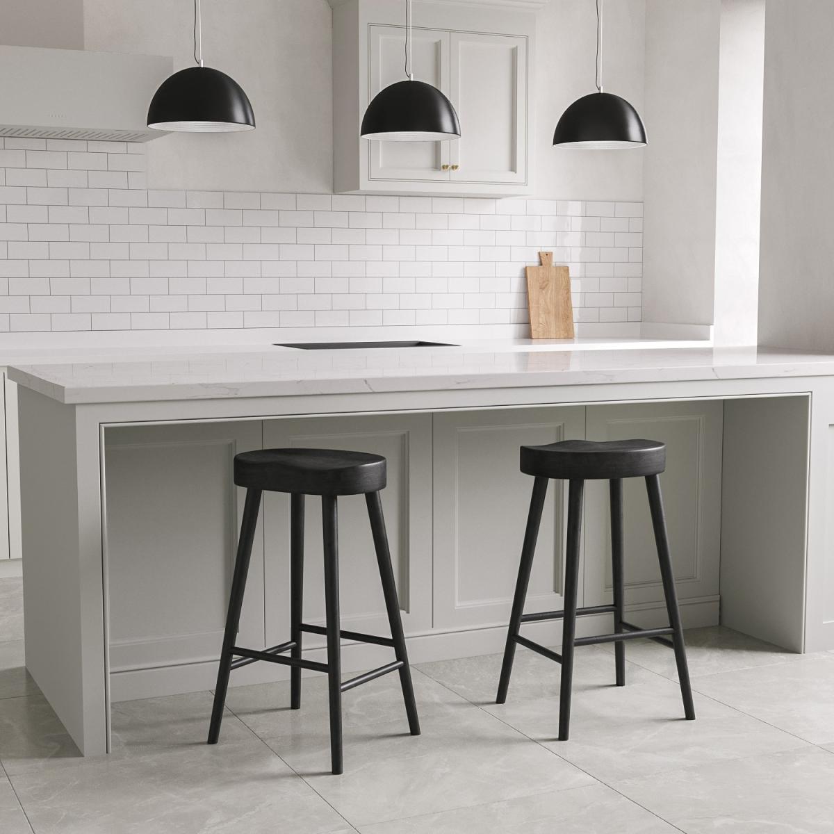 I’m a big fan of these black oak stools for their clean lines and solid build - they work equally well in modern, Scandinavian or industrial-style kitchens. At 70 cm high they’re a perfect fit under most breakfast bars, and the matt black finish pairs beautifully with pale worktops or marble islands. For a softer feel, consider a slim linen seat pad in a neutral tone, or mix in a single leather stool for contrast. Practical styling tip: keep the area around them uncluttered and add a pair of streamlined pendant lights overhead to frame the seating zone.