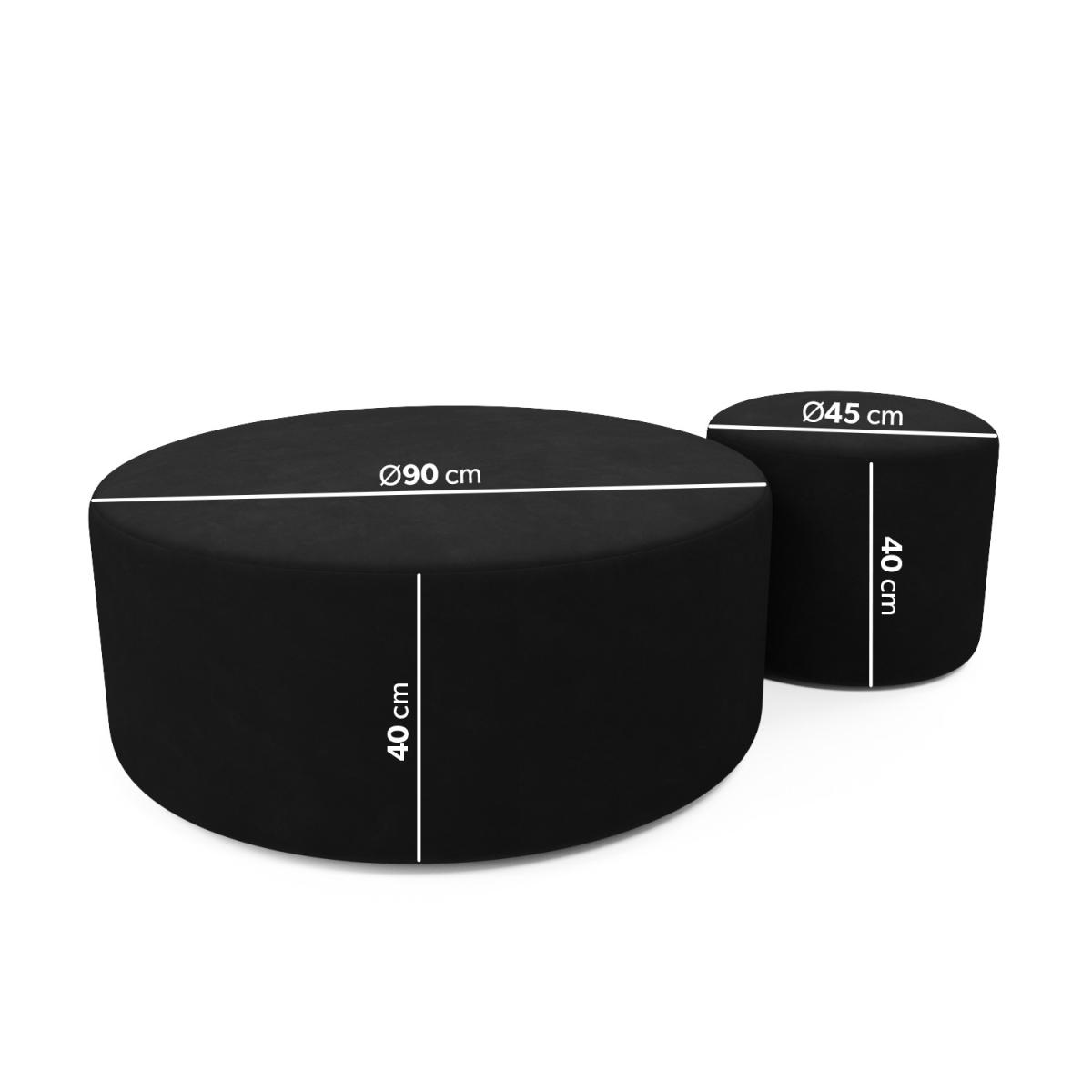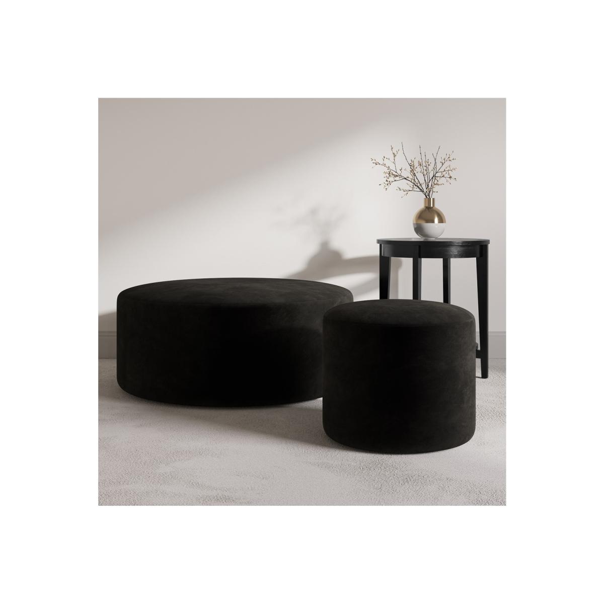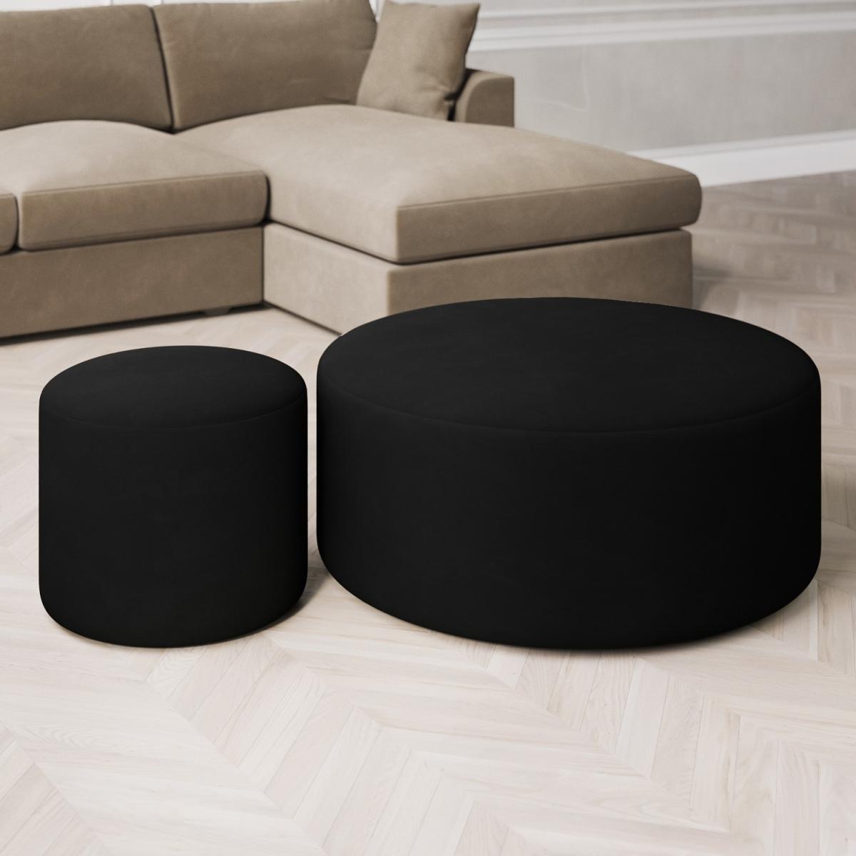 Pair of round footstools in varying sizes upholstered in soft touch black velvet Can be used as footstools, extra seats, or side tables for your living room Footstools match perfectly with the Black Velvet Payton range Available in 3 colourways to suit any interior