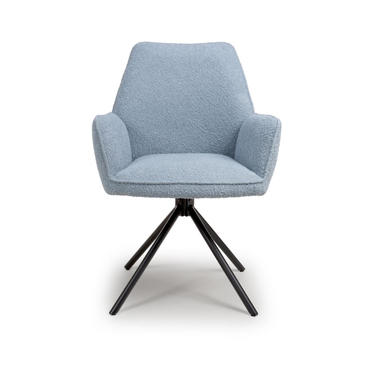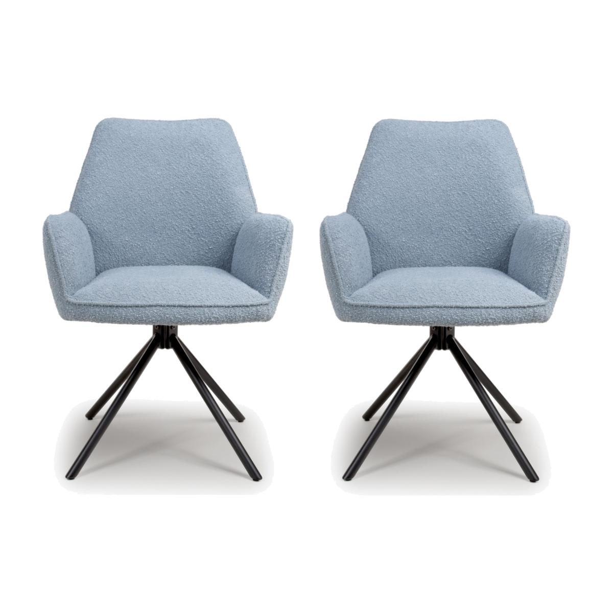 Pair of boucle fabric dining chairs Powder coated black legs Light blue Carver arms Assembly required