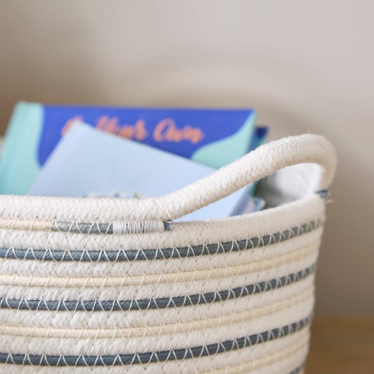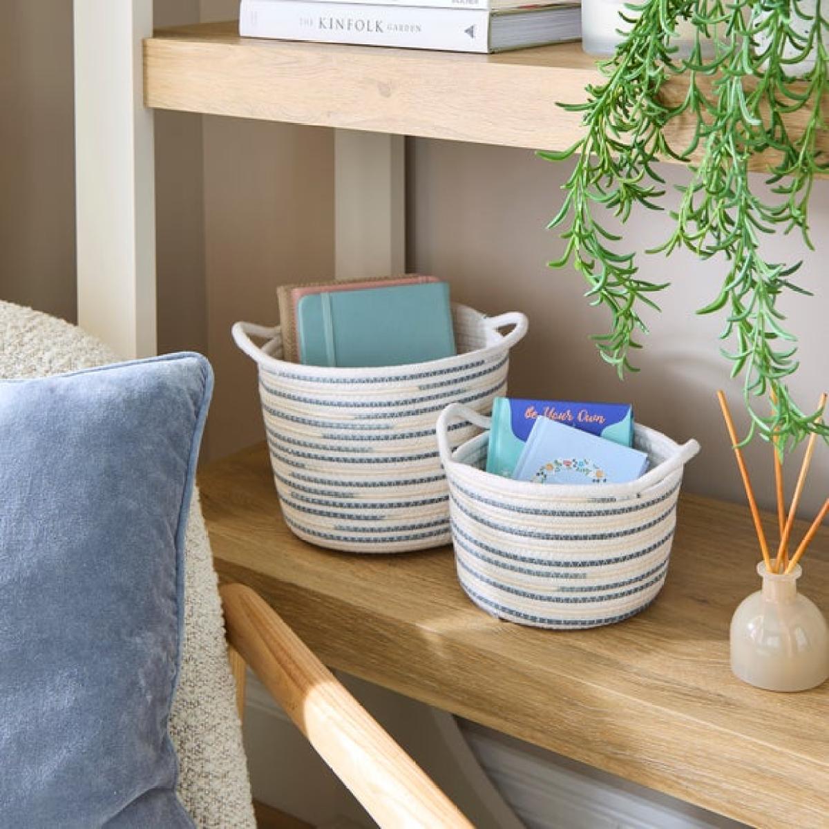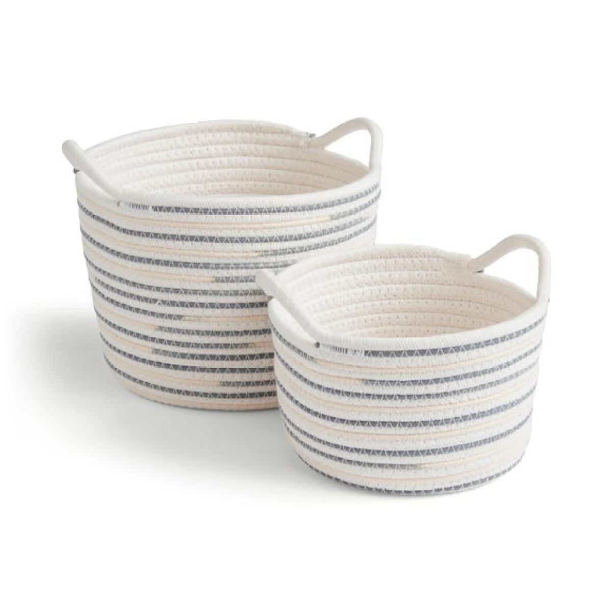 * Coastal stripe design * Made from rope * Comes as set of 2 Double the storage, double the style! These durable cotton rope baskets offer easy, decorative organisation with sturdy stitching for lasting use.