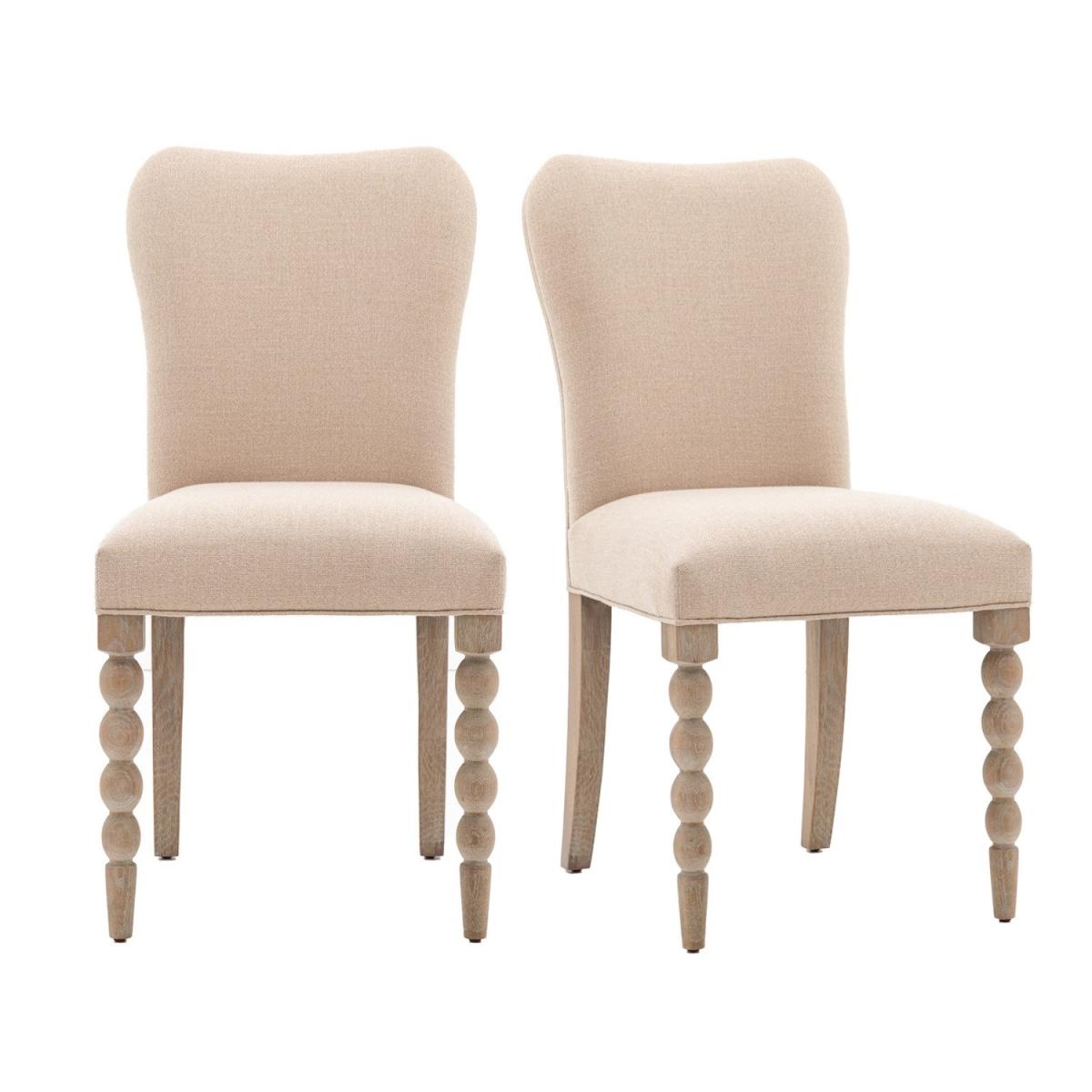 Dimensions:W47 x D59.8 x H92 cm Featuring a fully upholstered seat and beautiful oak legs, these stunning dining chairs will make a classy addition to any dining room. The front legs feature hand-crafted bobbing detail which is created by turning the wood on a lathe, a task carried out by the finest craftsmen. The wood has a very subtle lime wash tone to the finish which is soft and mellow, and looks beautiful paired with biscuit coloured fabric for the upholstered seat. Matching pieces are available. Features: Fully upholstered seat and beautiful oak legs Seat Height 43cm Bobbing detail legs Matching items available