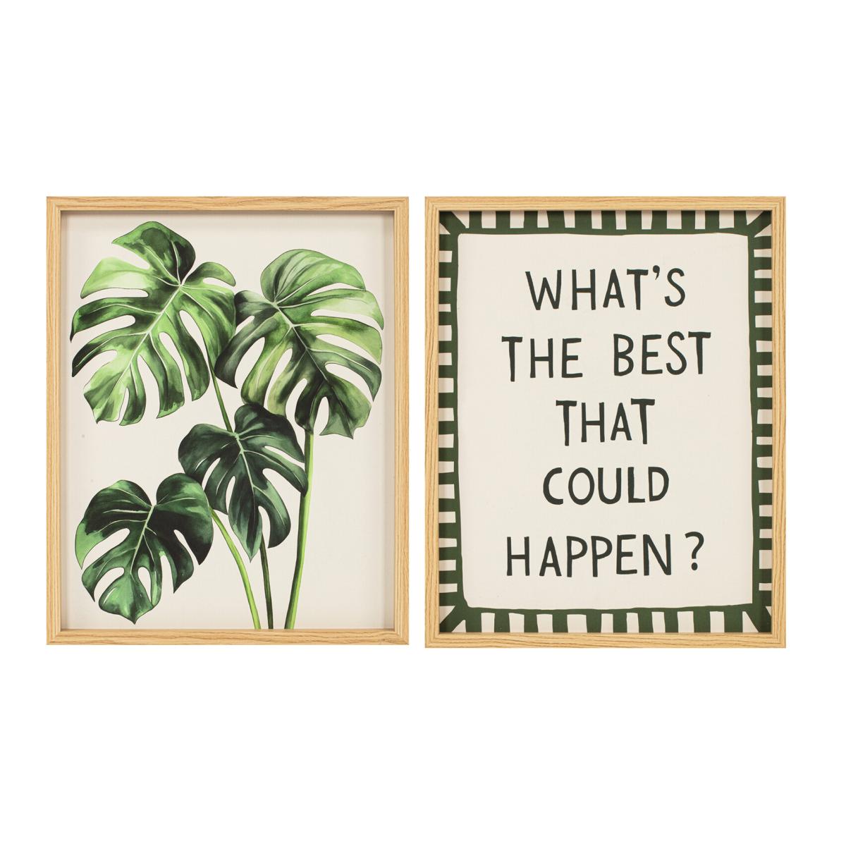 Add a refreshing touch to your decor with the Set of 2 Botanical Slogan Canvases. One canvas features a bold botanical print, and the other a fun slogan, 'What's the best that could happen?' to add a playful touch to your decor. Perfect for uplifting any room, these canvases are ready to hang and blend effortlessly with most interiors.