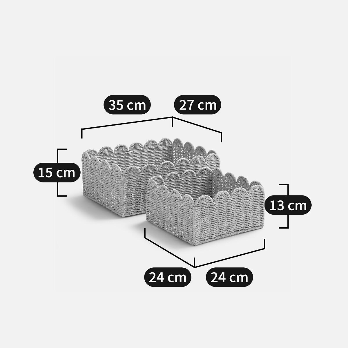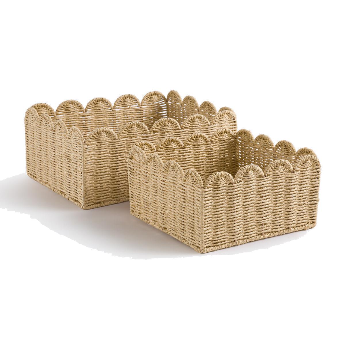 As functional as they are beautifully crafted. This set of 2 Briska storage baskets are made of woven paper with scalloped edges. They are the perfect addition to any bedroom, bookcase or bathroom. Product Details • In woven paper • Steel frame • Scalloped edging • Set of 2 different sized basketsDimensions Size 1 • Length: 35cm • Height: 15cm • Width : 27cm. Size 2 • Length: 24cm • Height: 13cm • Width: 24cm