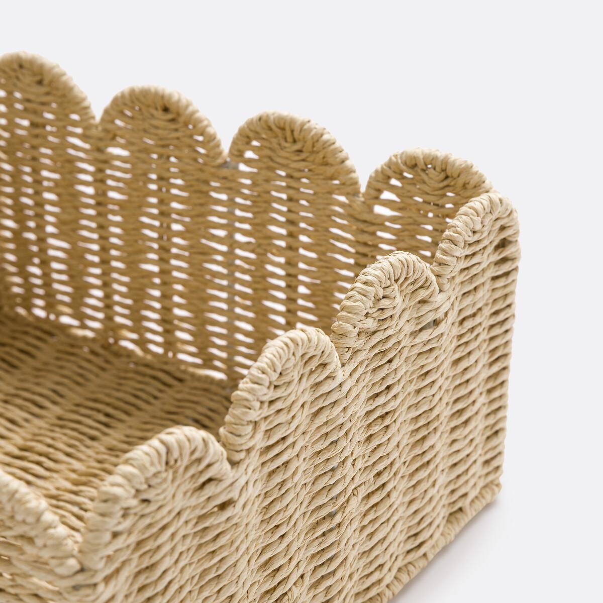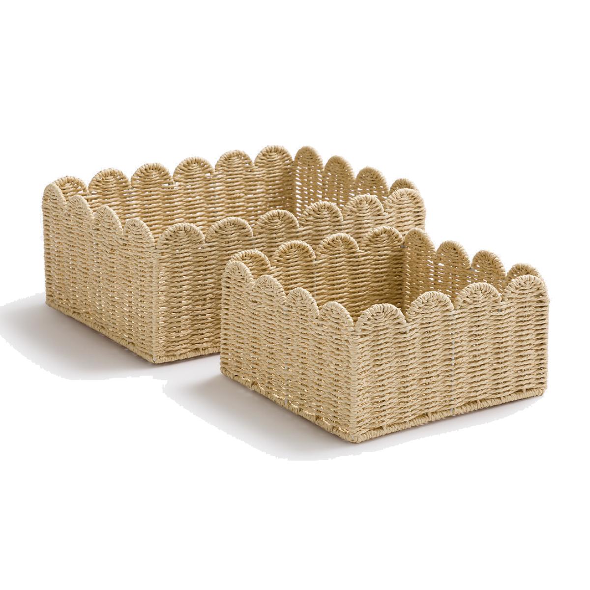 As functional as they are beautifully crafted. This set of 2 Briska storage baskets are made of woven paper with scalloped edges. They are the perfect addition to any bedroom, bookcase or bathroom. Product Details • In woven paper • Steel frame • Scalloped edging • Set of 2 different sized basketsDimensions Size 1 • Length: 35cm • Height: 15cm • Width : 27cm. Size 2 • Length: 24cm • Height: 13cm • Width: 24cm