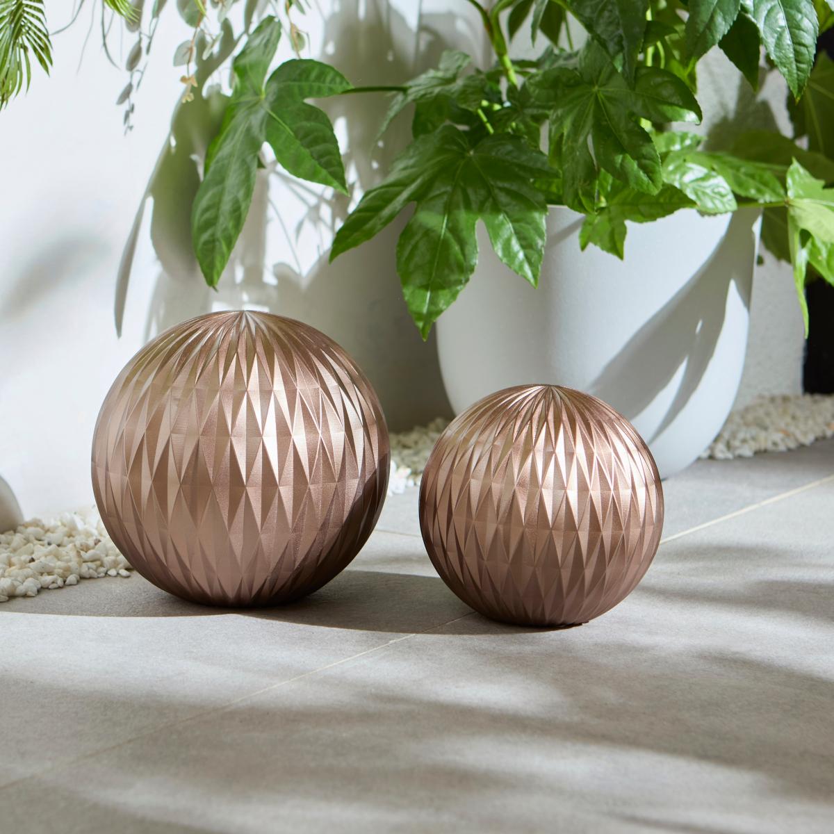 * Luxurious bronze colourway * Set of 2 * Textured sphere design * Large and small size * Great for visual interest * Suitable for outdoor use This set of 2 resin garden sculpture balls are a great way to bring interest and colour to your garden. Made from durable resin, they can be placed outside to soften hard landscaping or add a visual focal point to your displays. The contemporary textured design and differing sizes make these a lovely set for instant impact.