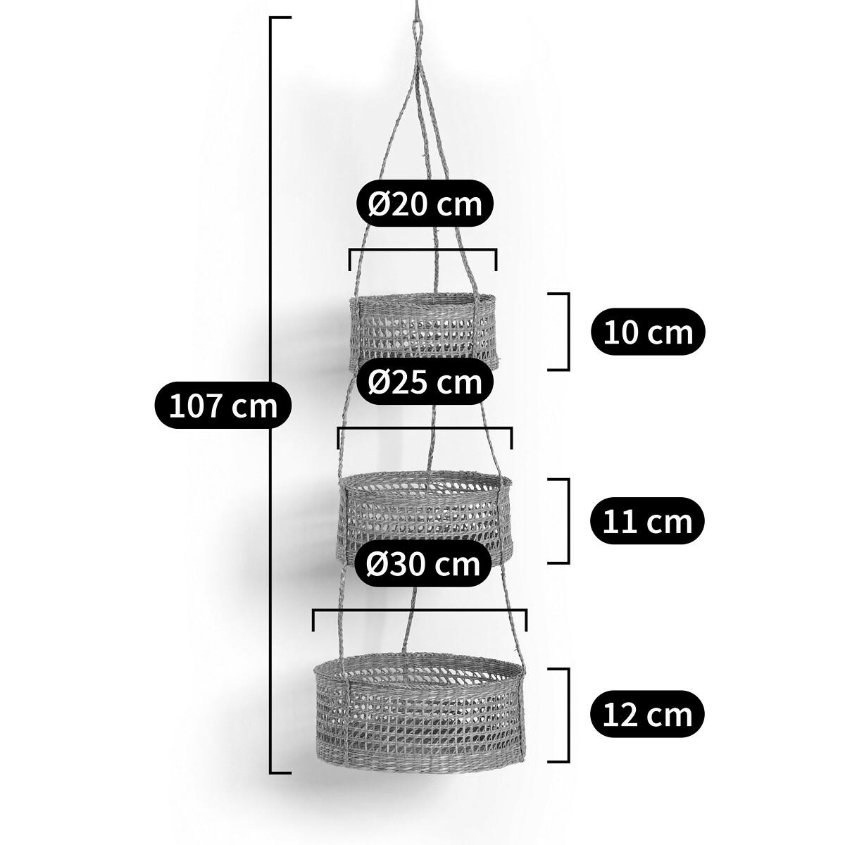 The set of 3 Cesta woven hanging baskets: A nice way to store and showcase your items and plants. Product Details • Woven straw. Dimensions • Large: Diameter 30 x Height 12 cm • Medium: Diameter 25 x H11 cm • Small: Diameter 20 x Height 10 cm • Total Height: 107cm.