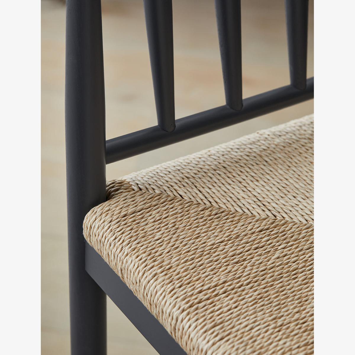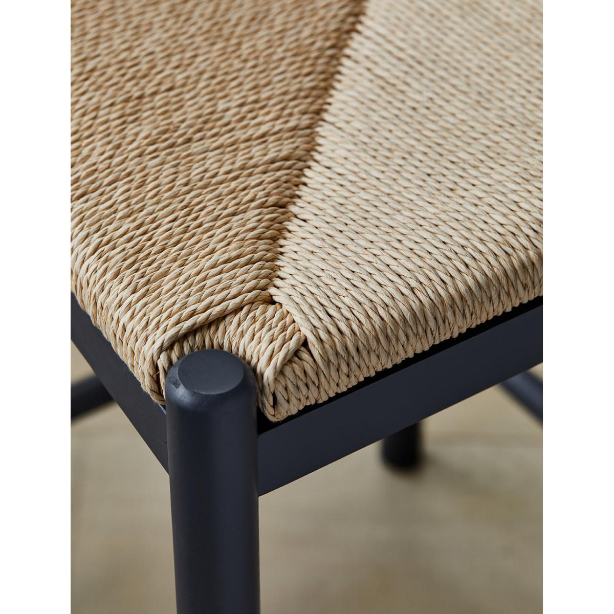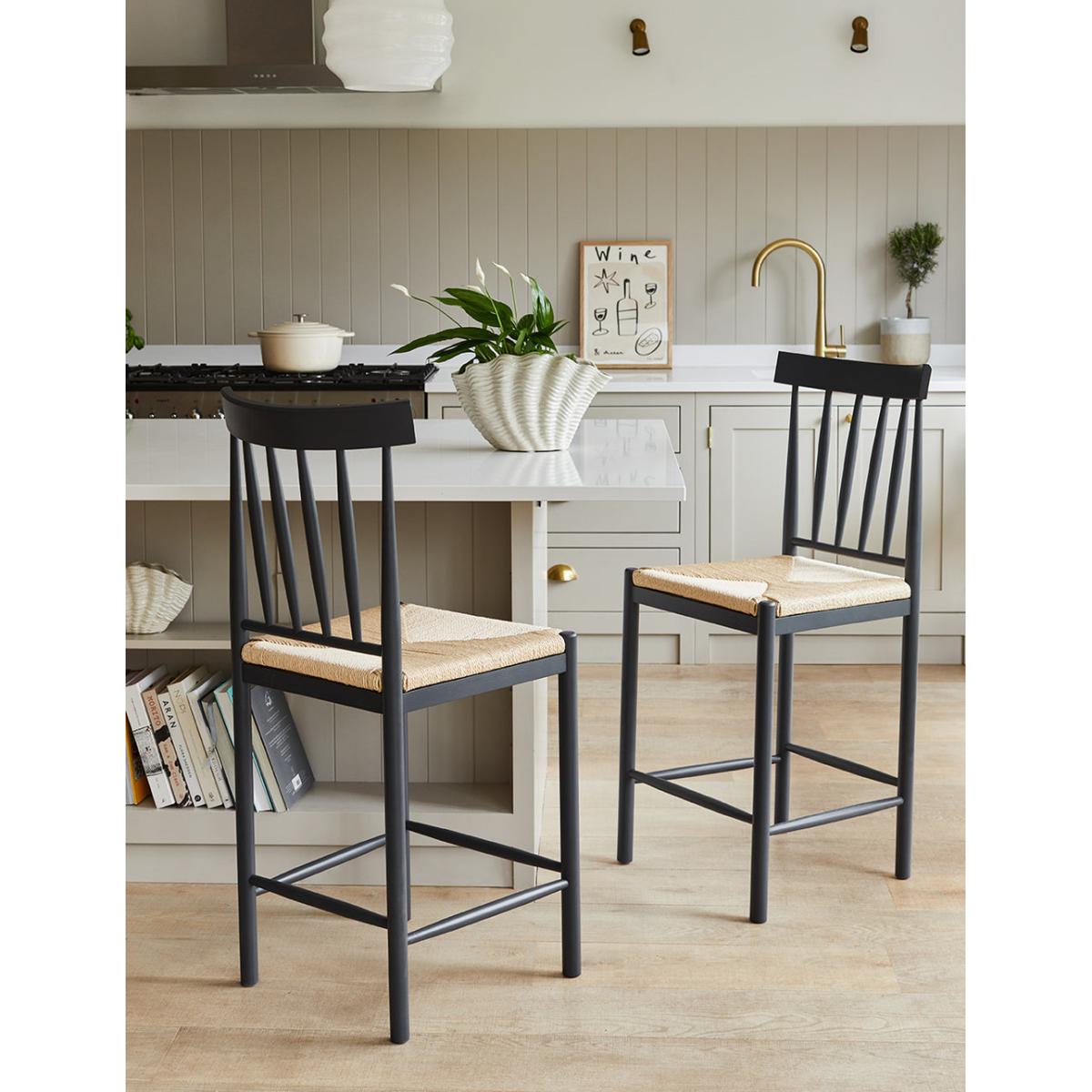 Transform your kitchen with our Set of 2 Charcoal Wooden Bar Stools with Woven Rope Seat Detail. Our wooden bar stools are thoughtfully designed with rungs to rest your feet and a high backrest to provide maximum comfort for the whole family. Each bar stool is expertly crafted from durable beechwood, and the frame is hand-painted with a beautiful deep navy shade. The stools are hand-woven with rope made from all-natural material into a detailed dutch weave pattern that adds a country farmhouse feel to this kitchen bar stool. Measuring 110cm in height, they are the perfect size to fit underneath your bar top or a high kitchen counter. We have 1 ex-display Set of 2 Charcoal Wooden Bar Stools with Woven Rope Seat Detail in perfect condition. Please get in touch for more details.