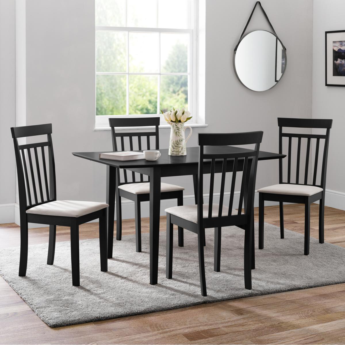 I love these black dining chairs for their clean lines and sturdy feel - they slot straight into both modern and more traditional schemes. The slim spindled back keeps them light in smaller spaces, while the matt black finish makes them a versatile base for bolder table settings or patterned placemats. For a simple update, add neutral seat cushions or swap them seasonally for a pop of colour. Pair with a light oak or white-washed table to balance the dark frame, or go full contrast against pale walls. They’re easy to mix with different textures, so try linen napkins and a jute rug underneath to give the area a lived-in edge.
