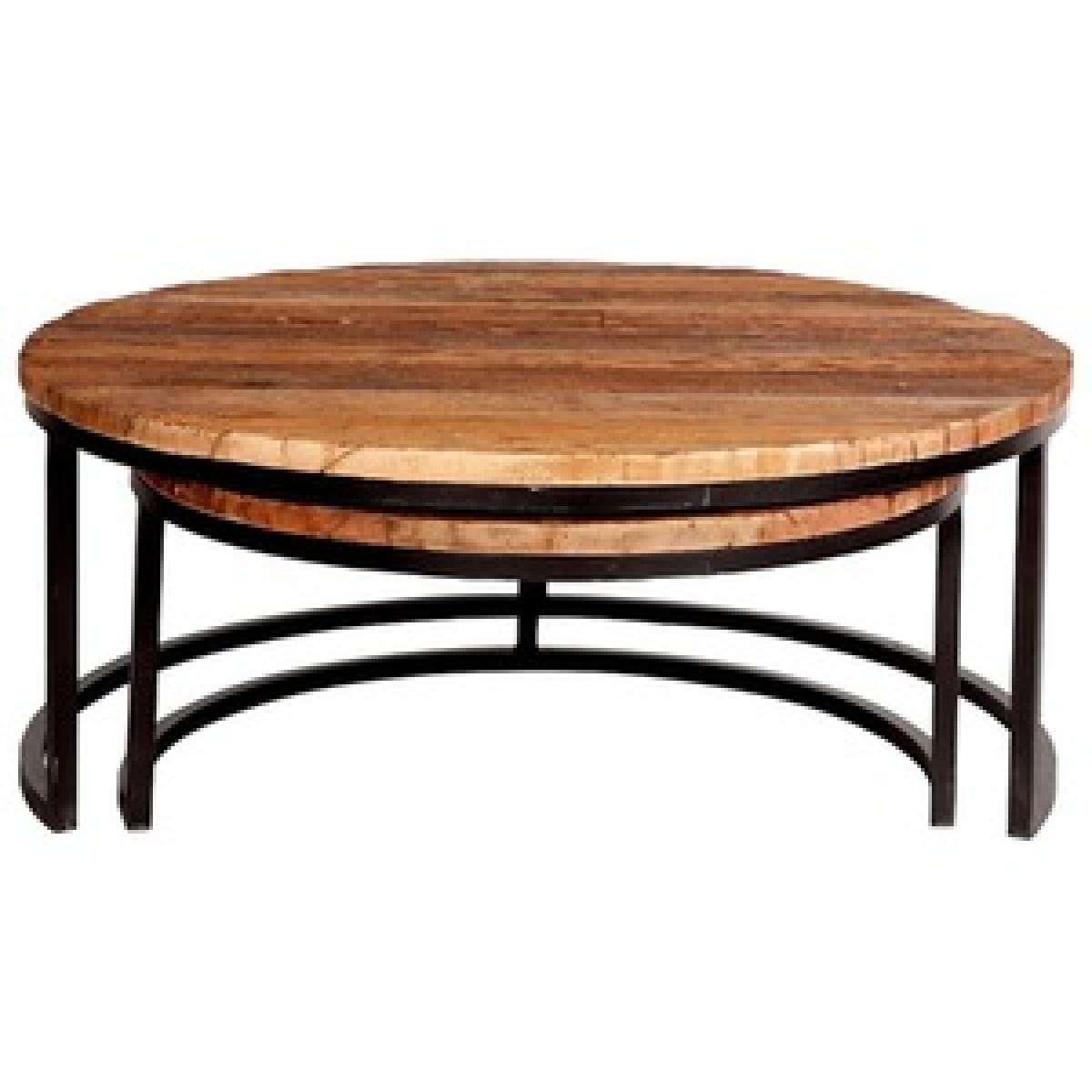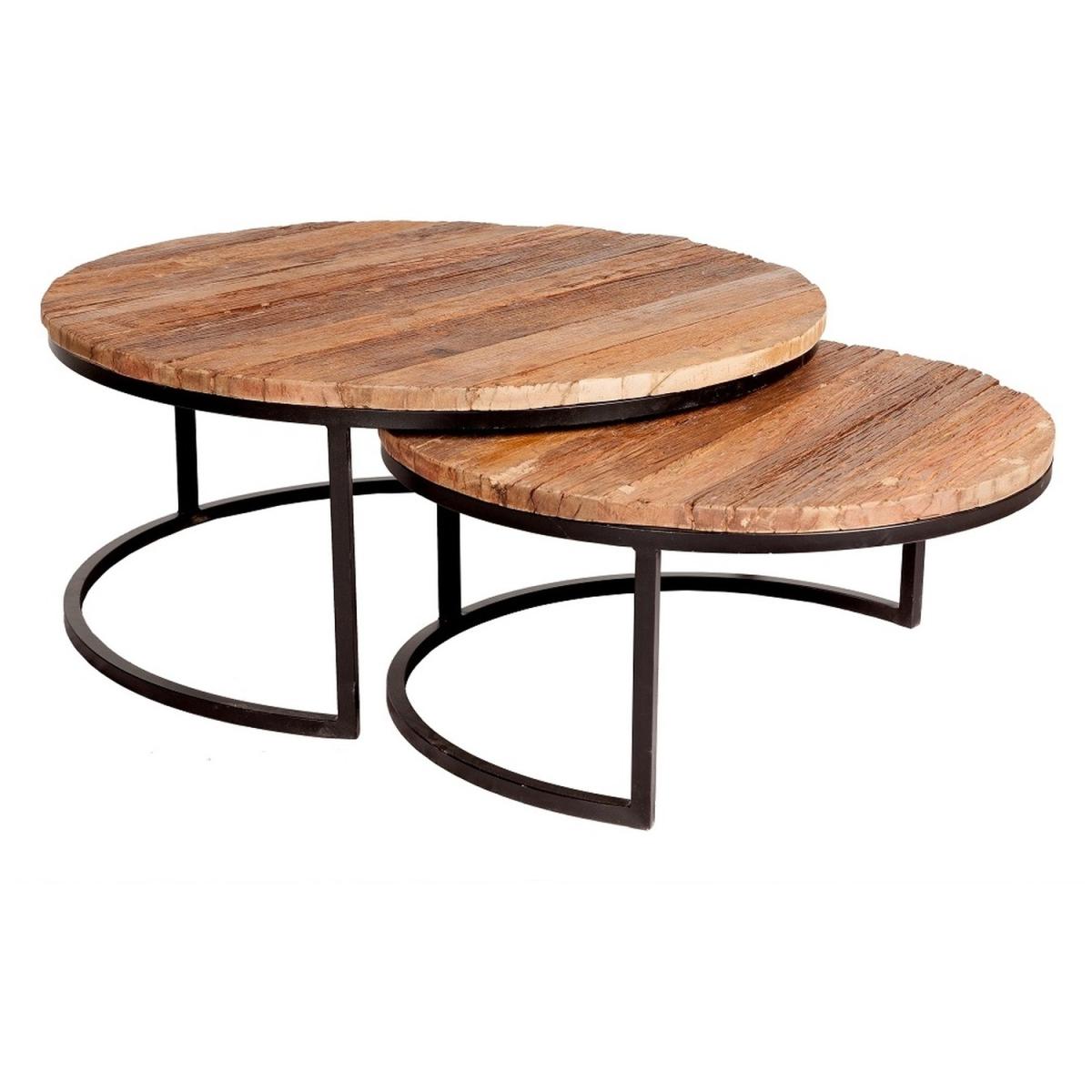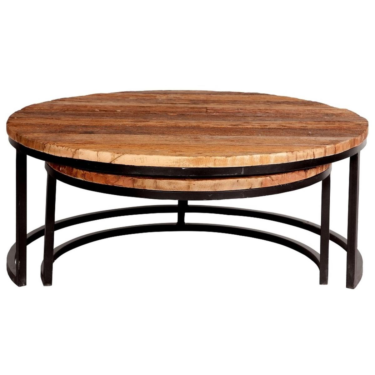 Set of 2 Coffee Tables Railway Sleeper Wood, Round coffee table set with a unique design, a lovely addition to your industrial style surroundings. Each piece is unique due to its handmade character and items can vary slightly from the images shown. With a beautiful and eco-friendly design, these coffee tables are handmade from railway sleeper wood and complemented with a metal frame base. Handmade by craftsmen in India, this set of tables will be providing ample serving space when needed and won't take too much space as the smaller table fits perfectly under the bigger one when not in use.