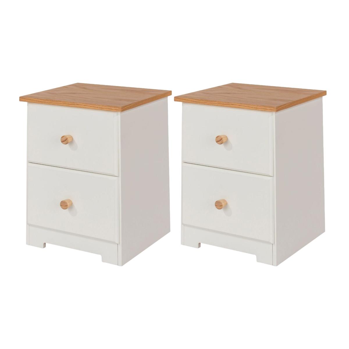Set of 2 petite 2 drawer bedside cabinets, featuring an easy to clean oak woodgrain effect top with a soft white painted body and matching wooden handles. Compact yet practical, each cabinet is perfect for smaller spaces, combining style and functionality.