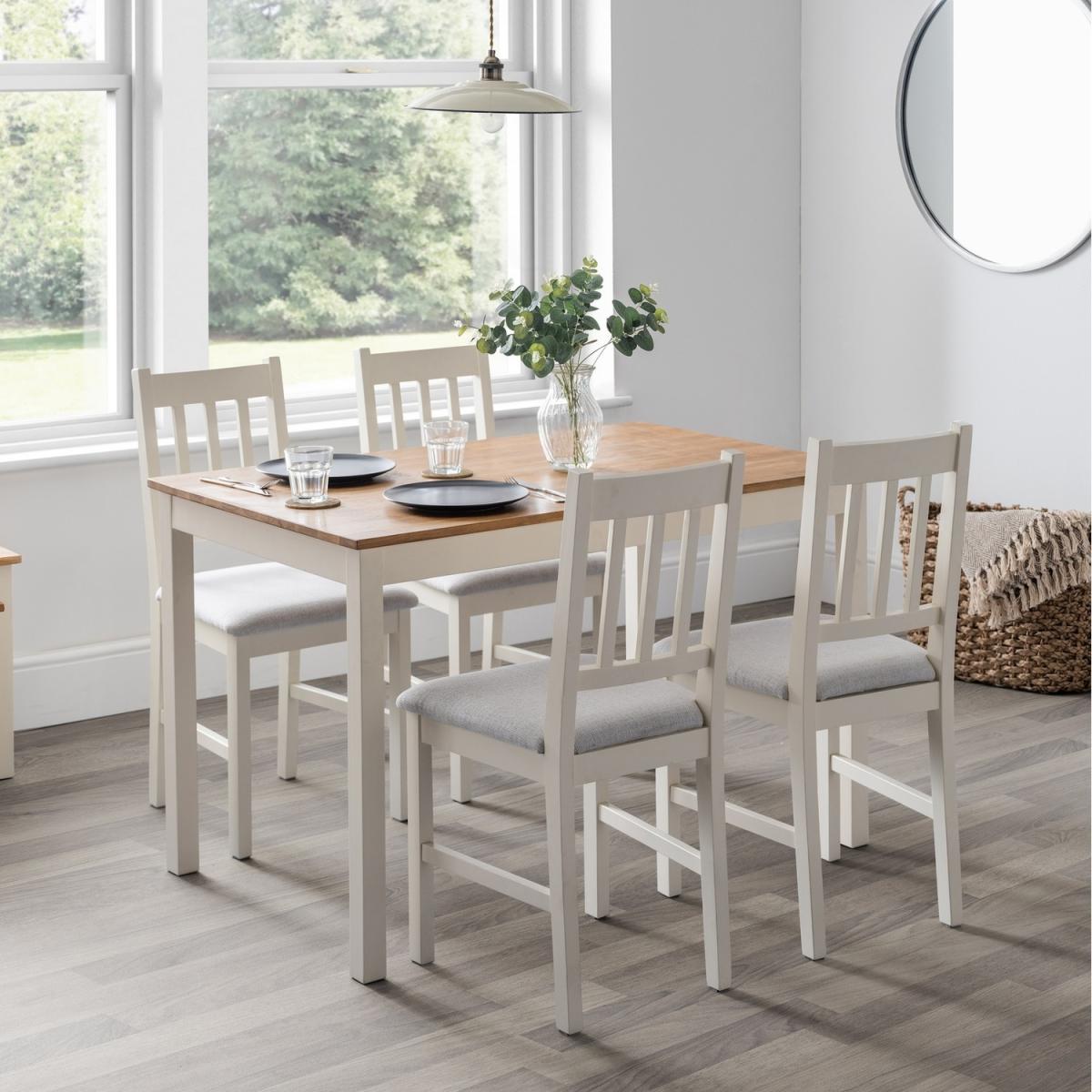 I really like these ivory dining chairs for their clean lines and neutral finish - they slot straight into everything from Scandi-inspired kitchens to relaxed country breakfast nooks. The soft-fabric seat adds just enough comfort without looking bulky, and the crisp paintwork brightens tighter spaces. Styling tip: team them with a light oak or bleached-wood table and layer on natural-fibre cushions or a simple runner to introduce texture. If you want a bit of contrast, swap in charcoal-grey placemats or a slim black metal pendant above the table to balance the pale tones.
