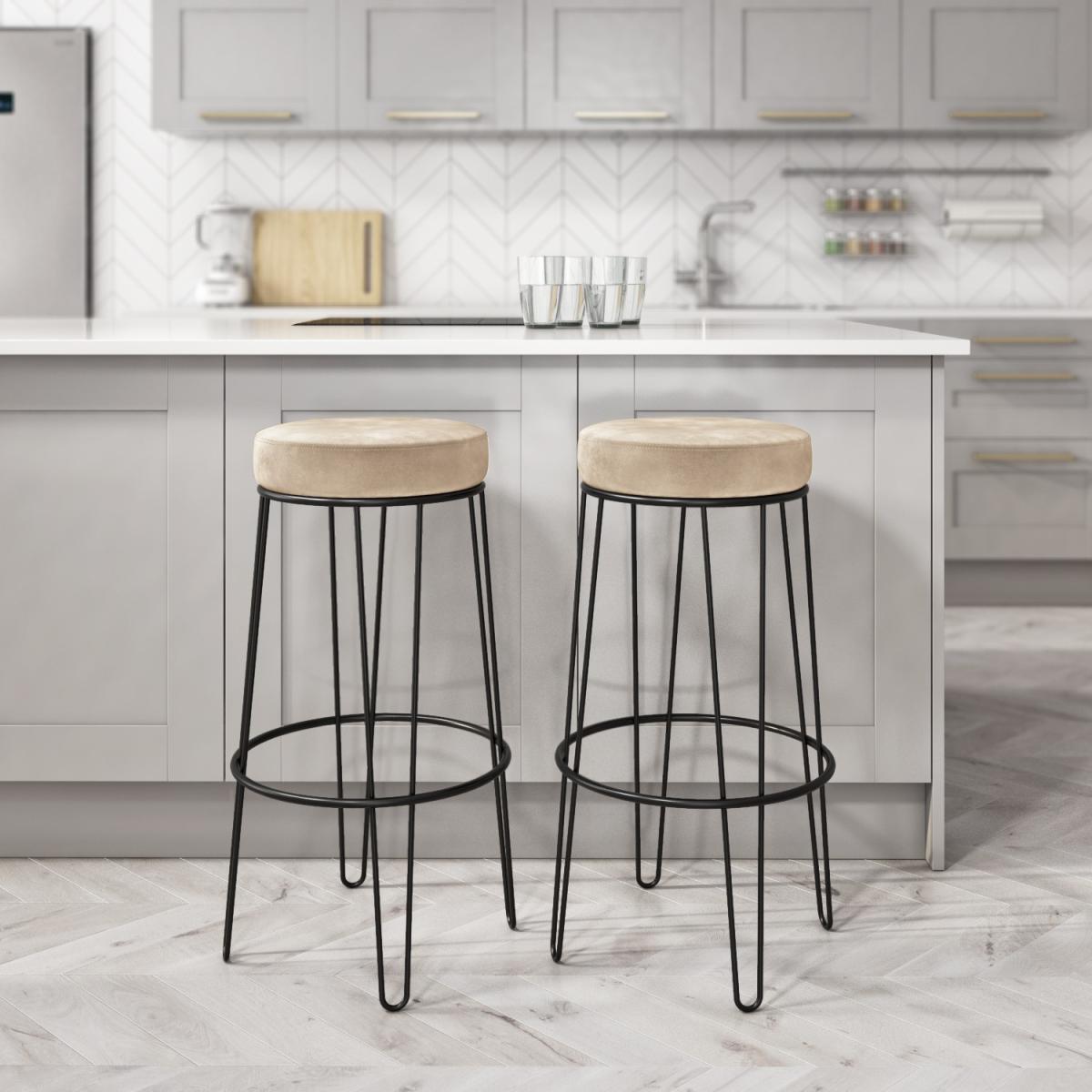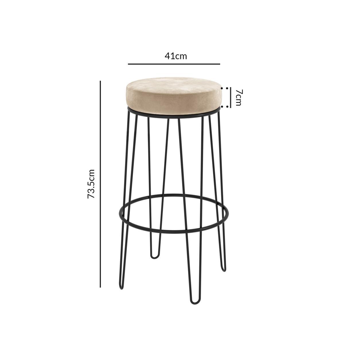 Features we love A modern twist on a classic shape. Hairpin style legs give the stools a delicate yet industrial look. Velvet topped they provide a comfortable seat. The minimalist design means it'll suit most décor styles. Sold as a pair for the perfect symmetry in your home All about me. The stylish and essential final addition to any home bar or breakfast bar the Tara bar stools are guaranteed to turn heads. A crossover between modern and classic designs these stools will suit almost any décor. Their padded velvet tops are comfortable and perfect while you enjoy your breakfast or drink. Need to know. Dimensions. W41 x H73.5 x D41 cm Material. Plywood and steel Finish. Cream velvet and black powder coating Maximum Load Weight. 130kg per stool Assembly required.