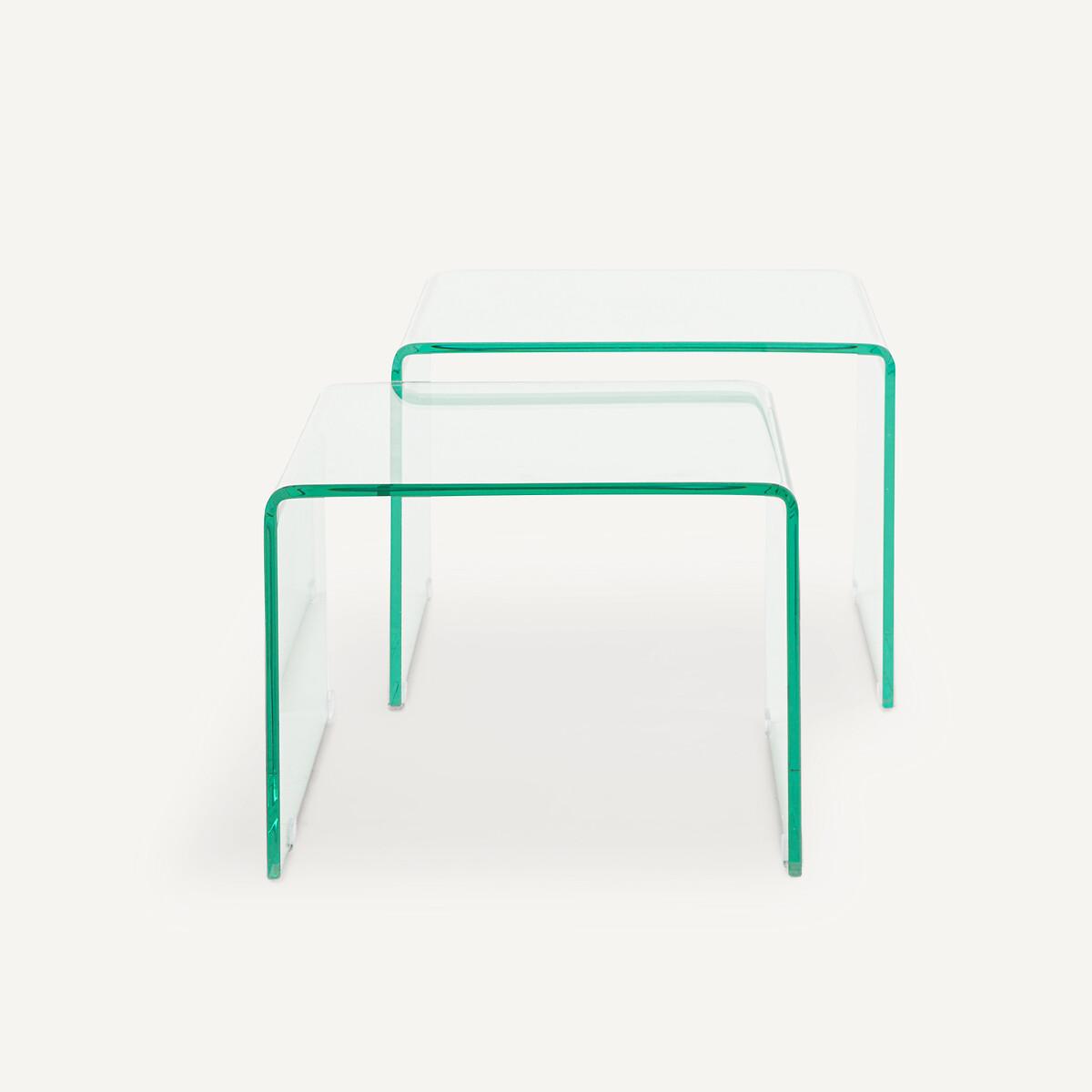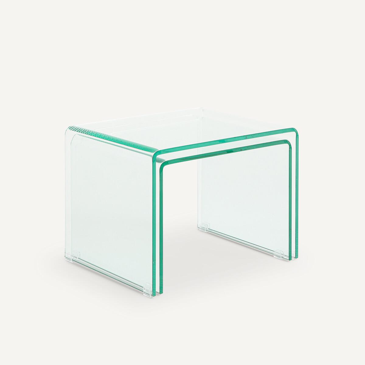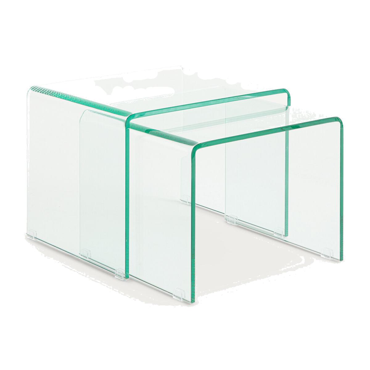 Designed in tempered glass with a thickness of 12mm, the Cristalline set of end tables includes two pull-out elements. The elegance of the glass underlines the contemporary line of this occasional furniture. They can be arranged side by side or separately as desired.. Their size and transparency allow mean you can place them without cluttering the space. Product Details • Transparent tempered glass (thickness 12mm) • Sold with removable transparent pads. Quality Info • Tempered glass is 5 times more impact resistant than conventional glass. Dimensions Small • Width: 46cm • Height: 34cm • Depth: 40cm. Large • Width: 50cm • Height: 37cm • Depth: 40cmDelivery:. Sold pre-assembled. Available for home delivery. Note! Please check that all access points are large enough to accommodate your delivery (doors, stairs, lifts).Dimensions and weight of parcel • 1 parcel • L60 x H47 x D47cm. 32kg