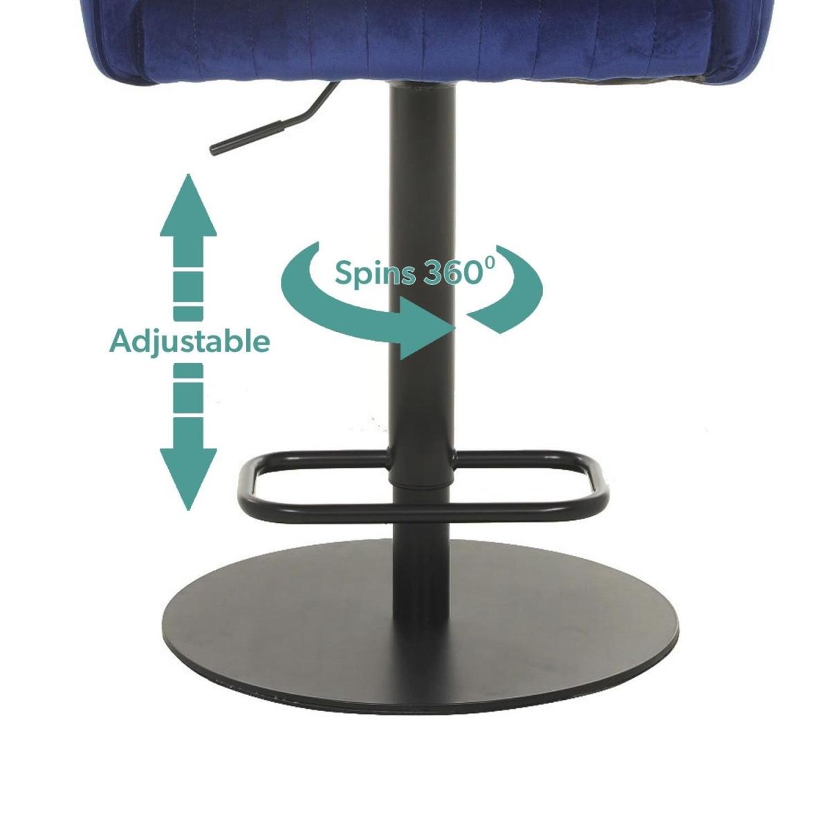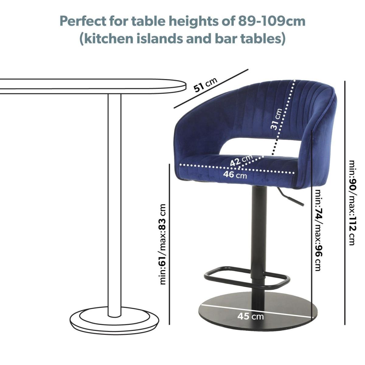 This bundle includes: 2 x Curved Navy Velvet Adjustable Bar Stools with Backs - Runa Features we love Adjustable bar stools for bar tables or kitchen islands Upholstered in soft, navy velvet fabric Gas lift mechanism makes it easy to adjust the height Convenient footrest gives added comfort 360 swivel feature for extra versatility Suitable for bar table heights of 104-109cm, please measure before purchasing All about me These navy velvet bar stools is the perfect addition to your kitchen, bar or dining space. The adjustable feature means it suitable for most table or island sizes and can be used wherever you like! The convenient footrest and foam filling within the seat makes these stools comfortable and the perfect place to perch for a quick drink at the bar or to eat breakfast in the kitchen. Upholstered in quality navy blue velvet, this stool has an expensive look and feel and is perfect for any modern kitchen or dining space. Not only does these bar stools look good, but the black base & footrest is made of iron meaning its durable and stands the test of time. Need to know Dimensions:W56 x D51 x H90-112 cm Package dimensions: W57 x D51 x H42 cm Weight: 14.35kg Colour: Navy blue and black Material: Velvet and solid iron Assembly required: Yes