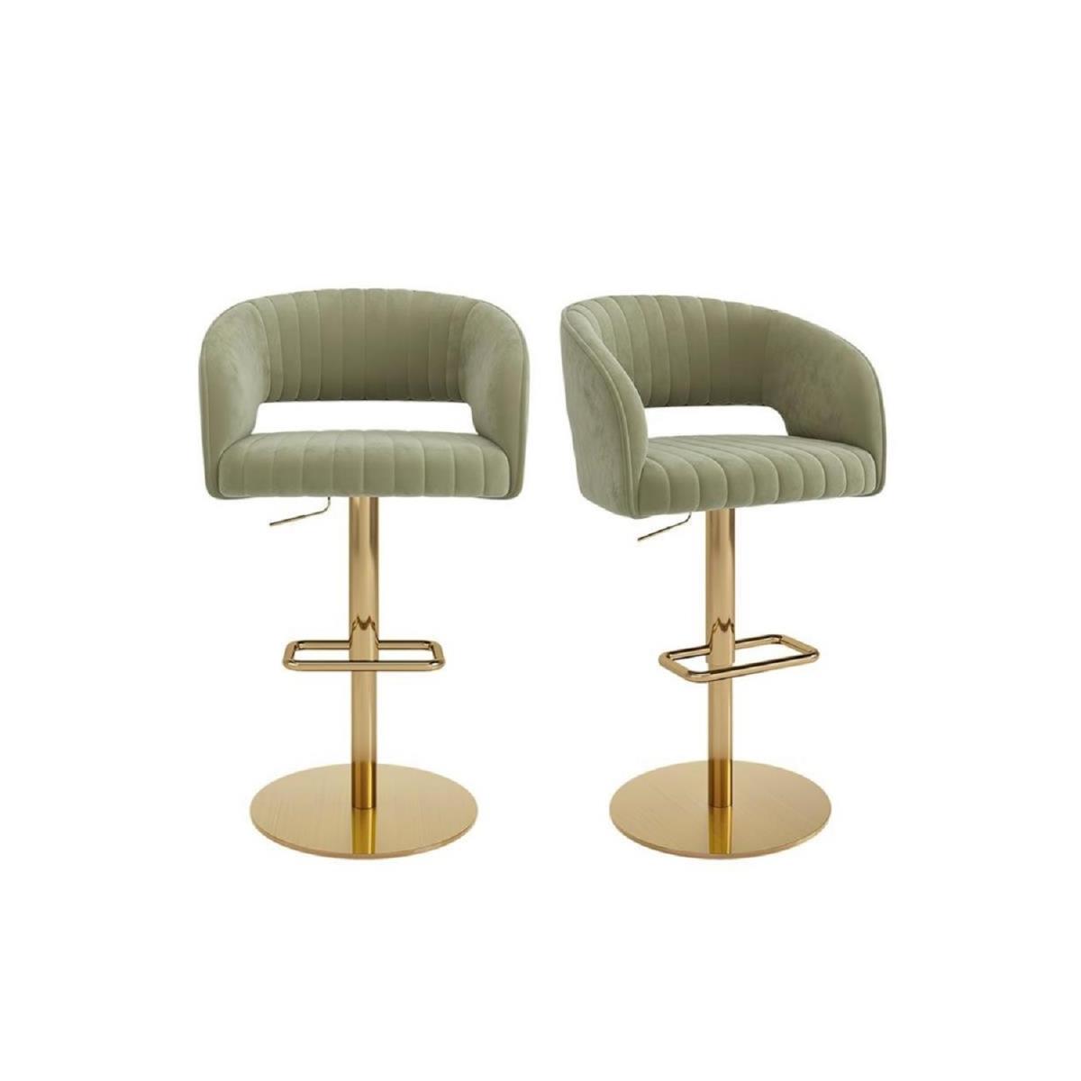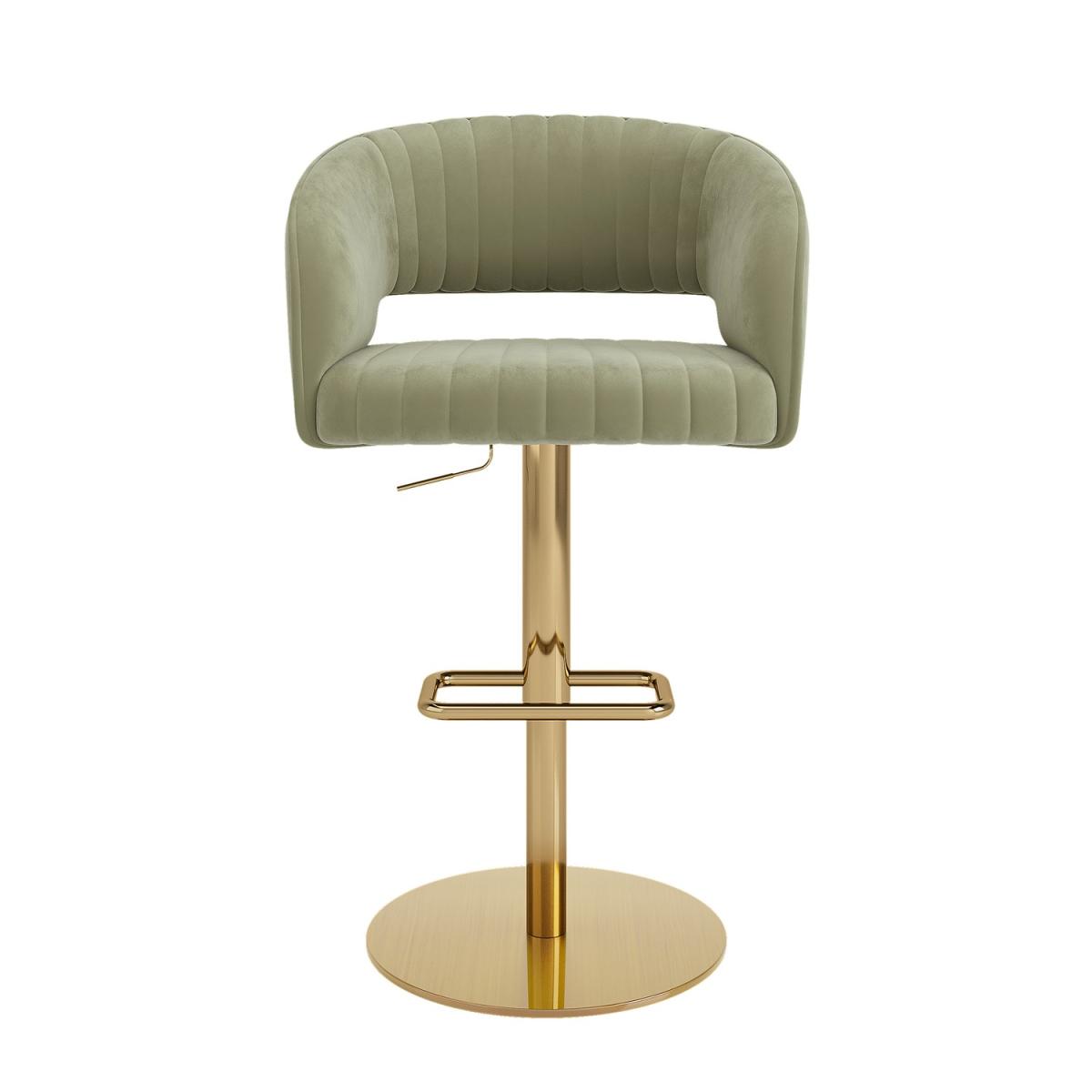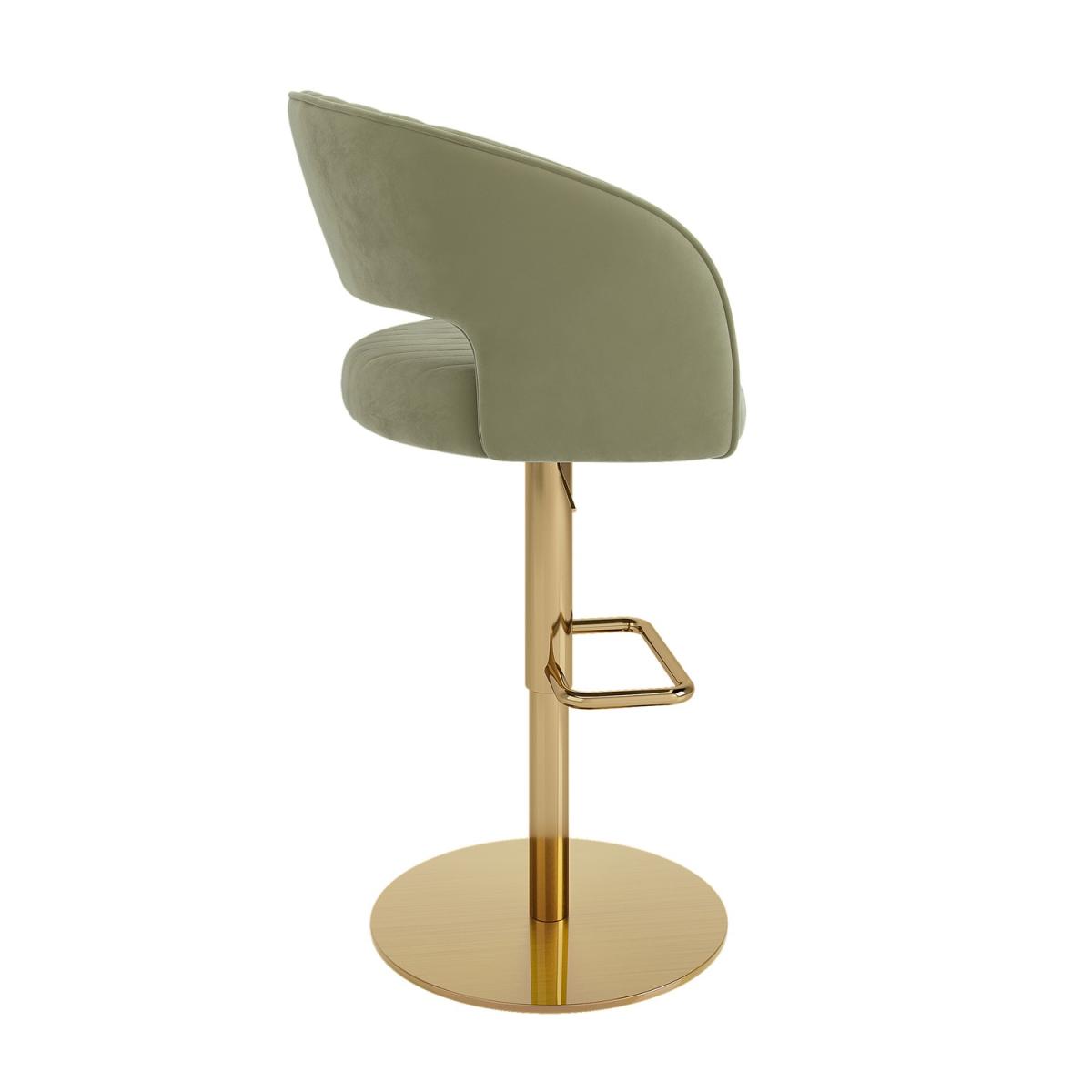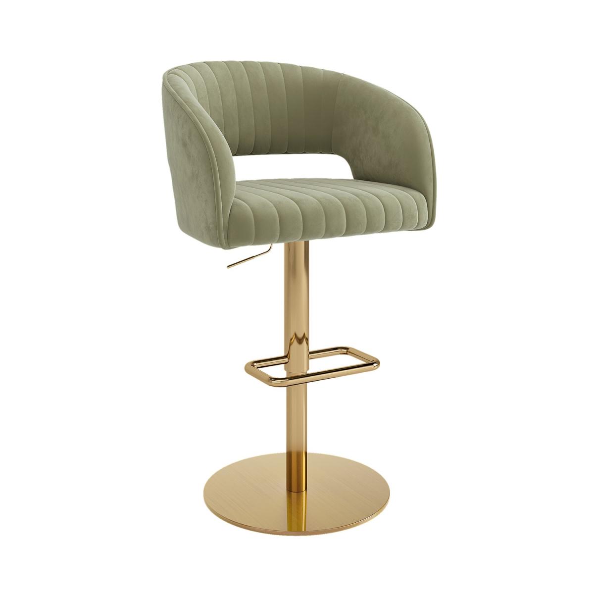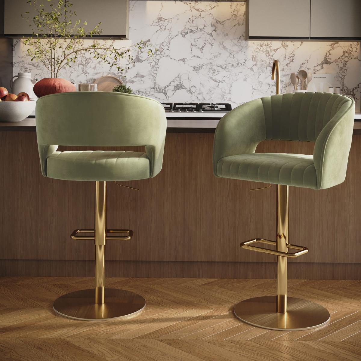 The Sage Matt Velvet Adjustable Bar Stool is the perfect fusion of style, comfort, and practicality, making it an ideal addition to any modern kitchen or bar area. Upholstered in luxurious sage matt velvet, this bar stool offers a rich texture and refined visual appeal. Featuring a gas lift mechanism, you can effortlessly adjust the height to suit standard bar tables or kitchen counters, while the 360-degree swivel allows for easy movement. The foam-filled seat and supportive backrest provide enhanced comfort, making this stool perfect for long meals, drinks, or casual work sessions. The brushed gold finish on the base and footrest adds a glamorous touch that feels both current and timeless. Elevate your kitchen or home bar with the Sage Matt Velvet Adjustable Bar Stools, a stylish blend of comfort, elegance, and functionality. Upholstered in high-quality sage matt velvet, this stool brings a soft, contemporary touch to your space, while the brushed gold base and footrest introduce an element of luxury. The solid iron base provides lasting durability, and a smooth height-adjustable gas lift makes it easy to customise your seating position. Whether you’re entertaining or enjoying a quiet coffee, the 360-degree swivel offers seamless mobility, and the protective foot base ensures it’s safe for all floor types. With its muted sage hue and sleek metallic details, this bar stools is the perfect finishing touch for modern interiors with a refined edge.