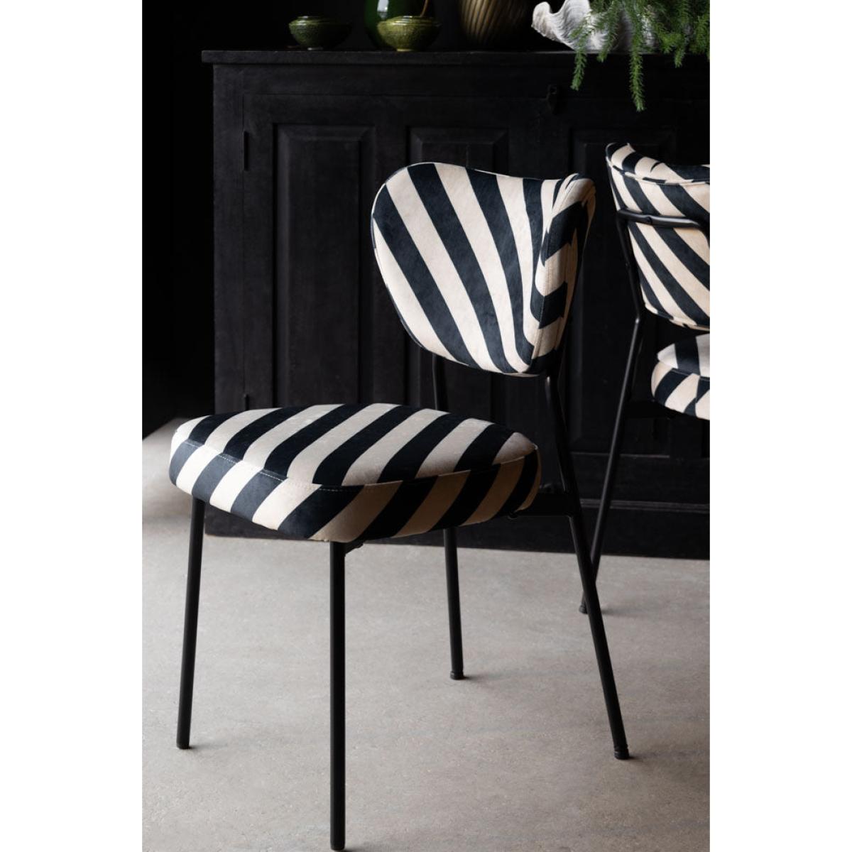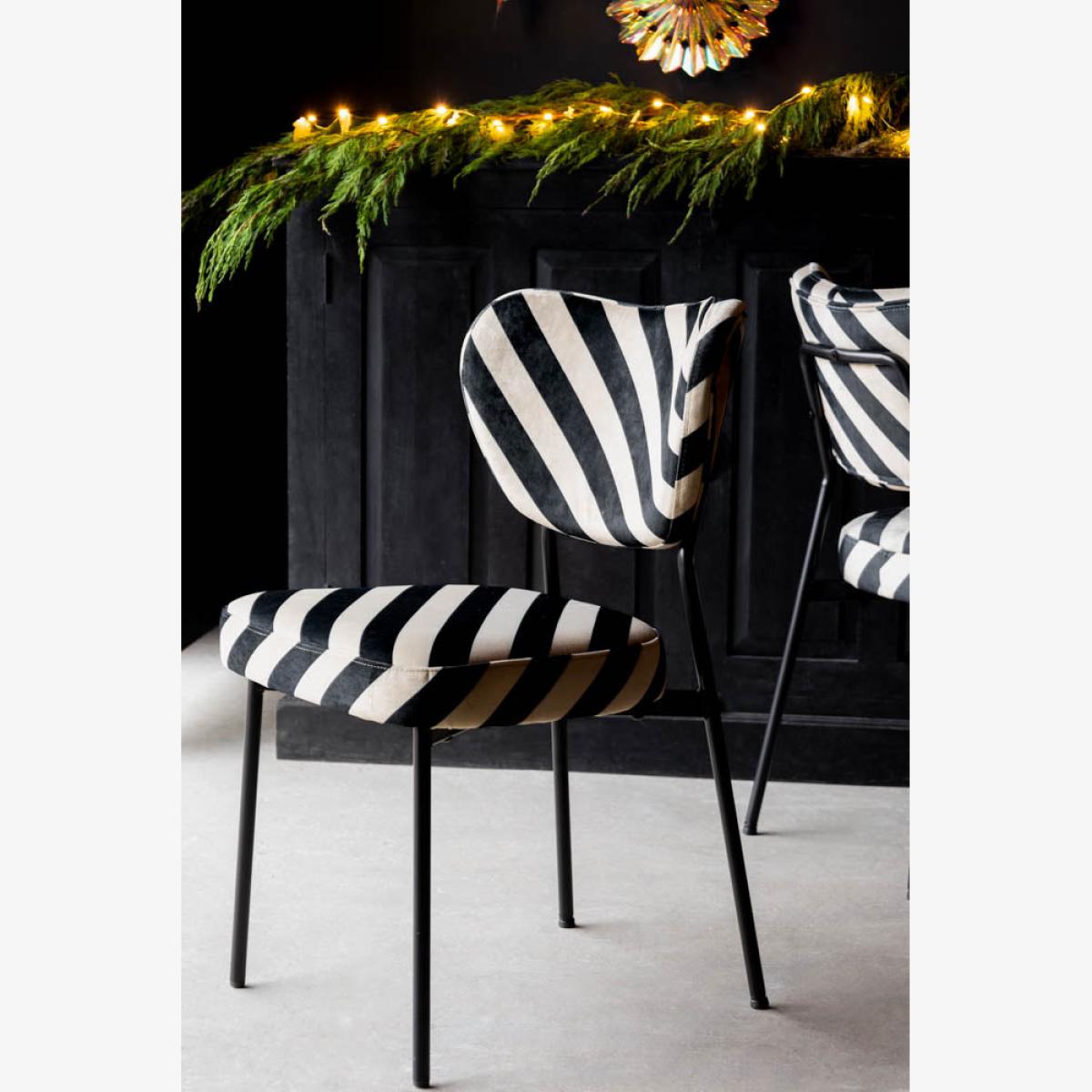 Add a fresh, modern touch to your dining area with this Set of 2 Stripe Velvet Dining Chairs. Featuring striking navy and white stripes, these chairs are perfect for adding a pop of pattern to your space. Upholstered in sumptuous velvet with a curved backrest for extra comfort, they offer the best of style and support. Built on a sleek black metal frame and arriving fully assembled with floor protectors, they're both practical and easy on the eyes. Ready to use straight out of the box, these chairs will bring a bold, contemporary edge to your dining table in just 7 days. - Set Of 2 Dining Chairs in Stripe Velvet- Measures: H84cm x W48cm x D56cm- Dining chair fabric: Velvet with blue and white stripes- Arrives fully assembled- Available in 7 days