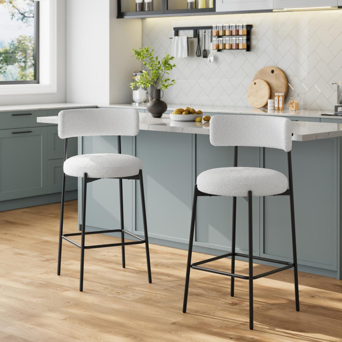 These white fabric bar stools are a versatile addition to both modern and classic kitchen/dining spaces. I love how their neutral colour makes them easy to style with a variety of colour schemes, from soft pastels to bold, colourful accents. They work particularly well in contemporary interiors, adding a touch of understated elegance without overpowering the space. For styling tips, consider pairing them with a wooden or marble countertop to create a balanced look, and use cushions or throws in contrasting colours or textures to add cosy detail. Practical details like their fabric seats make them more comfortable for longer sits, but ensure the fabric is treated for easy cleaning if you’re planning to have them in a busy, family-friendly environment.