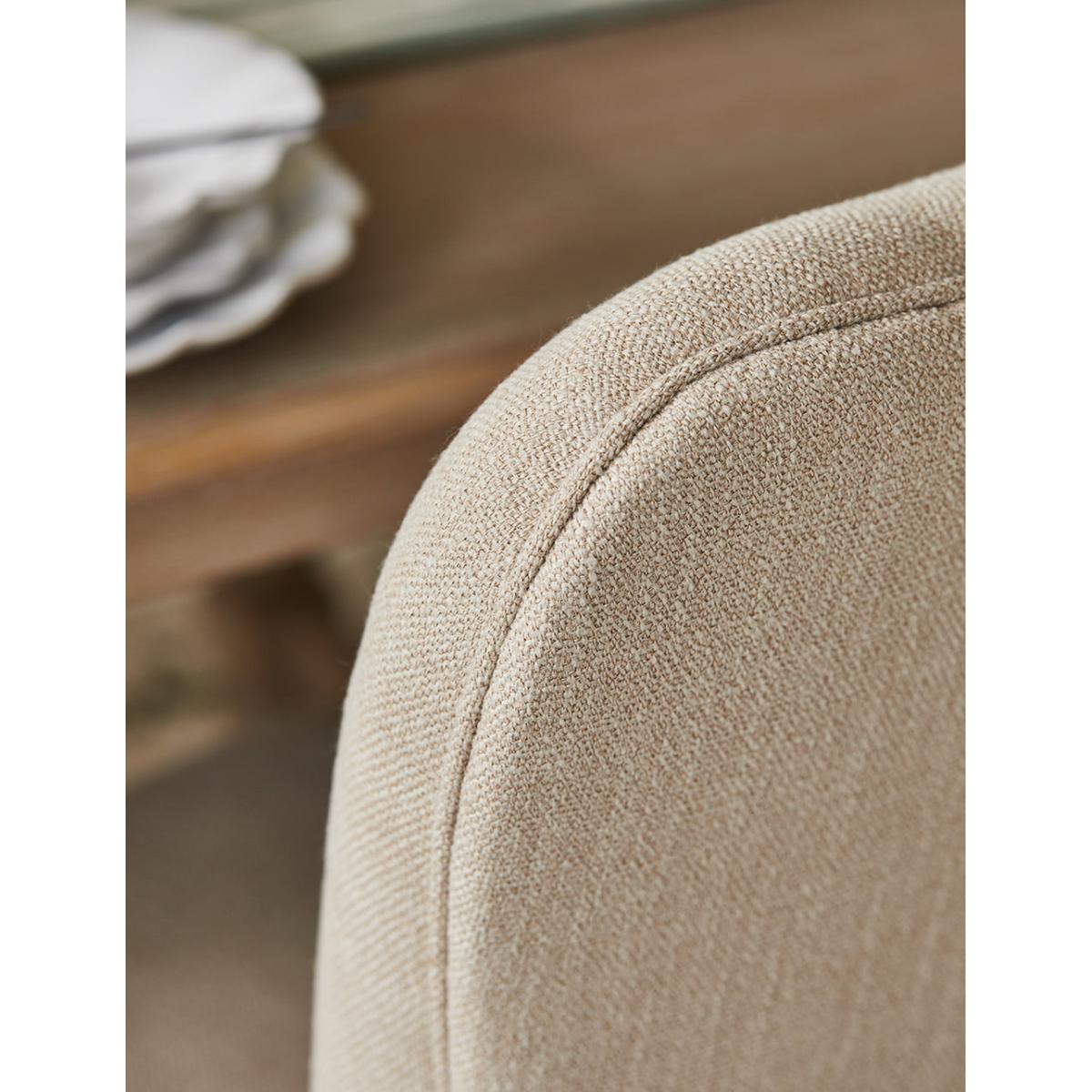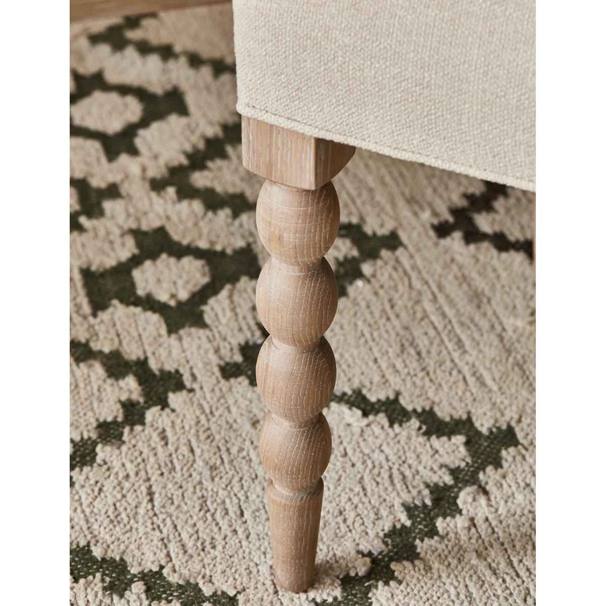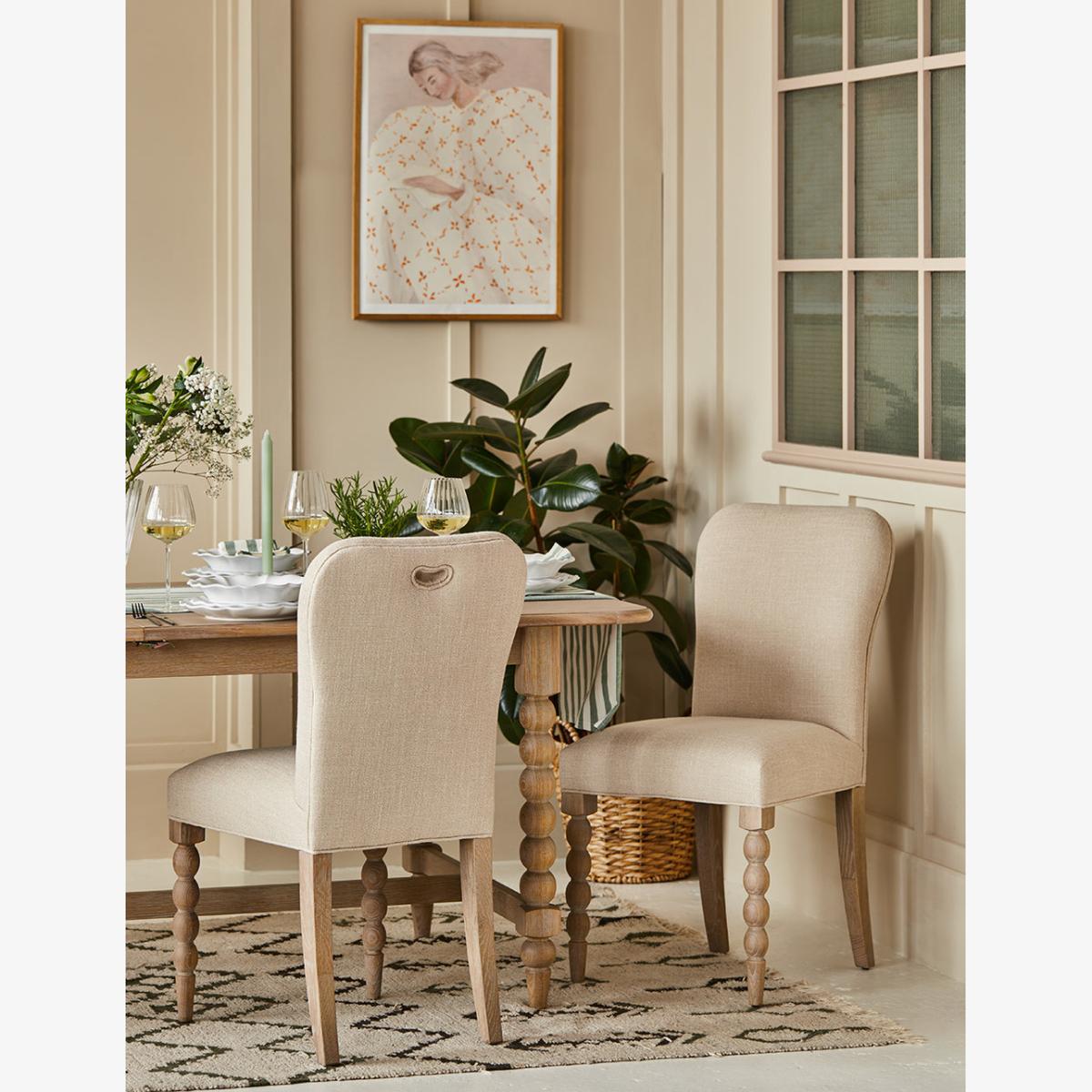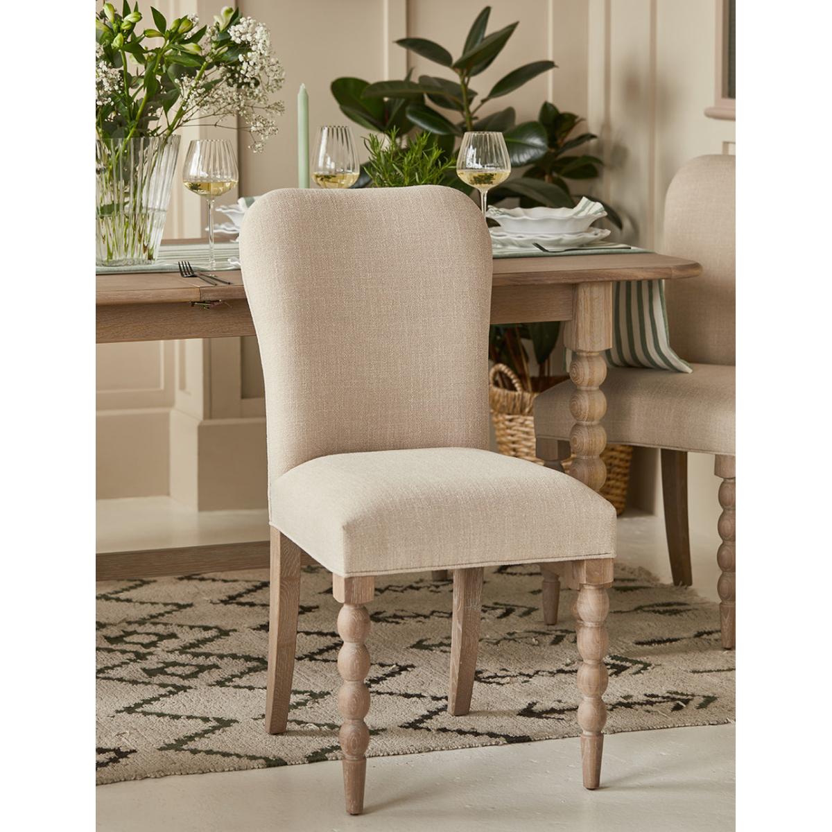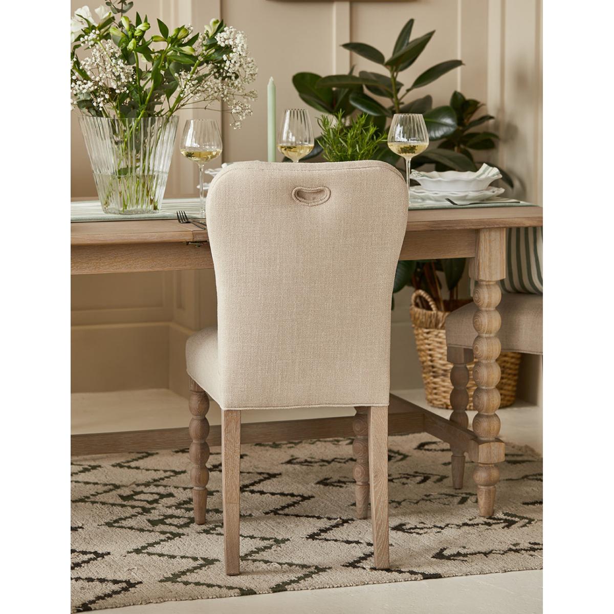 Our Bobbin Dining Chairs can compliment any home aesthetic. Featuring a fully upholstered seat and beautiful oak legs, these stunning dining chairs will make a classy addition to any dining room. Playing on a classic look our chairs emphasis the hand-crafted bobbin detail down each leg. The Frances Bobbin Dining Chairs are made using beautiful oak with a very subtle lime wash tone giving a mellow finish with biscuit coloured fabric for the seat. For more matching styles, check out our Bobbin Side Table, Bobbin Dining Table and Bobbin Floor Lamp. Compliment any aesthetic with our Bobbin Dining Chairs