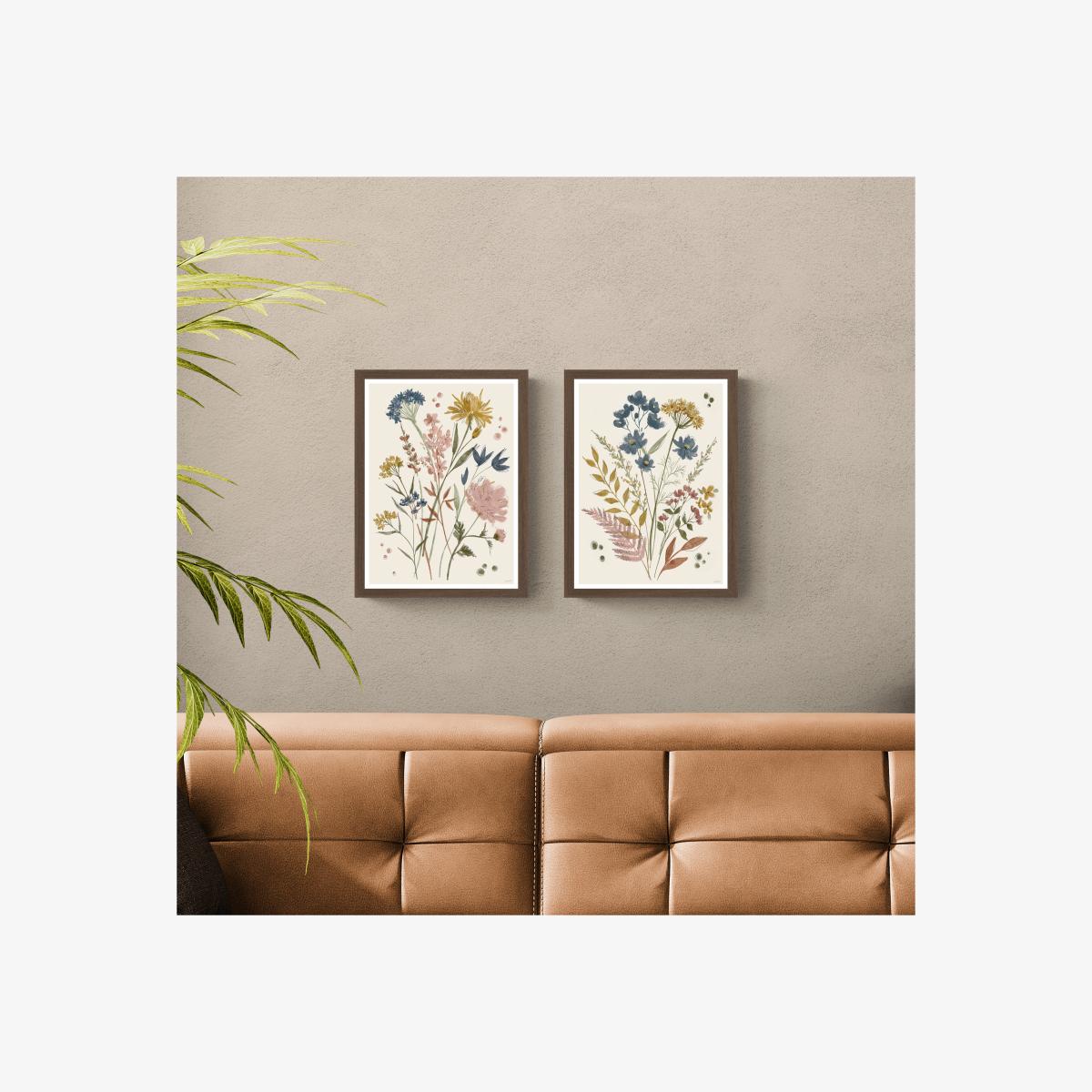 * Country style illustrations * Set of 2 * Framed and ready to display Bring a touch of rustic charm to your walls with this beautifully coordinated set of floral prints by Anne Tavoletti. Delicate wildflowers in soft pastel tones are set against a cream background, with muted blue, pink, yellow, and green accents adding a subtle pop of colour. The textured finish and narrow white border enhance the artwork’s natural elegance, while the dark walnut-coloured frames provide a timeless, vintage-inspired touch. Designed without glass for a softer, more organic feel, these prints are ready to hang.