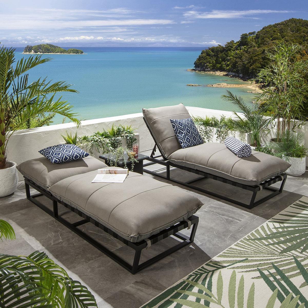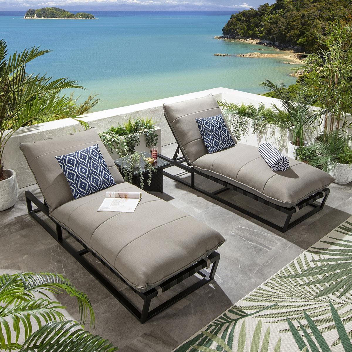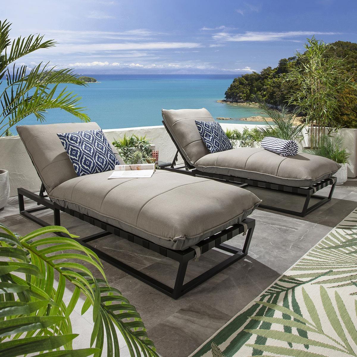 Experience luxury with the Ocean garden loungers. Sink into soft, thick cushions made from beige Sunbrella marine fabric. Whether reading a book or soaking up the sun, this cushioned sun lounger is perfect for any outdoor setting. Supported by a weatherproof aluminium frame, enjoy this sun lounger season after season. The Ocean garden lounger is built to last with frames made from weather-proof aluminum. You won't have to worry about rusting or corrosion, even if it's left outside in the elements. The aluminum frame is also lightweight, making it easy to move the lounger around your garden or patio. Covered in premium Sunbrella fabric, these cushioned sun loungers are designed to withstand the elements. Whether it's hot sun, heavy rain or even snow, the premium Sunbrella fabric will hold up to any weather conditions. The modern elegant beige colour of the lounger will complement any outdoor decor, making it a great addition to your garden or patio. With an adjustable back, you can find the perfect angle for lounging in the sun or reading a book. Whether you prefer a fully reclined position or a more upright angle, the adjustable back makes it easy to find the perfect position for your comfort. The lounger is also mold and mildew resistant, so you won't have to worry about any nasty surprises when you go to use it. It's even bleach cleanable, making it easy to keep the lounger looking as good as new. W212cm D84cm H38cm Sunbrella marine fabric Set of 2 Garden Sun Loungers