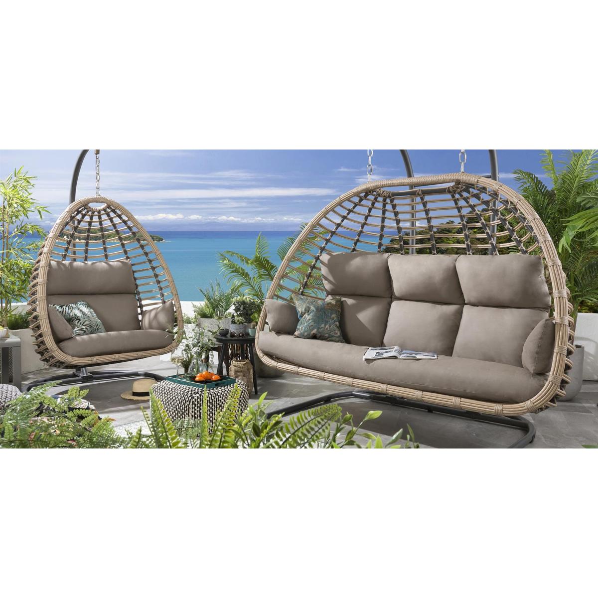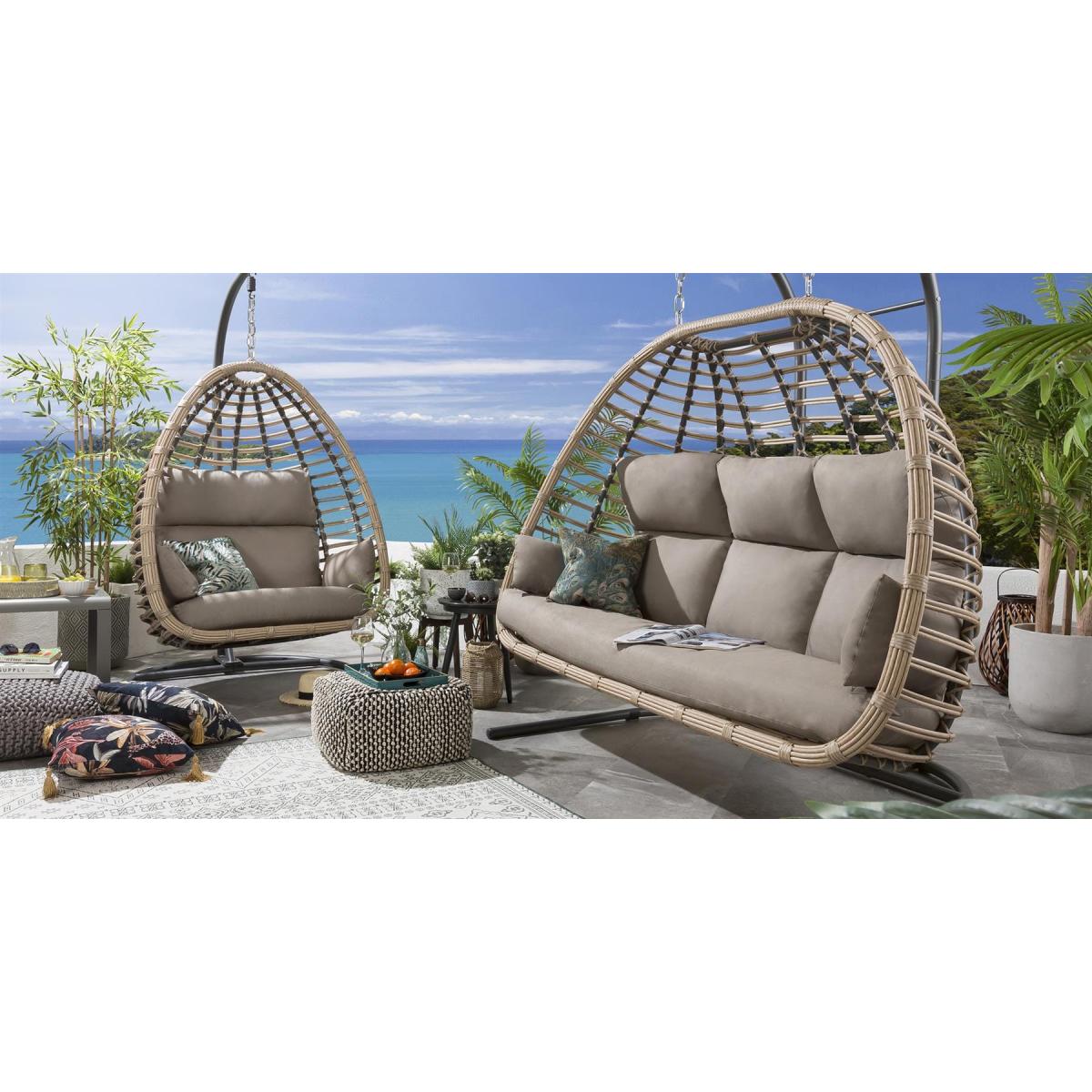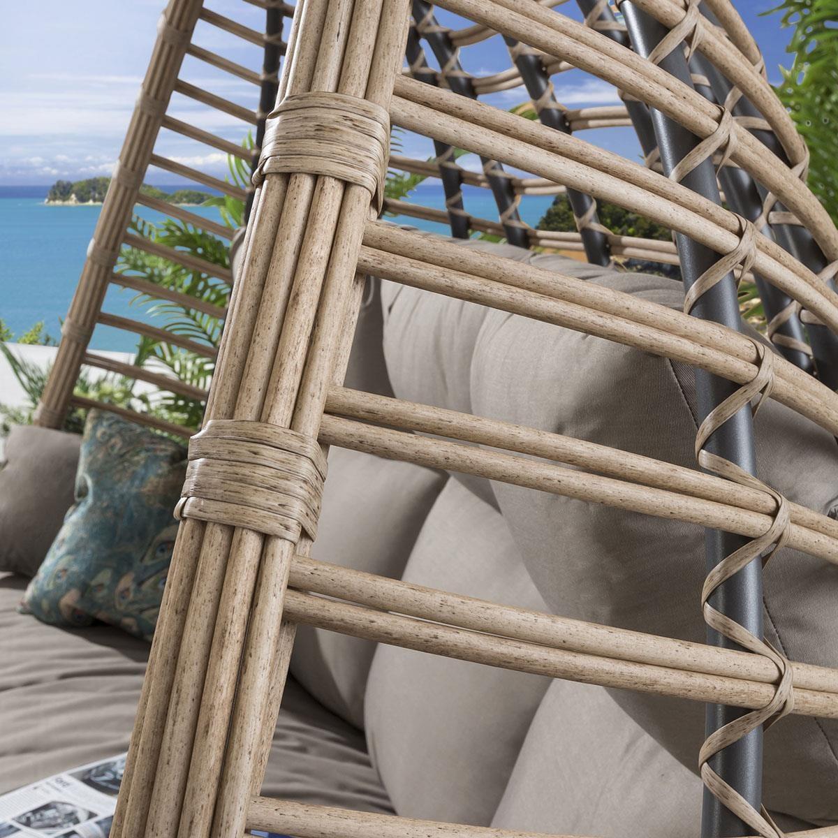 The Quatropi Bamboo style hanging chairs and sofas make a stunning sculptural statement in any garden. The beautiful teardrop shapes married with the strong horizontal bars provide a breathtaking image from any angle. All 2 and 3 seater sofas are available in either our coffee or charcoal colourways whist our single hanging chairs coming in our coffee, green, blue and grey colourways. Our hanging daybed sleeper sofas are totally unique in the market. The stunning teardrop shape not only looks amazing but provides a wider, flatter cocoon type seat which lends inself perfectly to lying flat with over 6ft 6 inches of internal width or sharing the space with a loved ones. The cushions have been developed with super-thick foam base cushions, split lumber / headrest soft fibre-filled back cushions and moveable armrest / scatter cushions. All cushion covers can be removed and are machine washable. The basket of the hanging chair is fully built for maximum stability, the frame comes boxed and does require minimal assembly and you may need a hand with hanging the basket on the frame. Our adjustable chain allows for different sitting heights, and the plastic support feet are moveable to help balance for uneven surfaces. For 10 years Quatropi have been the leading supplier of luxury hanging chairs in the UK. Our focus always has and always will be on quality first yet comfort, style and cost must also meet our stringent standards. With all our hanging chairs, everything you need comes as standard including the super strong frame, luxury cushions and even the winter cover. Our entire range of hanging chairs now have sofa style foam base cushions providing superior comfort and a uniquely stylish look. Remember that none of our designs are available elsewhere and this latest generation of chairs keeps us at the very top of the premium market. W320cm D125cm H207cm Free Winter Cover Max Weight Capacitys: (175kgs) (100kgs)