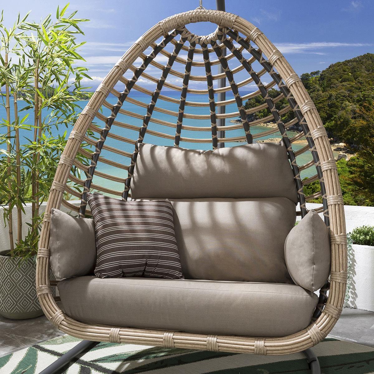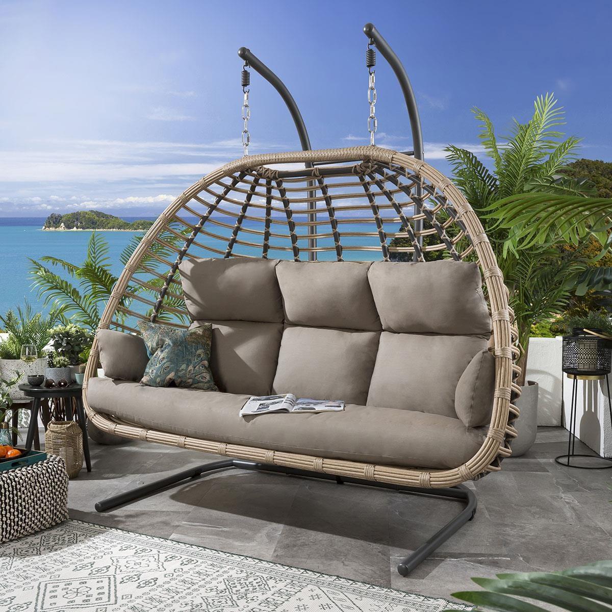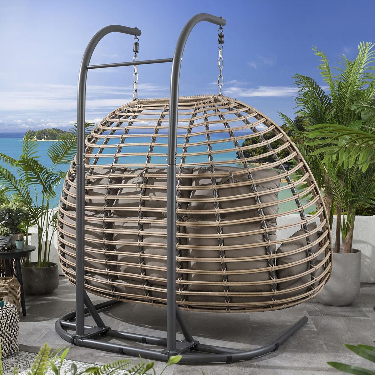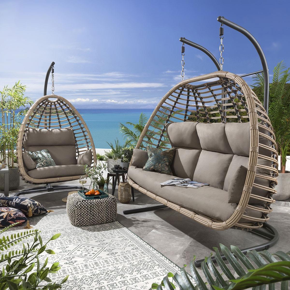 The Quatropi Bamboo style hanging chairs and sofas make a stunning sculptural statement in any garden. The beautiful teardrop shapes married with the strong horizontal bars provide a breathtaking image from any angle. All 2 and 3 seater sofas are available in either our coffee or charcoal colourways whist our single hanging chairs coming in our coffee, green, blue and grey colourways. Our hanging daybed sleeper sofas are totally unique in the market. The stunning teardrop shape not only looks amazing but provides a wider, flatter cocoon type seat which lends inself perfectly to lying flat with over 6ft 6 inches of internal width or sharing the space with a loved ones. The cushions have been developed with super-thick foam base cushions, split lumber / headrest soft fibre-filled back cushions and moveable armrest / scatter cushions. All cushion covers can be removed and are machine washable. The basket of the hanging chair is fully built for maximum stability, the frame comes boxed and does require minimal assembly and you may need a hand with hanging the basket on the frame. Our adjustable chain allows for different sitting heights, and the plastic support feet are moveable to help balance for uneven surfaces. For 10 years Quatropi have been the leading supplier of luxury hanging chairs in the UK. Our focus always has and always will be on quality first yet comfort, style and cost must also meet our stringent standards. With all our hanging chairs, everything you need comes as standard including the super strong frame, luxury cushions and even the winter cover. Our entire range of hanging chairs now have sofa style foam base cushions providing superior comfort and a uniquely stylish look. Remember that none of our designs are available elsewhere and this latest generation of chairs keeps us at the very top of the premium market. W320cm D125cm H207cm Free Winter Cover Max Weight Capacitys: (175kgs) (100kgs)