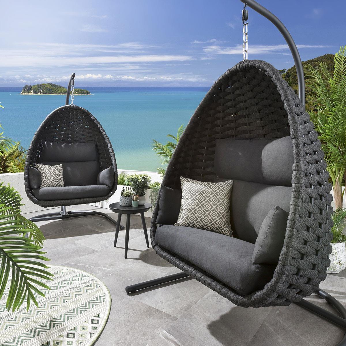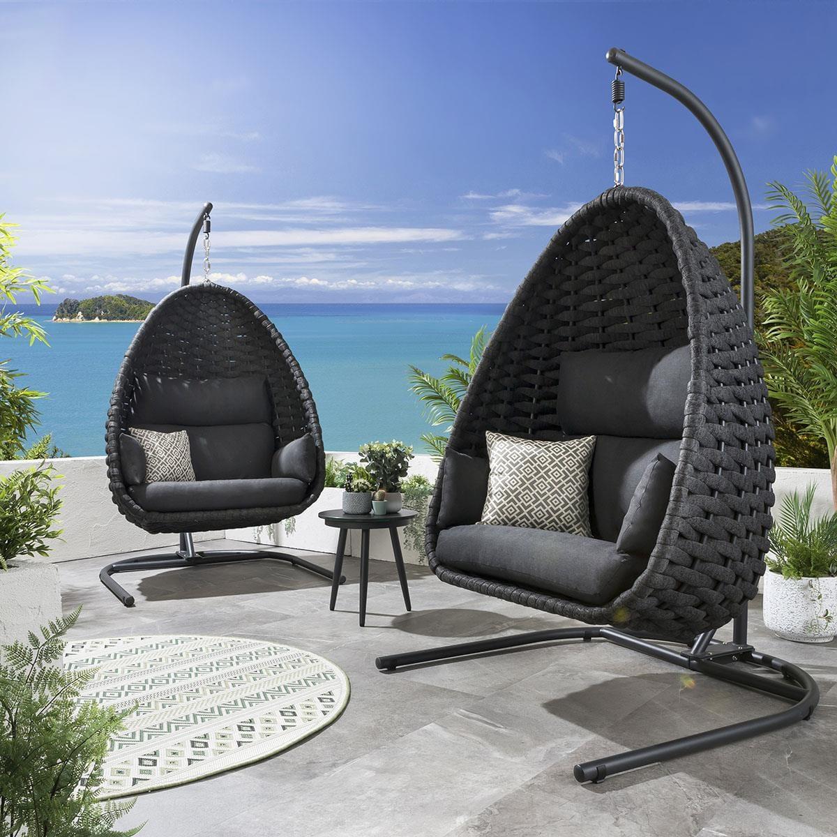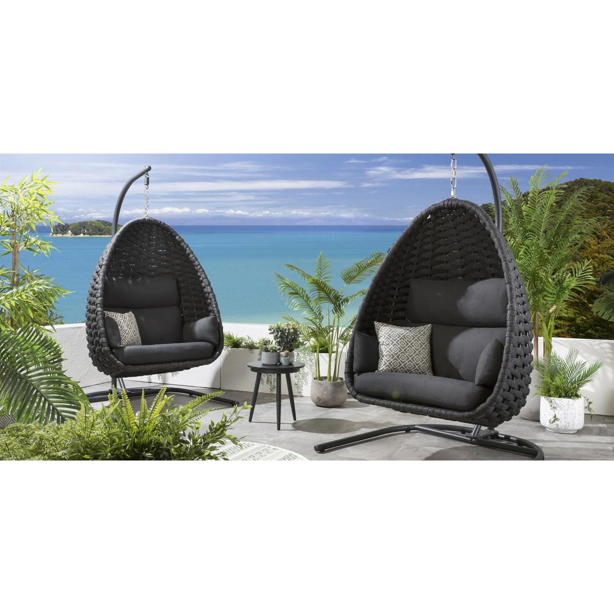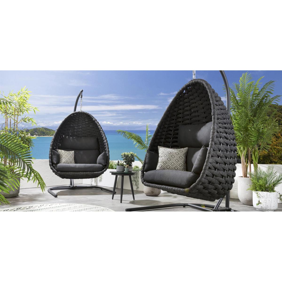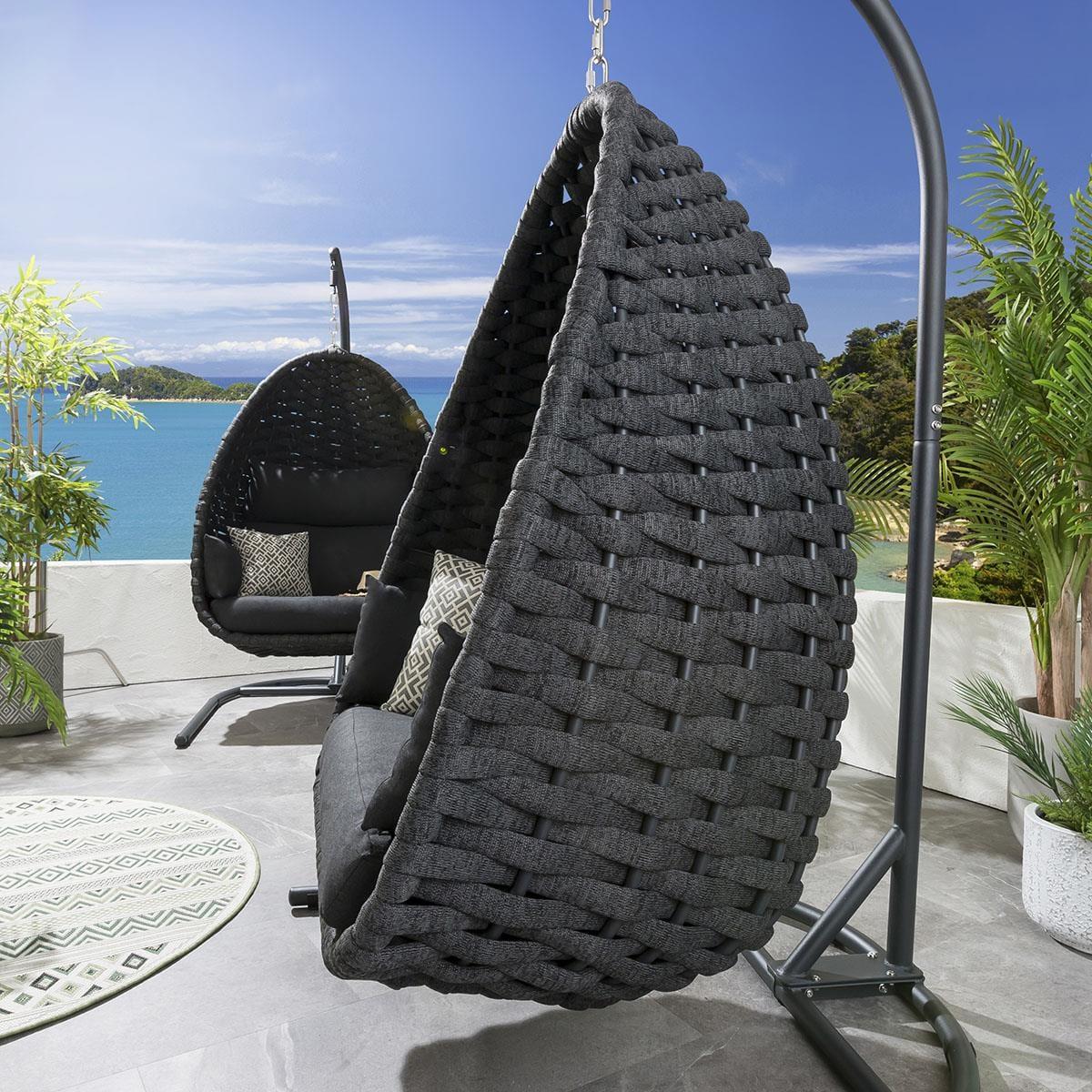 Our thick rope hanging chairs and sofas offer a real sanctuary of cocooned peace and tranquillity due to the tight almost solid density of the weaving and the thickness of the rope used. This also gives incredible sound deadening properties adding to the immersive experience. All 3 sizes are available in either our coffee or charcoal colourways. Our single hanging chairs are totally unique in the market. The stunning teardrop shape not only looks amazing but provides a wider, flatter cocoon type seat which lends inself perfectly to curling up and getting cozy. The cushions have been developed with super-thick foam base cushions, split lumber / headrest soft fibre-filled back cushions and moveable armrest / scatter cushions. All cushion covers can be removed and are machine washable. The basket of the hanging chair is fully built for maximum stability, the frame comes boxed and does require minimal assembly and you may need a hand with hanging the basket on the frame. Our adjustable chain allows for different sitting heights, and the plastic support feet are moveable to help balance for uneven surfaces. Remember that none of our designs are available elsewhere and this latest generation of chairs keeps us at the very top of the premium market. W230cm D125cm H207cm Free Winter Cover Max Weight Capacitys: (100kgs) - (100kgs)