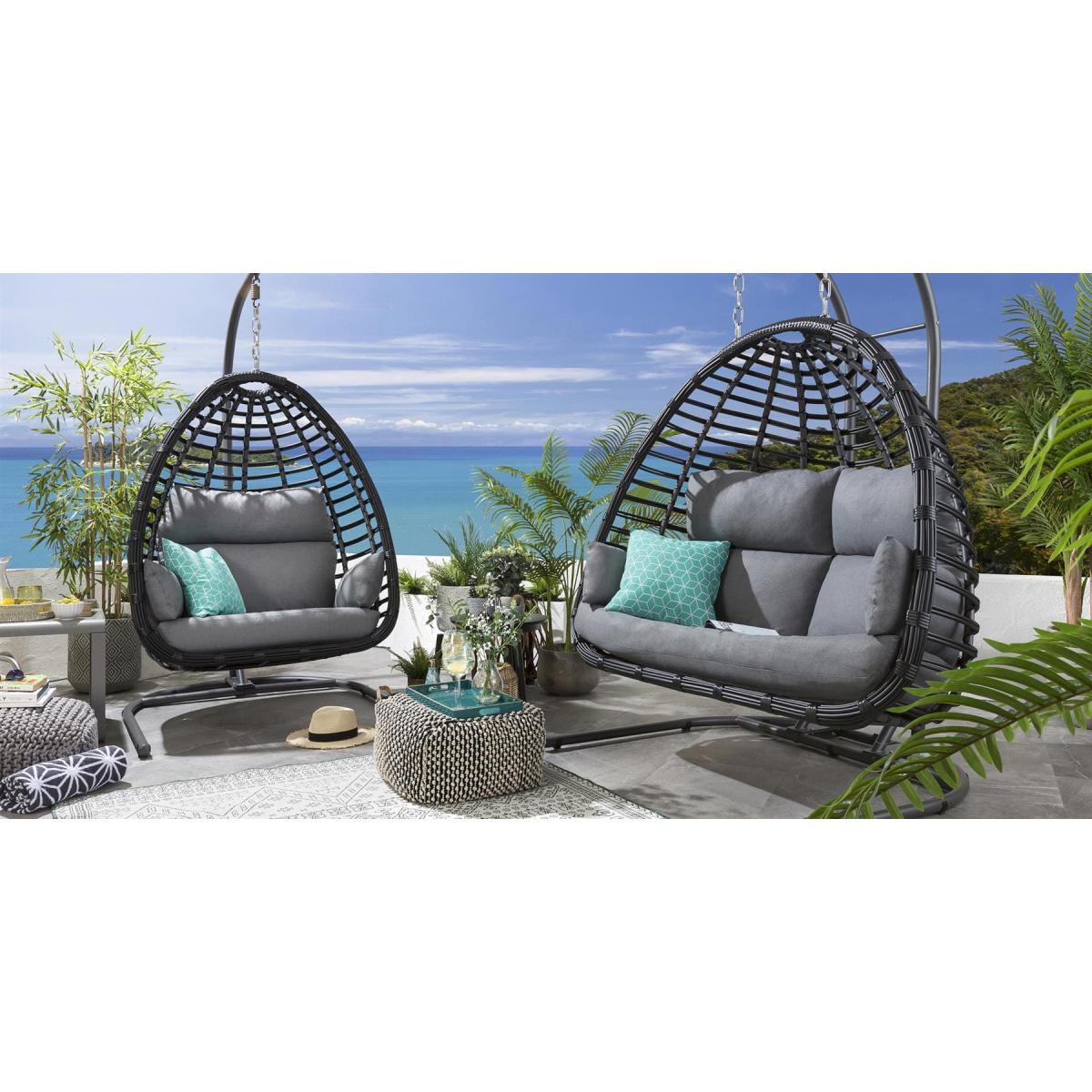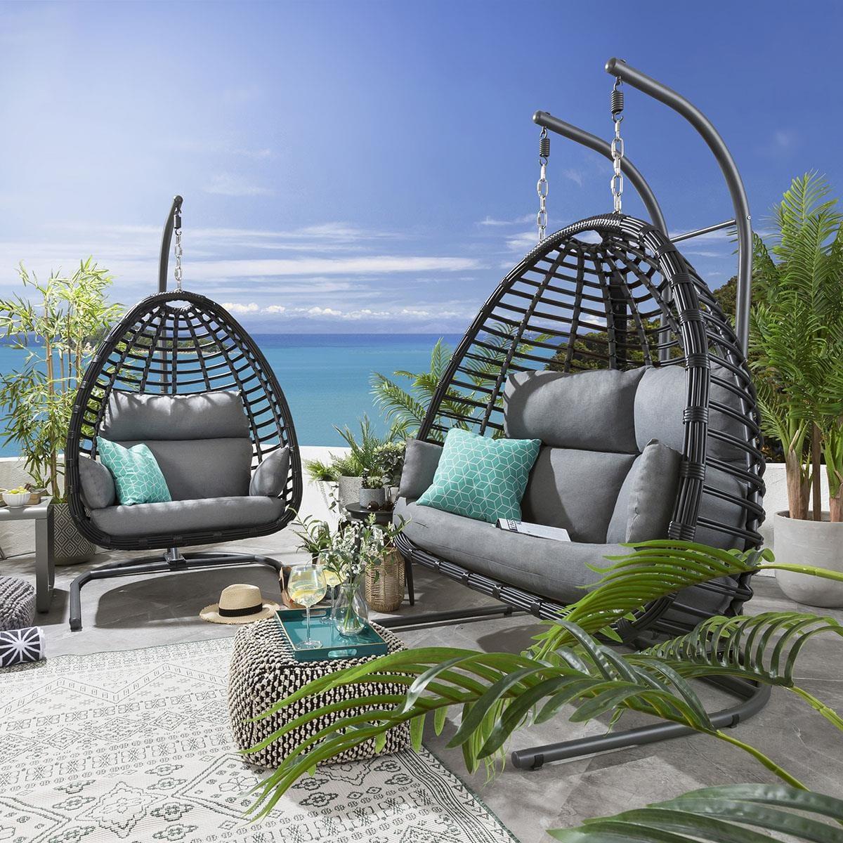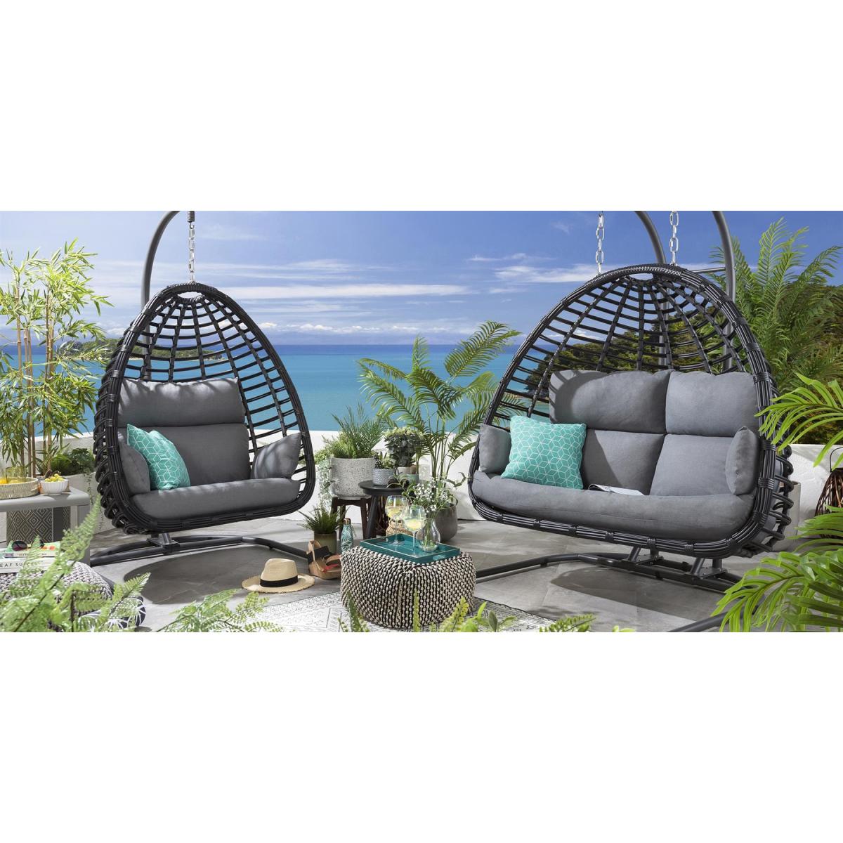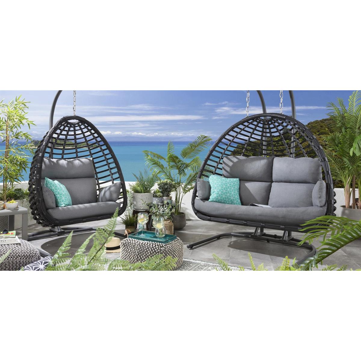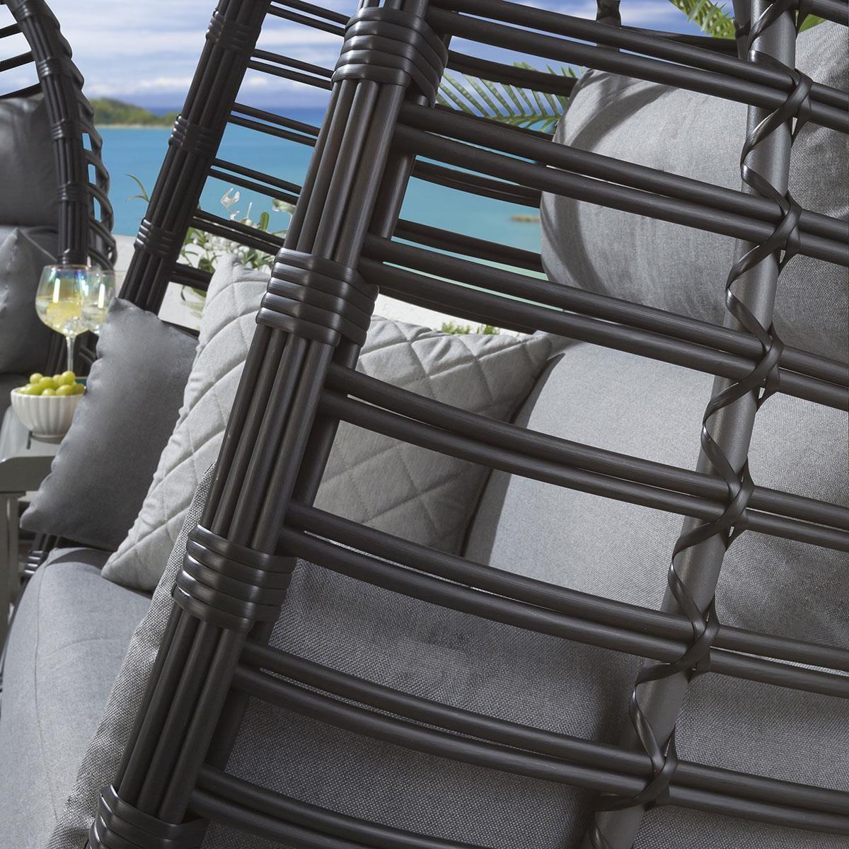 The Quatropi Bamboo style hanging chairs and sofas make a stunning sculptural statement in any garden. The beautiful teardrop shapes married with the strong horizontal bars provide a breathtaking image from any angle. All 2 and 3 seater sofas are available in either our coffee or charcoal colourways whist our single hanging chairs coming in our coffee, green, blue and grey colourways. Our double hanging sofas are totally unique in the market. The stunning teardrop shape not only looks amazing but provides a wider, flatter cocoon type seat which lends inself perfectly to putting your feet up or sharing the space with a loved one. The cushions have been developed with super-thick foam base cushions, split lumber / headrest soft fibre-filled back cushions and moveable armrest / scatter cushions. All cushion covers can be removed and are machine washable. The basket of the hanging chair is fully built for maximum stability, the frame comes boxed and does require minimal assembly and you may need a hand with hanging the basket on the frame. Our adjustable chain allows for different sitting heights, and the plastic support feet are moveable to help balance for uneven surfaces. For 10 years Quatropi have been the leading supplier of luxury hanging chairs in the UK. Our focus always has and always will be on quality first yet comfort, style and cost must also meet our stringent standards. With all our hanging chairs, everything you need comes as standard including the super strong frame, luxury cushions and even the winter cover. Our entire range of hanging chairs now have sofa style foam base cushions providing superior comfort and a uniquely stylish look. Remember that none of our designs are available elsewhere and this latest generation of chairs keeps us at the very top of the premium market. W275cm D125cm H207cm Free Winter Cover Max Weight Capacitys: (150kgs) (100kgs)