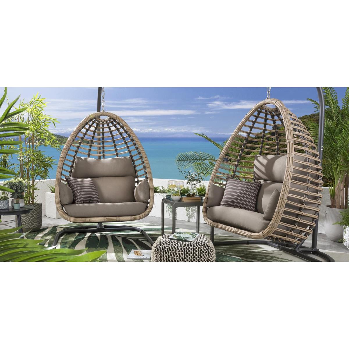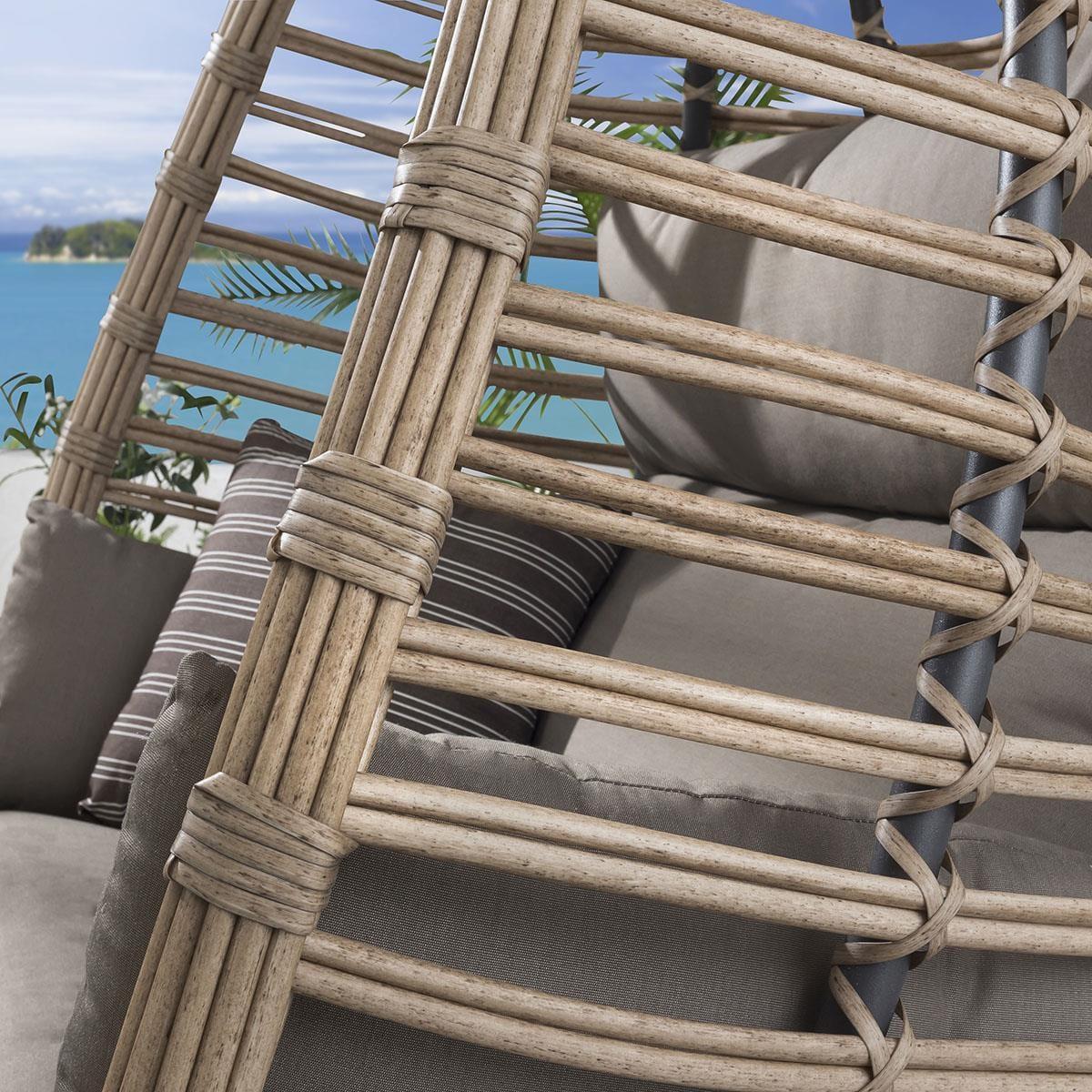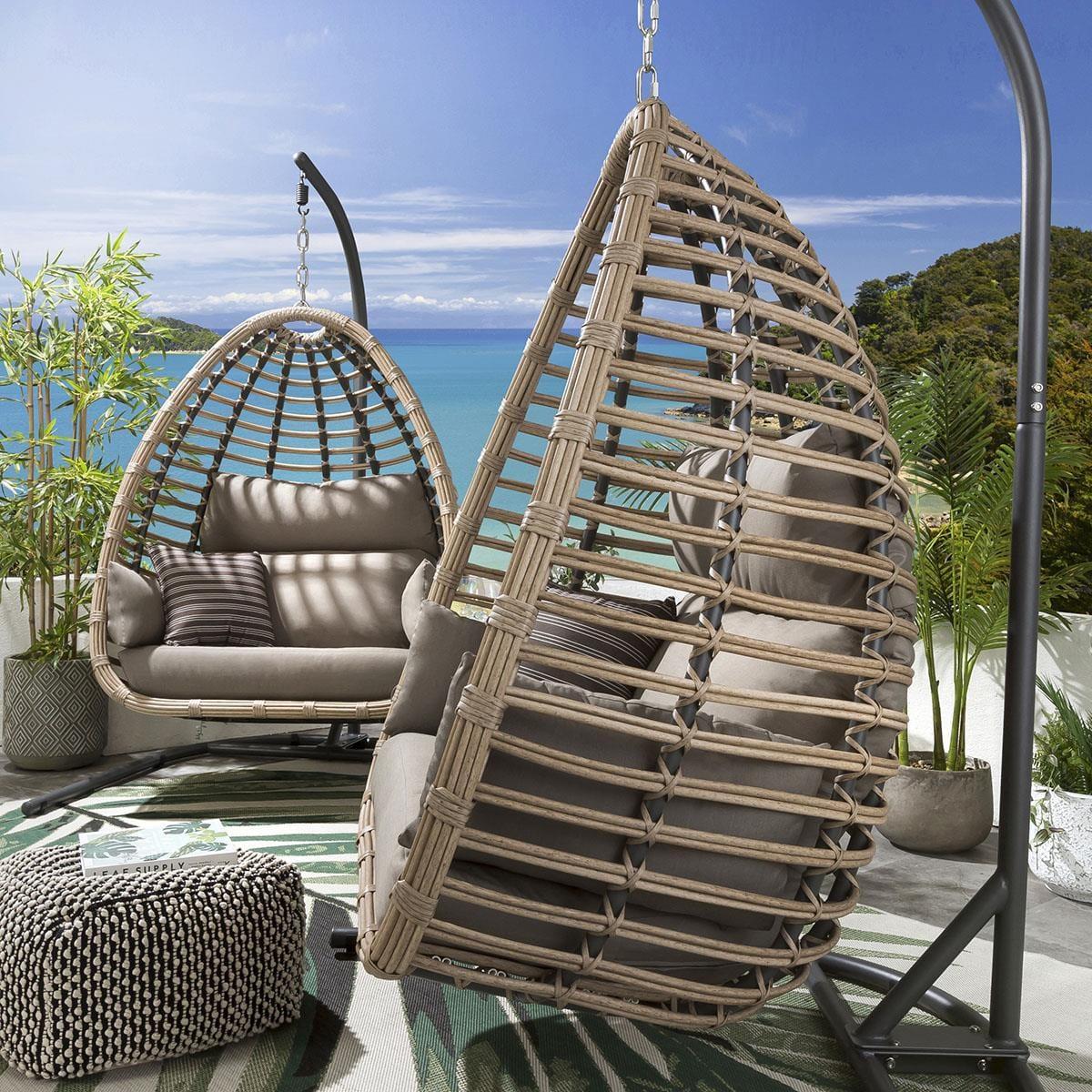 The Quatropi Bamboo style hanging chairs and sofas make a stunning sculptural statement in any garden. The beautiful teardrop shapes married with the strong horizontal bars provide a breathtaking image from any angle. All 2 and 3 seater sofas are available in either our coffee or charcoal colourways whist our single hanging chairs coming in our coffee, green, blue and grey colourways. Our single hanging chairs are totally unique in the market. The stunning teardrop shape not only looks amazing but provides a wider, flatter cocoon type seat which lends inself perfectly to curling up and getting cozy. The cushions have been developed with super-thick foam base cushions, split lumber / headrest soft fibre-filled back cushions and moveable armrest / scatter cushions. All cushion covers can be removed and are machine washable. The basket of the hanging chair is fully built for maximum stability, the frame comes boxed and does require minimal assembly and you may need a hand with hanging the basket on the frame. Our adjustable chain allows for different sitting heights, and the plastic support feet are moveable to help balance for uneven surfaces. For 10 years Quatropi have been the leading supplier of luxury hanging chairs in the UK. Our focus always has and always will be on quality first yet comfort, style and cost must also meet our stringent standards. With all our hanging chairs, everything you need comes as standard including the super strong frame, luxury cushions and even the winter cover. Our entire range of hanging chairs now have sofa style foam base cushions providing superior comfort and a uniquely stylish look. Remember that none of our designs are available elsewhere and this latest generation of chairs keeps us at the very top of the premium market. W230cm D125cm H207cm Free Winter Cover Max Weight Capacitys: (100kgs) - (100kgs)