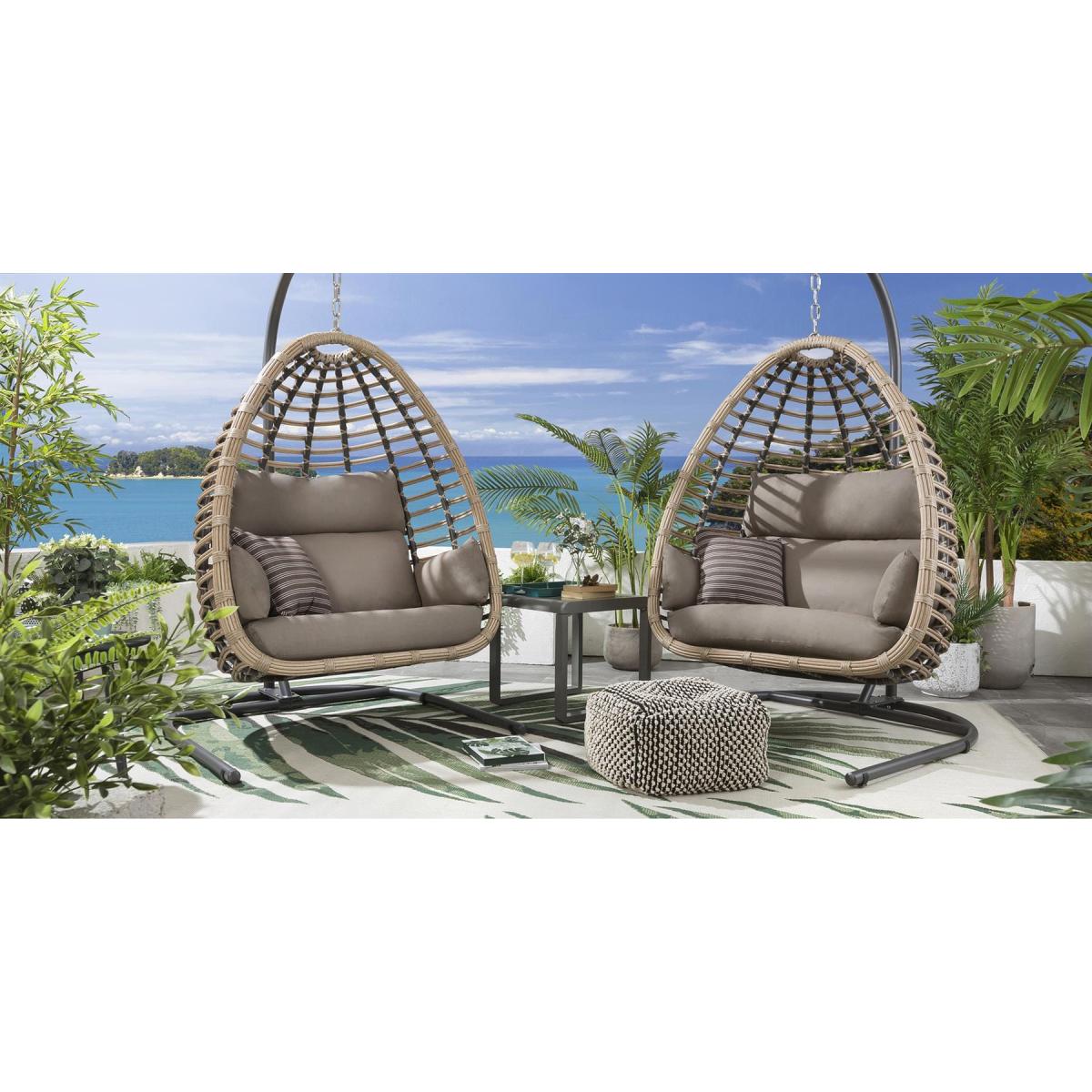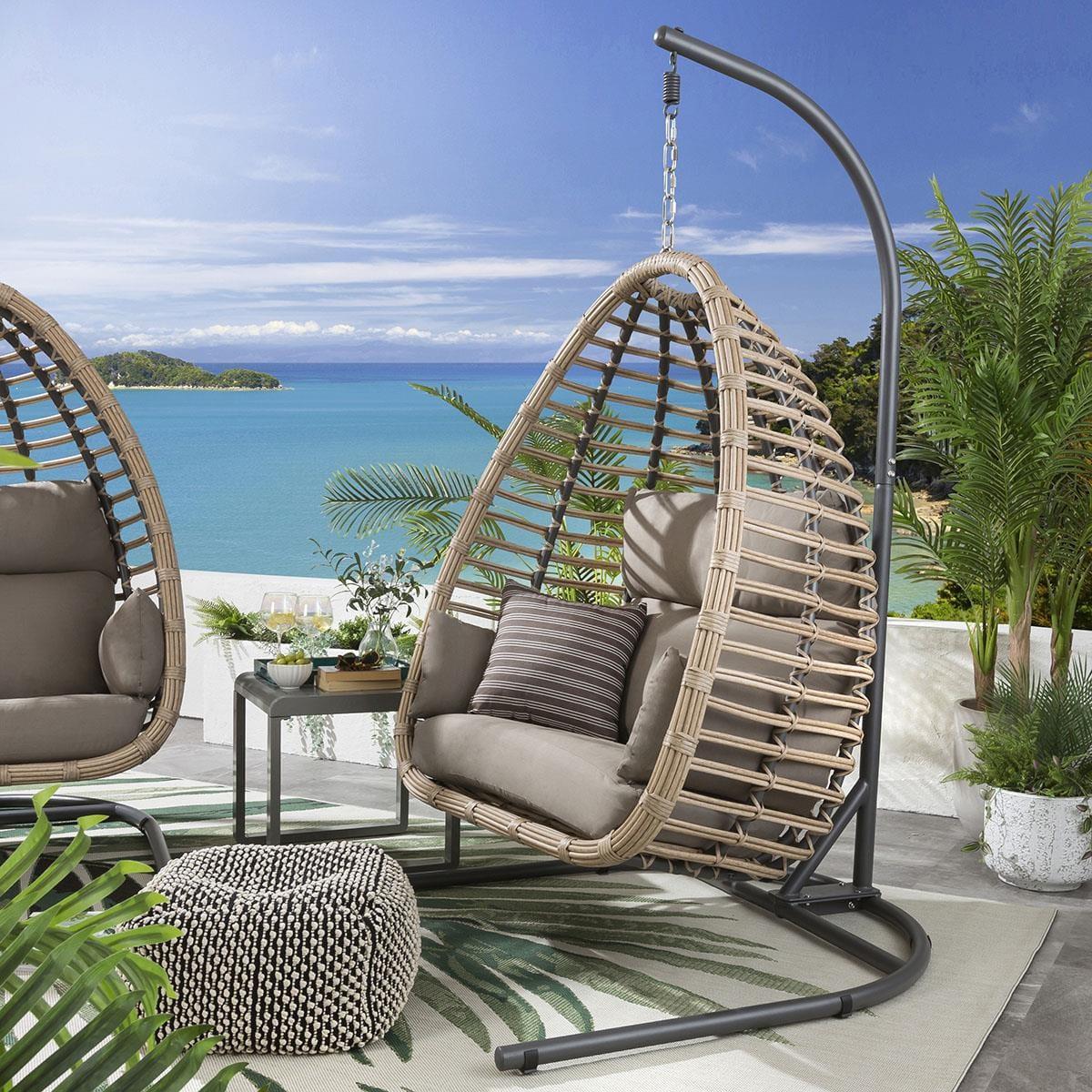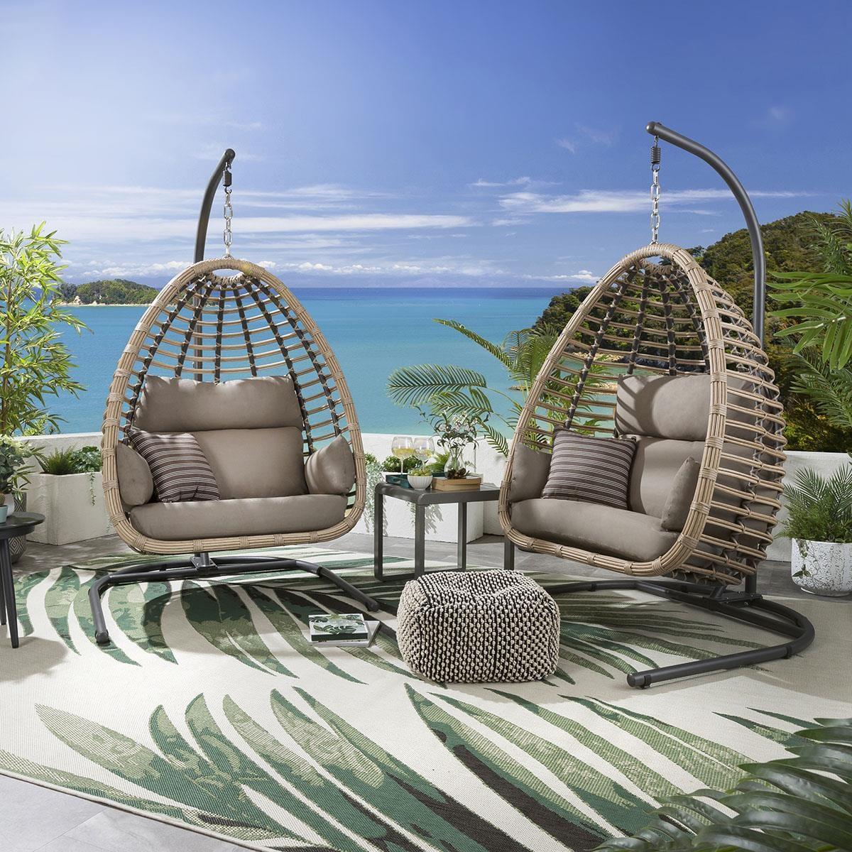The Quatropi Bamboo style hanging chairs and sofas make a stunning sculptural statement in any garden. The beautiful teardrop shapes married with the strong horizontal bars provide a breathtaking image from any angle. All 2 and 3 seater sofas are available in either our coffee or charcoal colourways whist our single hanging chairs coming in our coffee, green, blue and grey colourways. Our single hanging chairs are totally unique in the market. The stunning teardrop shape not only looks amazing but provides a wider, flatter cocoon type seat which lends inself perfectly to curling up and getting cozy. The cushions have been developed with super-thick foam base cushions, split lumber / headrest soft fibre-filled back cushions and moveable armrest / scatter cushions. All cushion covers can be removed and are machine washable. The basket of the hanging chair is fully built for maximum stability, the frame comes boxed and does require minimal assembly and you may need a hand with hanging the basket on the frame. Our adjustable chain allows for different sitting heights, and the plastic support feet are moveable to help balance for uneven surfaces. For 10 years Quatropi have been the leading supplier of luxury hanging chairs in the UK. Our focus always has and always will be on quality first yet comfort, style and cost must also meet our stringent standards. With all our hanging chairs, everything you need comes as standard including the super strong frame, luxury cushions and even the winter cover. Our entire range of hanging chairs now have sofa style foam base cushions providing superior comfort and a uniquely stylish look. Remember that none of our designs are available elsewhere and this latest generation of chairs keeps us at the very top of the premium market. W230cm D125cm H207cm Free Winter Cover Max Weight Capacitys: (100kgs) - (100kgs)