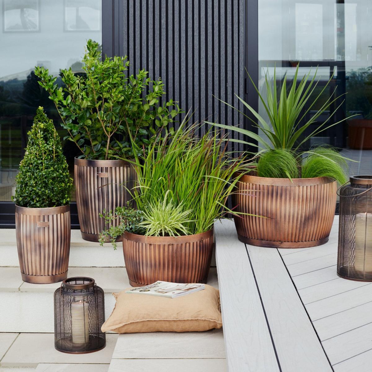I love these set of two Hampton copper planters for their timeless and versatile appeal. The warm, rich tone of the copper makes them a great addition to both contemporary and classic exteriors, working beautifully in outdoor terraces, garden patios, or even indoor sunrooms. Their ribbed texture adds visual interest without overwhelming the space, making them ideal for showcasing a variety of plants-from lush greenery to vivid flowering displays. Practical styling tips include pairing them with minimalist outdoor furniture for a modern look or using them as statement pieces amidst lush foliage for a relaxed, garden-inspired vibe. Their size variation also offers flexibility in creating layered plant arrangements or defining different zones in an outdoor setting.