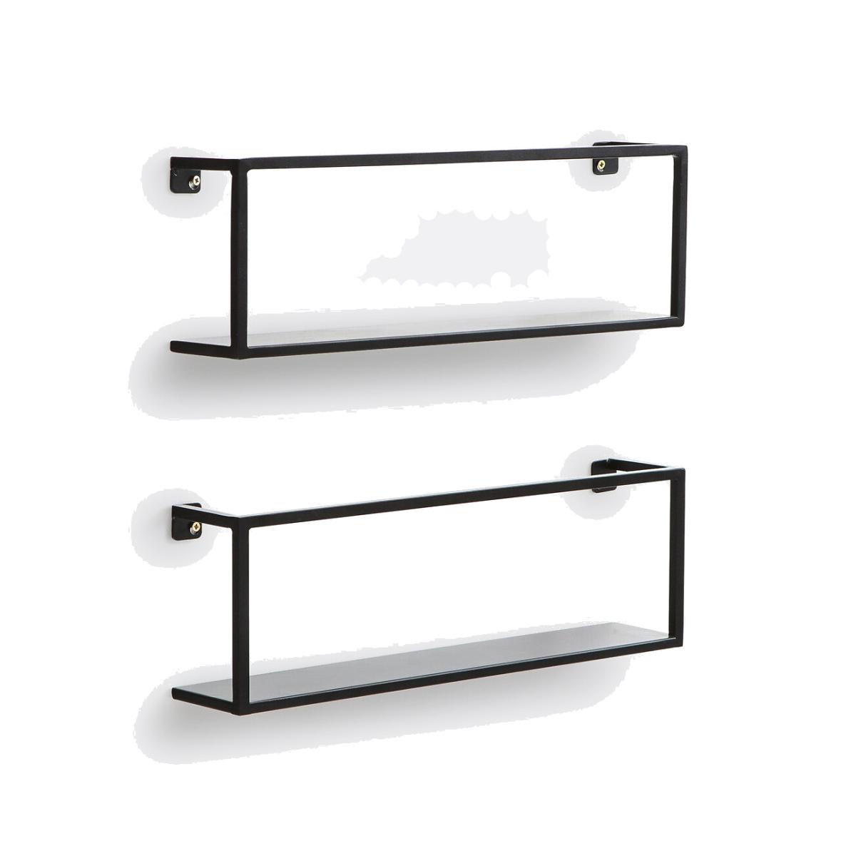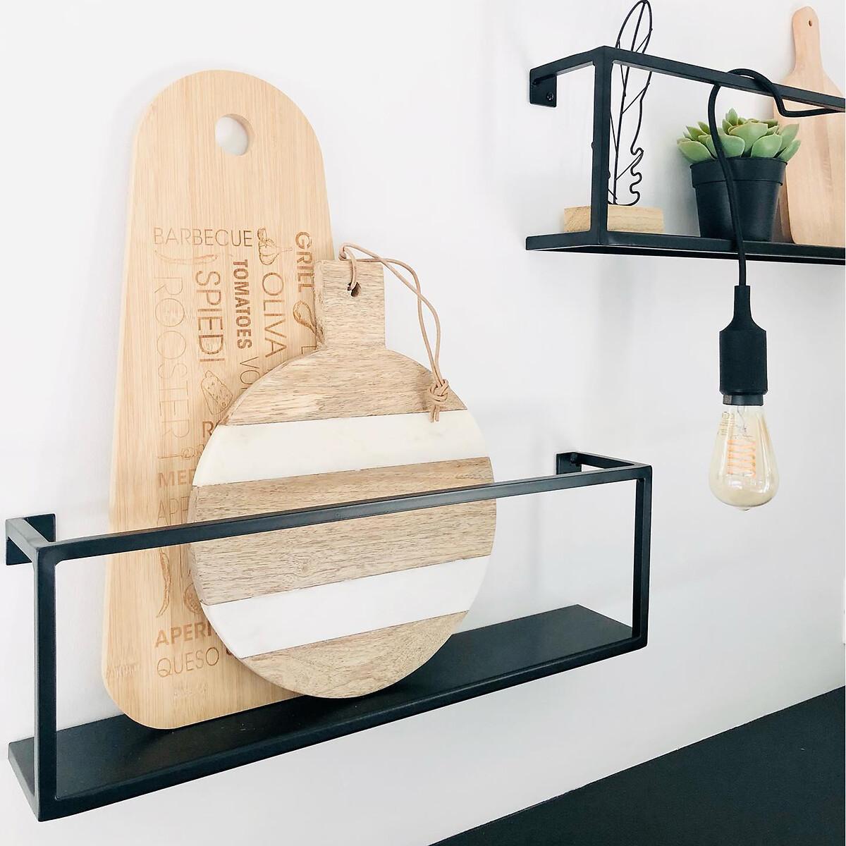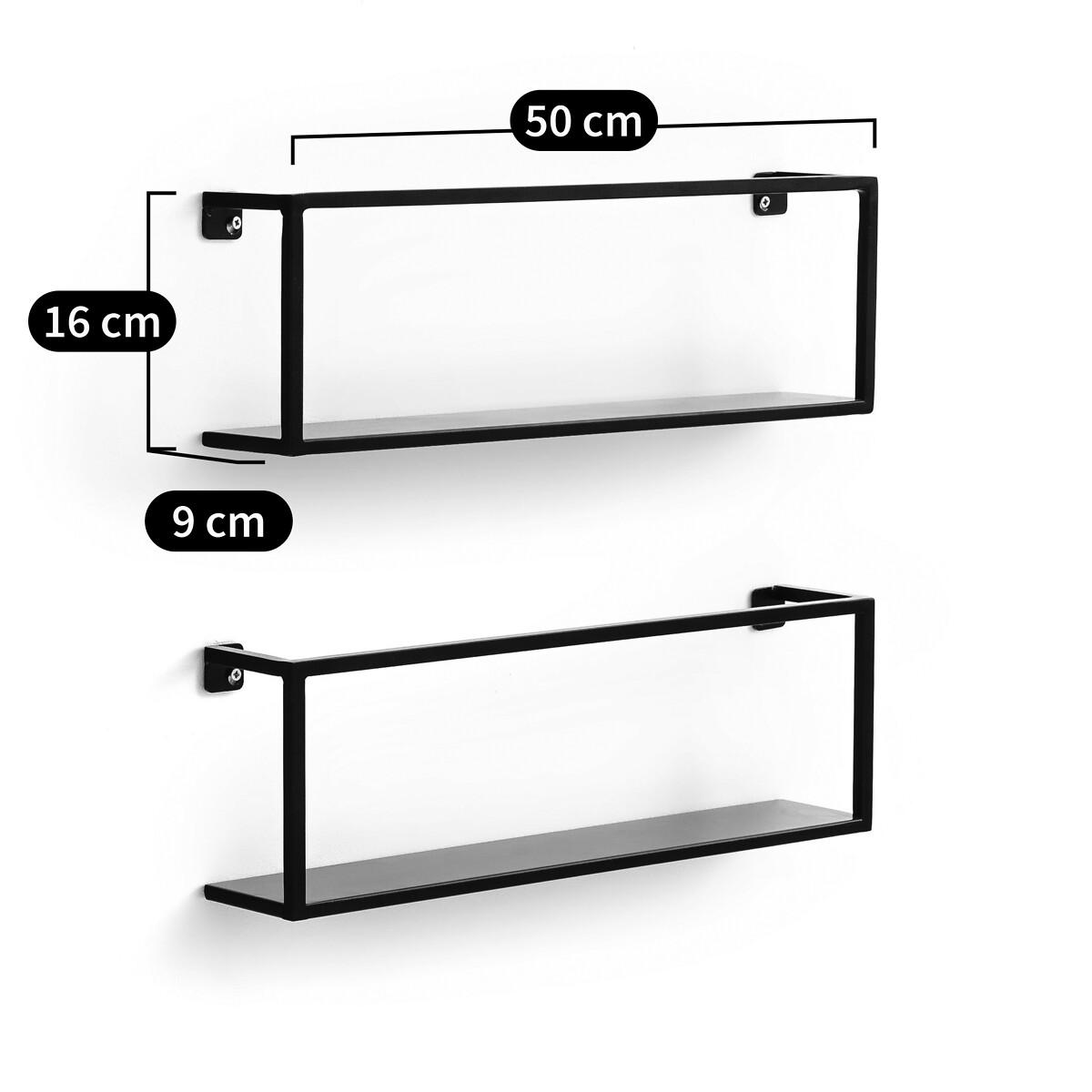 Hiba set of 2 shelves. Simple and elegant in black metal, these two wall shelves are ideal for showcasing, books, photo frames or trinkets. The neo-industrial style is brought to your home for a stylish piece of furniture. Product Details • In steel with matt black epoxy paint finish (10mm square tube) • Wall mounting (screws and plugs not included) • Supplied pre-assembled. Dimensions • Length: 50cm • Height: 16cm • Depth: 9cm. Dimensions and weight of parcel • 1 parcel • L58 x H12 x D18cm, 3kg