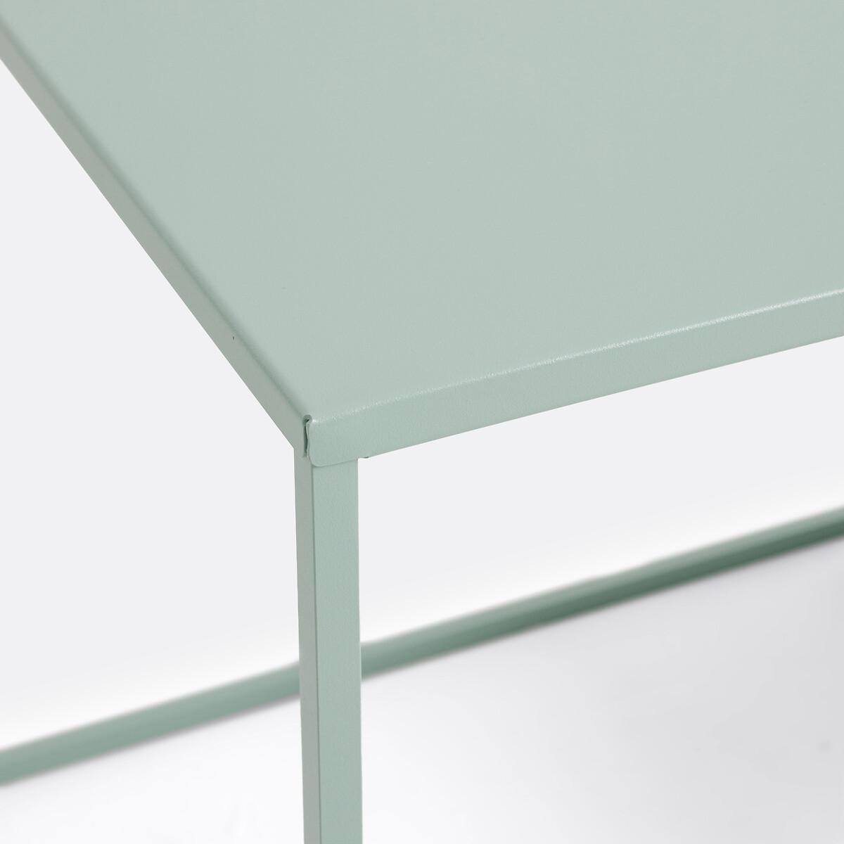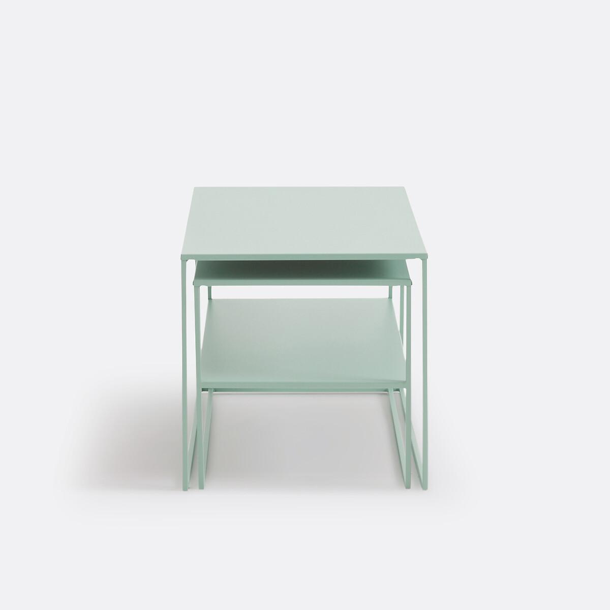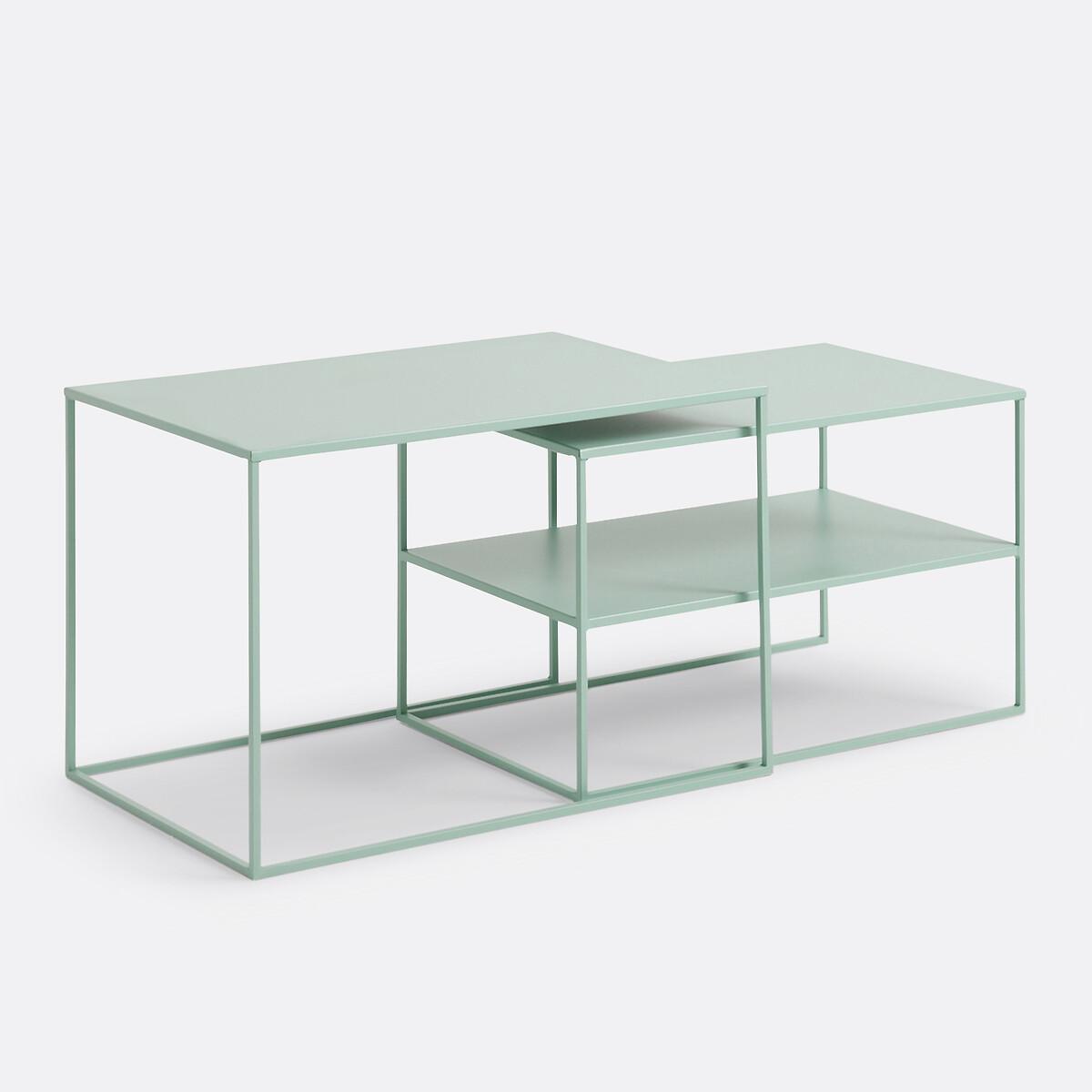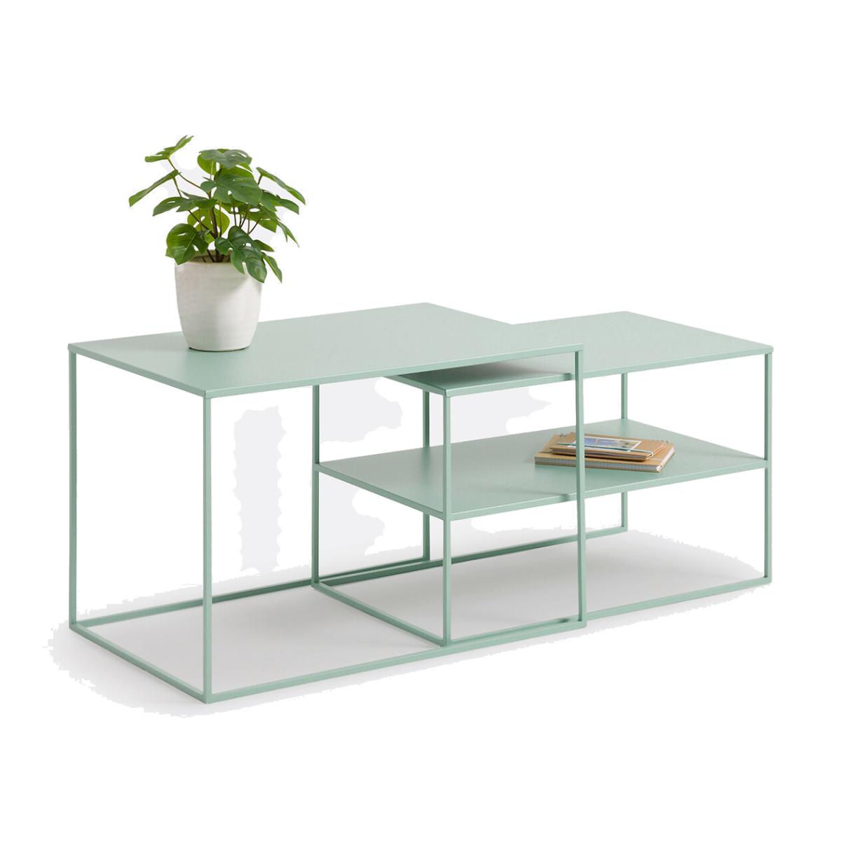 Sleek and modern. The Hiba range plays the all-metal card, available in colourful finishes. It will instantly charm you with its graphic, contemporary style. It’s up to you to invent your interior. Designed by La Redoute Interiors. Product Details • In matte Celadon blue lacquered grained steel, epoxy finish • Double layer for the smaller table • Space-saving product • Set of 2 different sizesDimensions. Large table • Width: 70cm • Height: 45cm • Depth: 45cm. Small table • Width: 68cm • Height: 40cm • Depth: 40cm • Useful height between tiers: 20cmDelivery:. Sold pre-assembled. Note! Please check that all access points are large enough to accommodate your delivery (doors, stairs, lifts).Dimensions and weight of parcel1 parcel • L76.5 x H51.5 x D51.5cm. 20kg