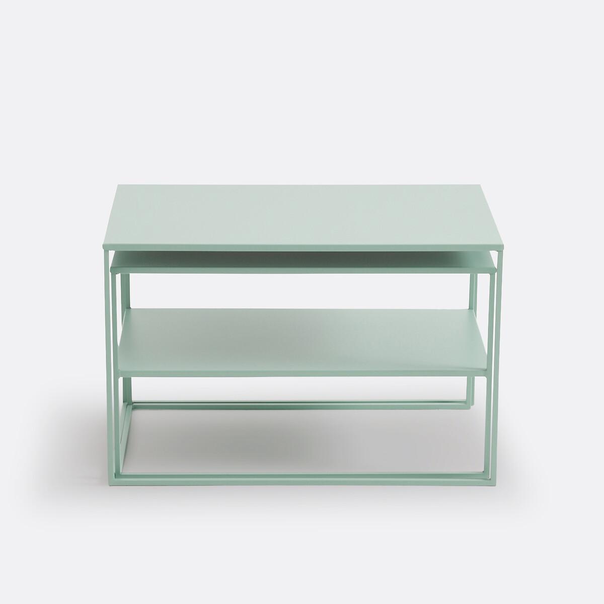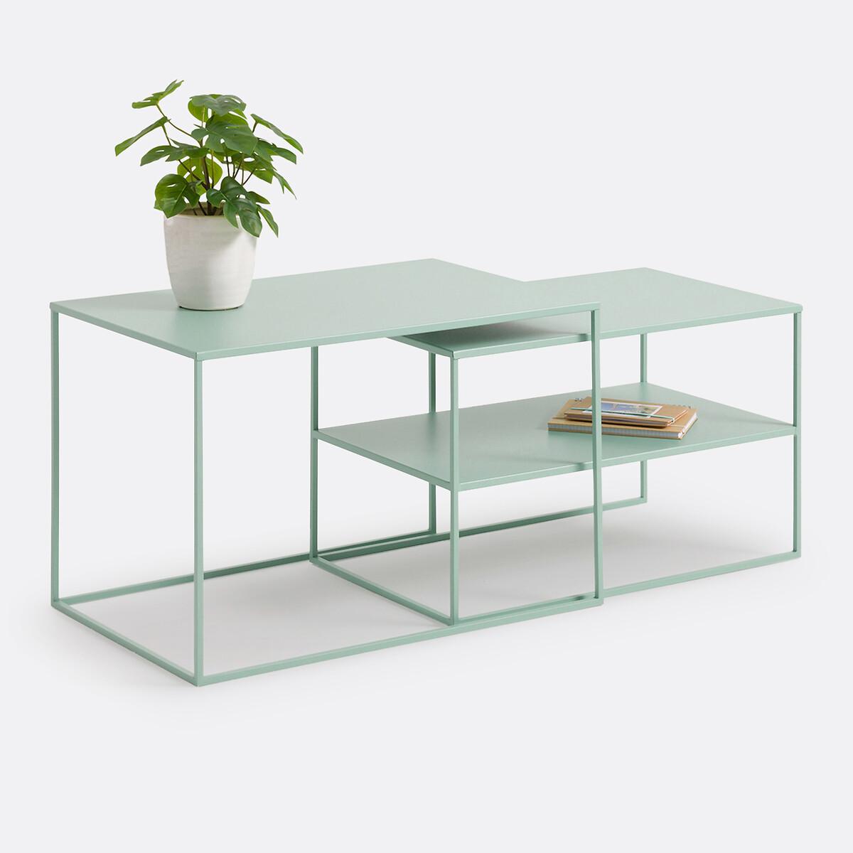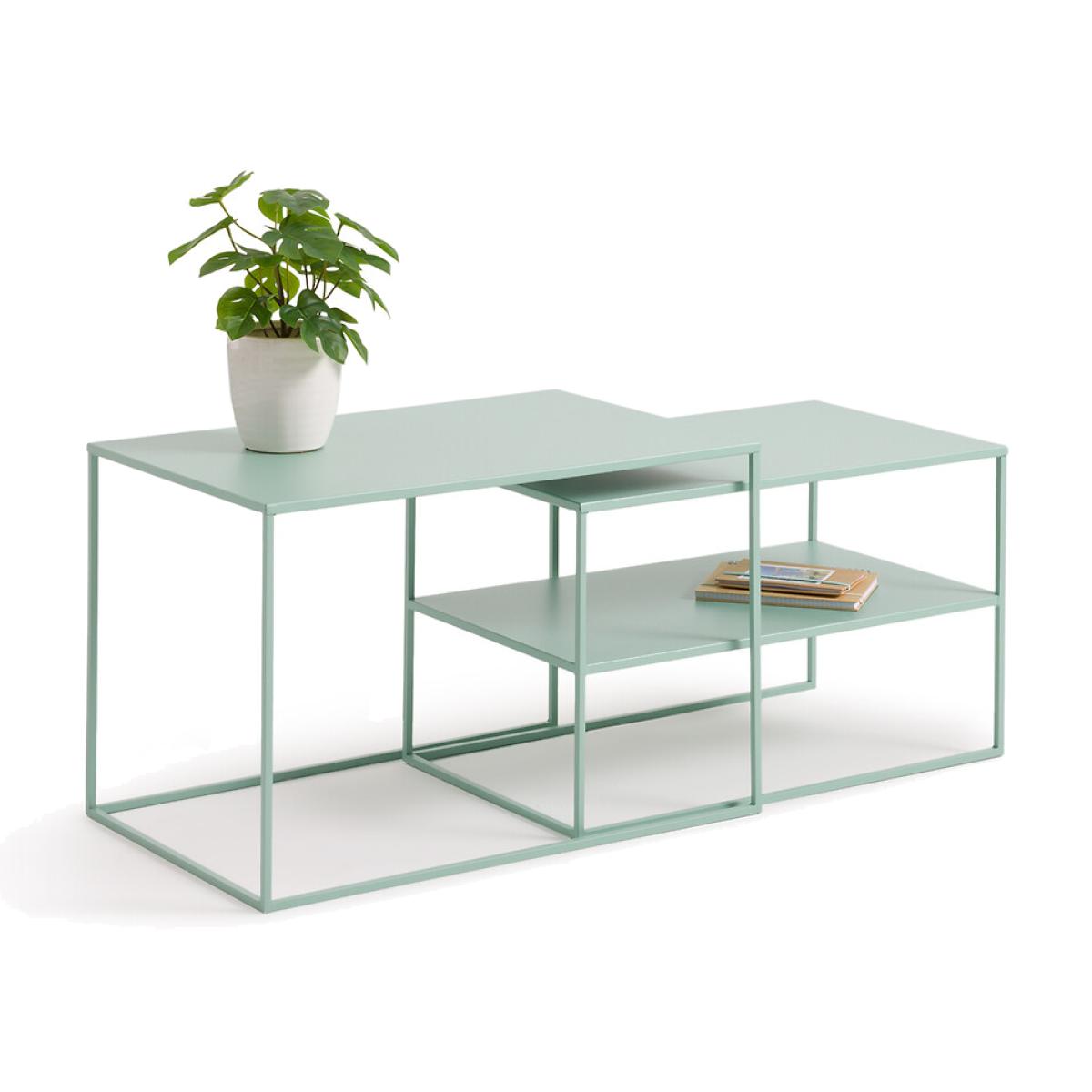 Sleek and modern. The Hiba range plays the all-metal card, available in colourful finishes. It will instantly charm you with its graphic, contemporary style. It’s up to you to invent your interior. Designed by La Redoute Interiors. Product Details • In matte Celadon blue lacquered grained steel, epoxy finish • Double layer for the smaller table • Space-saving product • Set of 2 different sizesDimensions. Large table • Width: 70cm • Height: 45cm • Depth: 45cm. Small table • Width: 68cm • Height: 40cm • Depth: 40cm • Useful height between tiers: 20cmDelivery:. Sold pre-assembled. Note! Please check that all access points are large enough to accommodate your delivery (doors, stairs, lifts).Dimensions and weight of parcel1 parcel • L76.5 x H51.5 x D51.5cm. 20kg