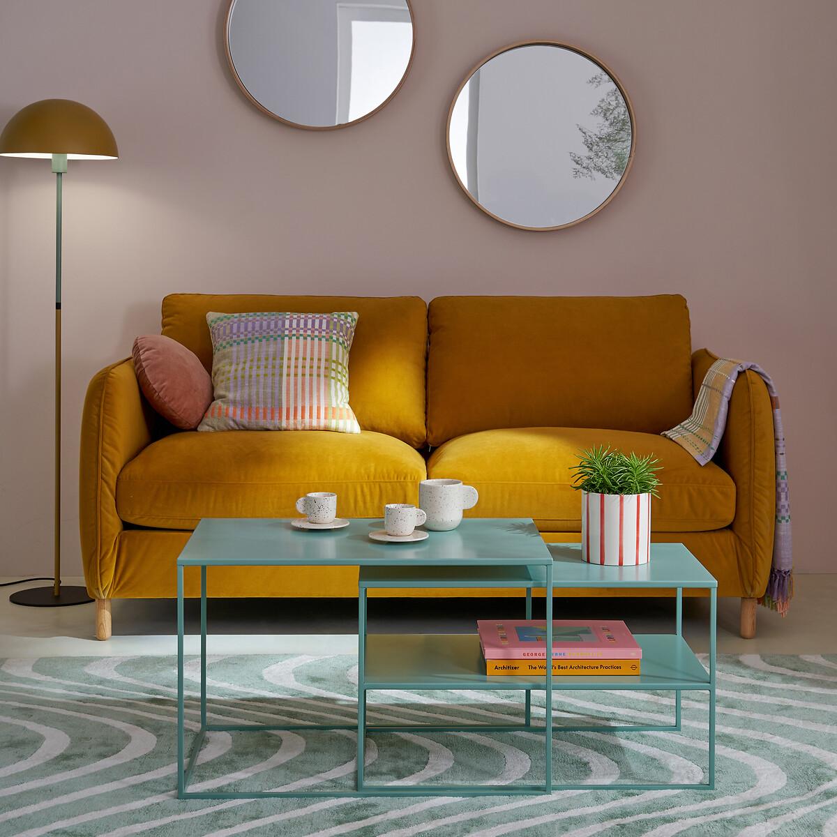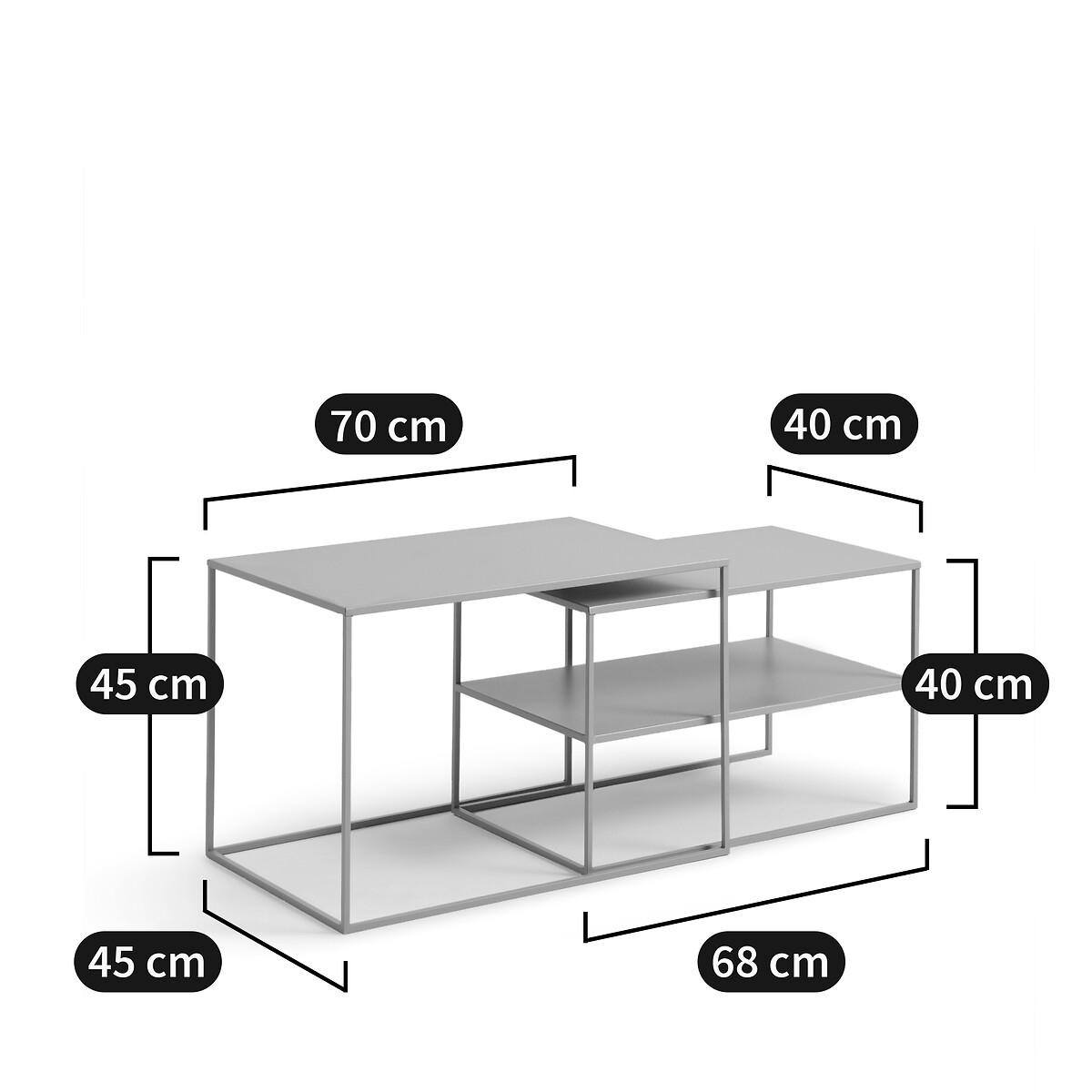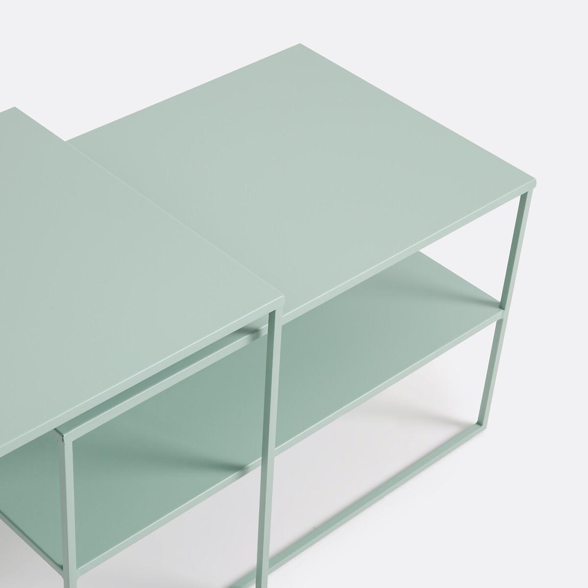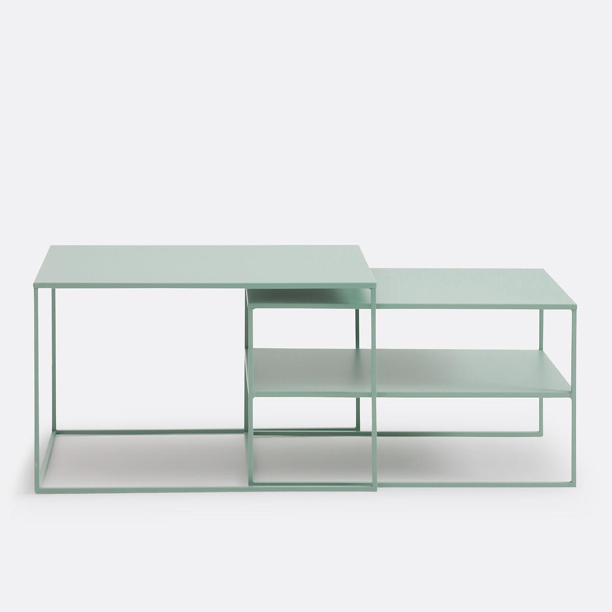 Sleek and modern. The Hiba range plays the all-metal card, available in colourful finishes. It will instantly charm you with its graphic, contemporary style. It’s up to you to invent your interior. Designed by La Redoute Interiors. Product Details • In matte Celadon blue lacquered grained steel, epoxy finish • Double layer for the smaller table • Space-saving product • Set of 2 different sizesDimensions. Large table • Width: 70cm • Height: 45cm • Depth: 45cm. Small table • Width: 68cm • Height: 40cm • Depth: 40cm • Useful height between tiers: 20cmDelivery:. Sold pre-assembled. Note! Please check that all access points are large enough to accommodate your delivery (doors, stairs, lifts).Dimensions and weight of parcel1 parcel • L76.5 x H51.5 x D51.5cm. 20kg