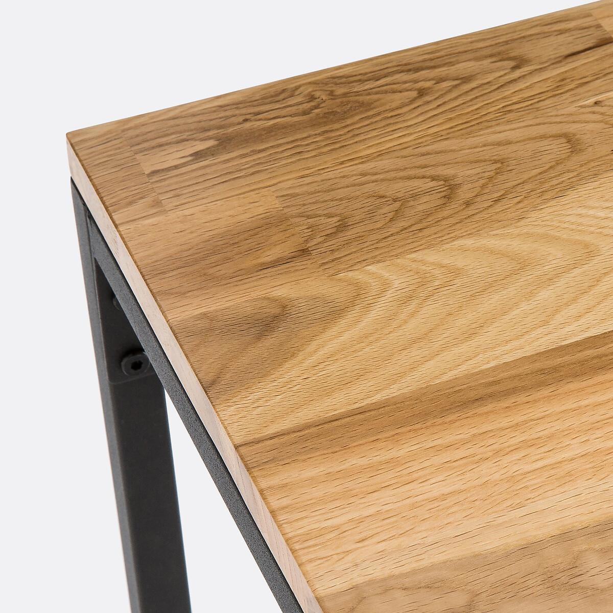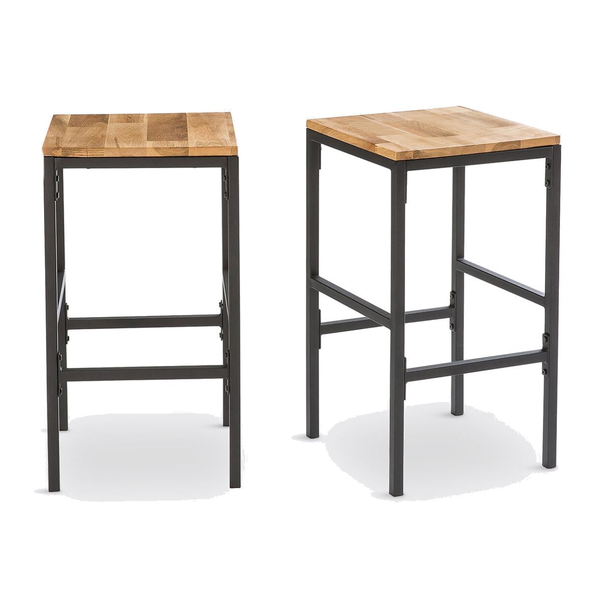 Two mid-height bar stools in solid oak. Inspired by industrial furniture, these solid oak and steel bar stools are ideal for use with tables or islands of approx 90cm high.